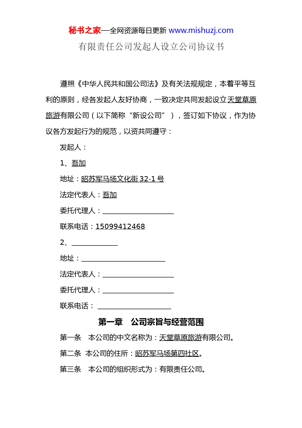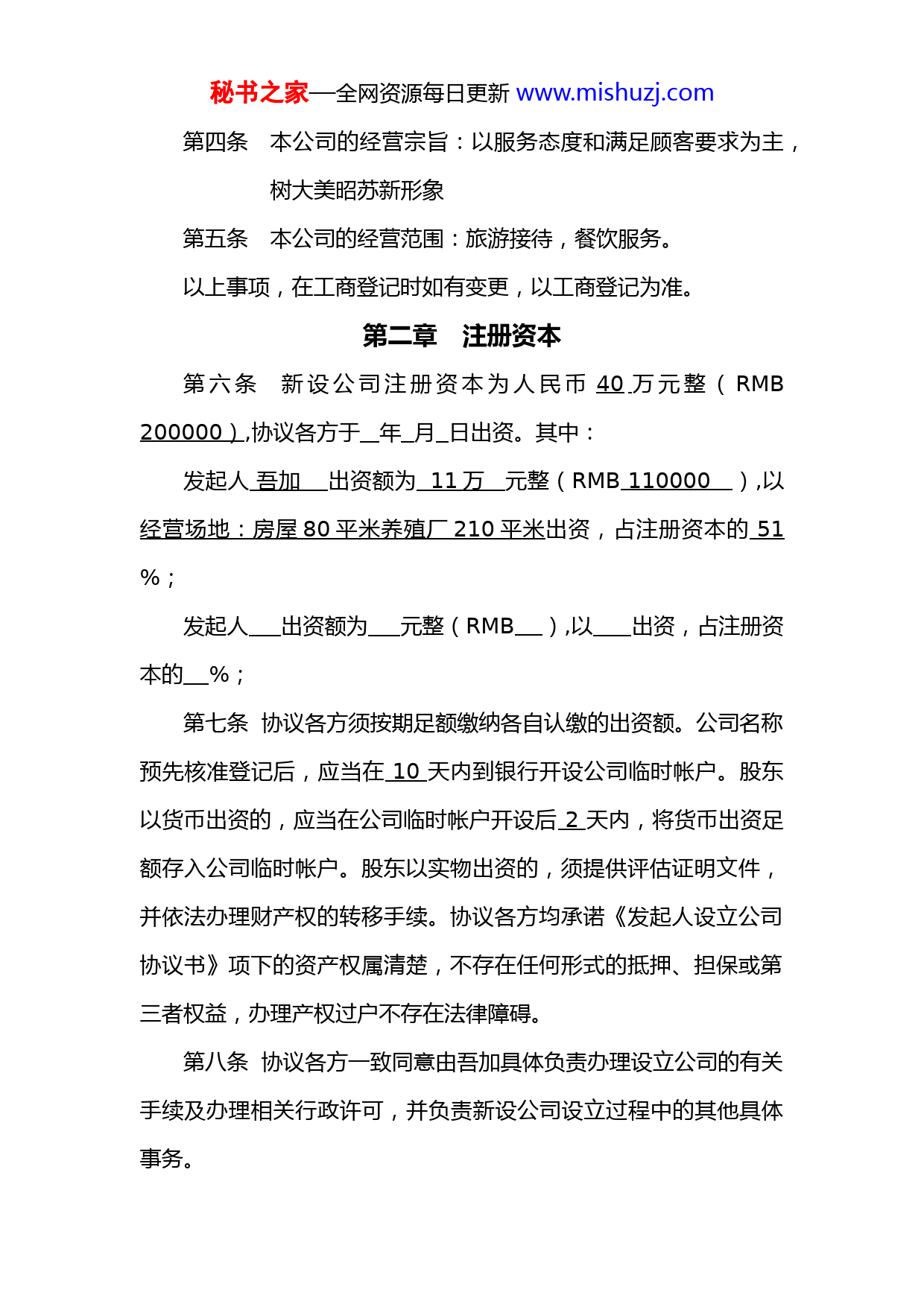 秘书之家—全网资源每日更新www.mishuzj.com有限责任公司发起人设立公司协议书遵照《中华人民共和国公司法》及有关法规规定,本着平等互利的原则,经各发起人友好协商,一致决定共同发起设立天堂草原旅游有限公司(以下简称“新设公司”),签订如下协议,作为协议各方发起行为的规范,以资共同遵守:发起人:1、吾加地址:昭苏军马场文化街32-1号法定代表人:吾加委托代理人:联系电话:150994124682、地址:法定代表人:委托代理人:联系电话:第一章公司宗旨与经营范围第一条本公司的中文名称为:天堂草原旅游有限公司。第二条本公司的住所:昭苏军马场第四社区。第三条本公司的组织形式为:有限责任公司。秘书之家—全网资源每日更新www.mishuzj.com第四条本公司的经营宗旨:以服务态度和满足顾客要求为主,树大美昭苏新形象第五条本公司的经营范围:旅游接待,餐饮服务。以上事项,在工商登记时如有变更,以工商登记为准。第六条第二章注册资本新设公司注册资本为人民币40万元整(RMB200000),协议各方于年月日出资。其中:发起人吾加出资额为11万元整(RMB110000),以经营场地:房屋80平米养殖厂210平米出资,占注册资本的51%;发起人出资额为元整(RMB),以出资,占注册资本的%;第七条协议各方须按期足额缴纳各自认缴的出资额。公司名称预先核准登记后,应当在10天内到银行开设公司临时帐户。股东以货币出资的,应当在公司临时帐户开设后2天内,将货币出资足额存入公司临时帐户。股东以实物出资的,须提供评估证明文件,并依法办理财产权的转移手续。协议各方均承诺《发起人设立公司协议书》项下的资产权属清楚,不存在任何形式的抵押、担保或第三者权益,办理产权过户不存在法律障碍。第八条协议各方一致同意由吾加具体负责办理设立公司的有关手续及办理相关行政许可,并负责新设公司设立过程中的其他具体事务。秘书之家—全网资源每日更新www.mishuzj.com第九条办理设立公司的相关费用由新设公司承担。若新设公司不能设立时,由协议各方按出资比例分别承担。第三章发起人的权利、义务与责任第十条协议各方的权利:(一)协议各方按投入新设公司的出资额占新设公司实缴资本额的比例享有所有者的资产权益。(二)协议各方按照出资比例分取红利。新设公司新增资本时,协议各方可以优先认缴出资。(三)协议各方可依法转让其在新设公司的出资。(四)如新设公司不能设立时,在承担发起人义务和责任的前提下,协议各方有权收回所认缴的出资。(五)协议各方有权对不履行、不完全履行或不适当履行出资义务的出资人和故意或过失损坏新设公司利益的出资人提起诉讼,要求其承担相应法律责任。(六)法律、行政法规所赋予的其他权利。第十一条协议各方义务(一)协议各方应当在规定的期限内足额缴纳各自所认缴的出资额。(二)协议各方以其出资额为限对新设公司承担责任。协议各方在新设公司登记后,不得抽回出资。(三)新设公司发给协议各方的出资证明书不得私自交易和抵押,仅作为公司内部分红的依据。秘书之家—全网资源每日更新www.mishuzj.com(四)法律、行政法规规定应当承担的其他义务。第十二条协议各方责任(一)在新设公司续存期间,协议各方不得与其它企业、公司或其他组织机构、个人进行相关合作,不得从事与新设公司构成同业竞争的其他业务。(二)协议各方如违反本协议,不按规定缴纳出资,应向已足额缴纳出资的出资人承担违约责任,违约方按其应出资额的20%向已足额缴纳出资的出资人支付违约金。协议各方不按规定缴纳出资导致公司不能成立的,按其应出资额的5%向其他出资人支付违约金。(三)协议各方在新设公司设立过程中,故意或过失侵害公司利益的,应向公司或其他出资人承担赔偿责任。第四章股东会、董事会、监事会第十三条股东会由5人组成,由董事会负责召集。股东会的职权按《公司法》和《公司章程》的规定行使。第十四条董事会由3人组成,设董事长一名。董事长是公司法定代表人。董事每届任期三年,任期届满,连选可以连任。(注:考虑是否需设立董事会还是执行董事即可)第十五条监事会由三名监事组成,其中方推荐监事,由职工代表民主选举产生一名。监事的任期每届为三年,监事任期届满,连选可以连任。(注:考虑是否需设立监事会)第五章协议各方的声明和保证秘书之家—全网资源每日更新www.mishuzj.com第十六条本发起人协议的签署各方作出如下声明和保证:(一)协议各方均为具有独立民事行为能力的自然人,并拥有合法的权利或授权签订本协议。(二)协议各方投入新设公司的资金,均为协议各方所拥有的合法财产。(三)协议各方向新设公司提交的文件、资料等均是真实、准确和有效的。第六章新设公司未能设立情形第十七条新设公司有下列情形之一的,可以不予设立:(一)新设公司未获得工商管理部门的批准;(二)协议各方一致决议不设立公司;(三)出资人违反出资义务,导致公司不能设立的;(四)因不可抗力事件致使公司不能设立的。第十八条新设公司不能设立时,出资人已经出资的,应予以返还。对公司不能设立负有责任的出资人,必须承担完相应法律责任的,才能获得返还的出资。第七章保密责任第十九条协议各方在合作过程中应严格保守对方的商业秘密。本处所指商业秘密包括但不限于甲乙双方在合作中所涉
