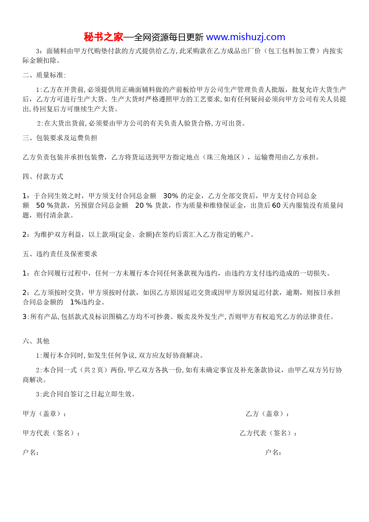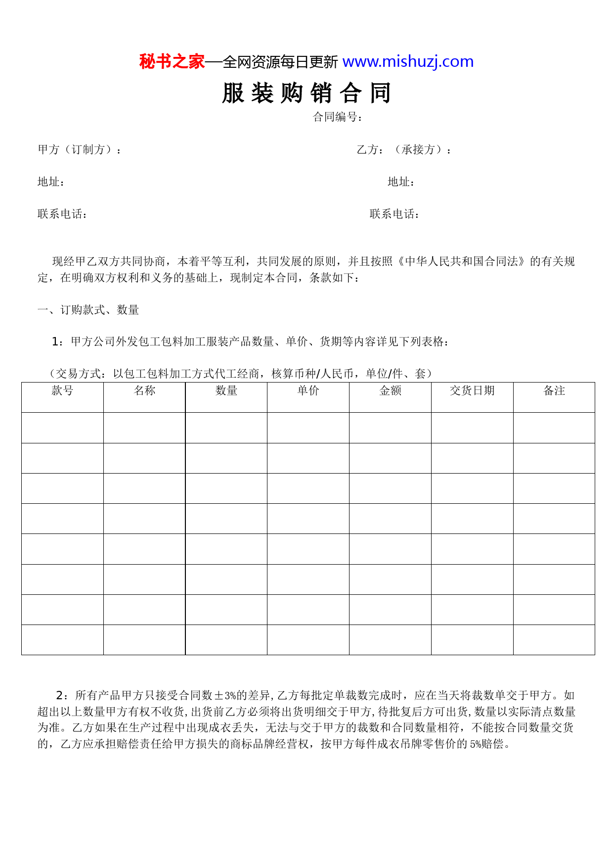 秘书之家—全网资源每日更新www.mishuzj.com服装购销合同合同编号:甲方(订制方):乙方:(承接方):地址:地址:联系电话:联系电话:现经甲乙双方共同协商,本着平等互利,共同发展的原则,并且按照《中华人民共和国合同法》的有关规定,在明确双方权利和义务的基础上,现制定本合同,条款如下:一、订购款式、数量1:甲方公司外发包工包料加工服装产品数量、单价、货期等内容详见下列表格:(交易方式:以包工包料加工方式代工经商,核算币种/人民币,单位/件、套)款号名称数量单价金额交货日期备注2:所有产品甲方只接受合同数±3%的差异,乙方每批定单裁数完成时,应在当天将裁数单交于甲方。如超出以上数量甲方有权不收货,出货前乙方必须将出货明细交于甲方,待批复后方可出货,数量以实际清点数量为准。乙方如果在生产过程中出现成衣丢失,无法与交于甲方的裁数和合同数量相符,不能按合同数量交货的,乙方应承担赔偿责任给甲方损失的商标品牌经营权,按甲方每件成衣吊牌零售价的5%赔偿。秘书之家—全网资源每日更新www.mishuzj.com3:面辅料由甲方代购垫付款的方式提供给乙方,此采购款在乙方成品出厂价(包工包料加工费)内按实际金额扣除。二、质量标准:1:乙方在开货前,必须提供用正确面辅料做的产前板给甲方公司生产管理负责人批版,批复允许大货生产后,乙方方可进行生产大货。生产大货时严格遵照甲方的工艺要求,如有任何疑问必须向甲方公司有关人员提出,待回复后方可继续生产大货。2:在大货出货前,必须要由甲方公司的有关负责人验货合格,方可出货。三、包装要求及运费负担乙方负责包装并承担包装费,乙方将货运送到甲方指定地点(珠三角地区),运输费用由乙方承担。四、付款方式1:于合同生效之时,甲方须支付合同总金额30%的定金,乙方全部交货后,甲方支付合同总金额50%货款,另预留合同总金额20%货款,作为质量和维修保证金,出货后60天内服装没有质量问题,则付清余款。2:为维护双方利益,以上款项(定金、余额)在签约后需汇入乙方指定的帐户。五、违约责任及保密要求1:在合同履行过程中,任何一方未履行本合同任何条款视为违约,由违约方支付违约造成的一切损失。2:乙方须按时交货,甲方须按时付款,如因乙方原因延迟交货或因甲方原因延迟付款,逾期,则按日承担合同总金额的1%违约金。3:所有产品,包括款式及标识图稿乙方均不可抄袭、贩卖及外发生产,否则甲方有权追究乙方的法律责任。六、其他1:履行本合同时,如发生任何争议,双方应友好协商解决。2:本合同一式(共2页)两份,甲乙双方各执一份,如有未确定事宜及补充条款协议,由甲乙双方另行协商解决。3:此合同自签订之日起立即生效。甲方(盖章):乙方(盖章):甲方代表(签名):乙方代表(签名):户名:户名:开户银行:秘书之家—全网资源每日更新www.mishuzj.com帐号:开户银行:帐号:日期:年月日日期:年月日