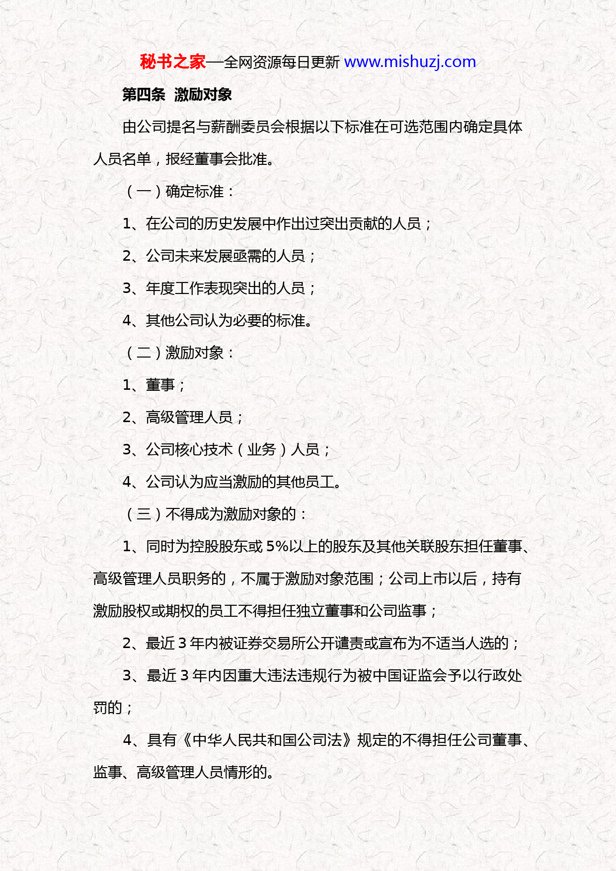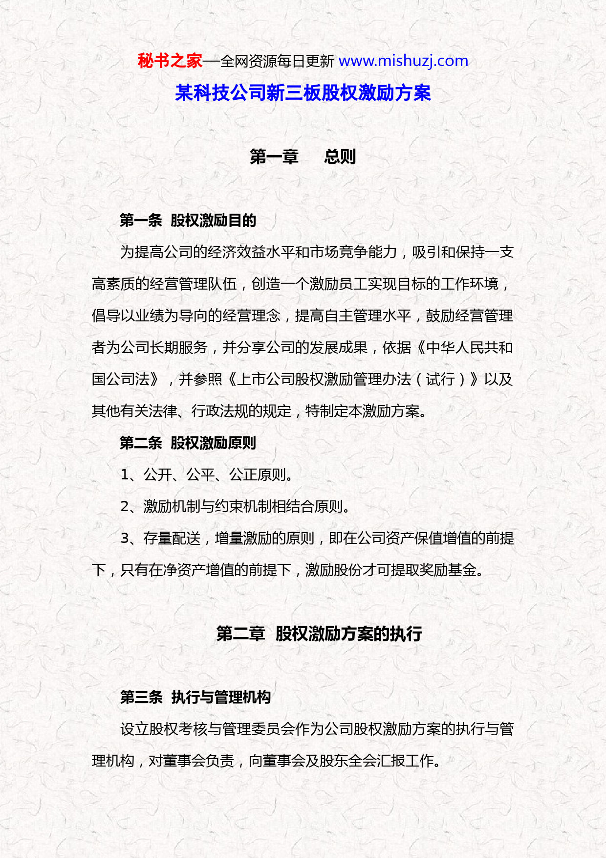 秘书之家—全网资源每日更新www.mishuzj.com某科技公司新三板股权激励方案第一章总则第一条股权激励目的为提高公司的经济效益水平和市场竞争能力,吸引和保持一支高素质的经营管理队伍,创造一个激励员工实现目标的工作环境,倡导以业绩为导向的经营理念,提高自主管理水平,鼓励经营管理者为公司长期服务,并分享公司的发展成果,依据《中华人民共和国公司法》,并参照《上市公司股权激励管理办法(试行)》以及其他有关法律、行政法规的规定,特制定本激励方案。第二条股权激励原则1、公开、公平、公正原则。2、激励机制与约束机制相结合原则。3、存量配送,增量激励的原则,即在公司资产保值增值的前提下,只有在净资产增值的前提下,激励股份才可提取奖励基金。第二章股权激励方案的执行第三条执行与管理机构设立股权考核与管理委员会作为公司股权激励方案的执行与管理机构,对董事会负责,向董事会及股东全会汇报工作。秘书之家—全网资源每日更新www.mishuzj.com第四条激励对象由公司提名与薪酬委员会根据以下标准在可选范围内确定具体人员名单,报经董事会批准。(一)确定标准:1、在公司的历史发展中作出过突出贡献的人员;2、公司未来发展亟需的人员;3、年度工作表现突出的人员;4、其他公司认为必要的标准。(二)激励对象:1、董事;2、高级管理人员;3、公司核心技术(业务)人员;4、公司认为应当激励的其他员工。(三)不得成为激励对象的:1、同时为控股股东或5%以上的股东及其他关联股东担任董事、高级管理人员职务的,不属于激励对象范围;公司上市以后,持有激励股权或期权的员工不得担任独立董事和公司监事;2、最近3年内被证券交易所公开谴责或宣布为不适当人选的;3、最近3年内因重大违法违规行为被中国证监会予以行政处罚的;4、具有《中华人民共和国公司法》规定的不得担任公司董事、监事、高级管理人员情形的。秘书之家—全网资源每日更新www.mishuzj.com第五条激励形式(一)股票期权1、股票期权是指上市公司授予激励对象在未来一定期限内以预先确定的价格和条件购买本公司一定数量股份的权利。激励对象可以其获授的股票期权在规定的期间内以预先确定的价格和条件购买上市公司一定数量的股份,也可以放弃该种权利。2、行权限制股票期权授权日与获授股票期权首次可以行权日之间的间隔不得少于1年。3、定价上市公司在授予激励对象股票期权时,应当确定行权价格或行权价格的确定方法。行权价格不应低于下列价格较高者:(1)股权激励计划草案摘要公布前一个交易日的公司标的股票收盘价;(2)股权激励计划草案摘要公布前30个交易日内的公司标的股票平均收盘价。4、授予股权期权的限制上市公司在下列期间内不得向激励对象授予股票期权:(1)定期报告公布前30日;(2)重大交易或重大事项决定过程中至该事项公告后2个交易日;(3)其他可能影响股价的重大事件发生之日起至公告后2个秘书之家—全网资源每日更新www.mishuzj.com交易日。(二)限制性股票1、限制性股票是指上市公司按照预先确定的条件授予激励对象一定数量的本公司股票,激励对象只有在工作年限或业绩目标符合股权激励计划规定条件的,才可出售限制性股票并从中获益。2、定价如果标的股票的来源是存量,即从二级市场购入股票,则按照《公司法》关于回购股票的相关规定执行;如果标的股票的来源是增量,即通过定向增发方式取得股票,其实质属于定向发行,则参照现行《上市公司证券发行管理办法》中有关定向增发的定价原则和锁定期要求确定价格和锁定期,同时考虑股权激励的激励效应。(1)发行价格不低于定价基准日前20个交易日公司股票均价的50%;(2)自股票授予日起十二个月内不得转让,激励对象为控股股东、实际控制人的,自股票授予日起三十六个月内不得转让。若低于上述标准,则需由公司在股权激励草案中充分分析和披露其对股东权益的摊薄影响,提交董事会讨论决定。3、授予股票限制:上市公司以股票市价为基准确定限制性股票授予价格的,在下列期间内不得向激励对象授予股票:(1)定期报告公布前30日;秘书之家—全网资源每日更新www.mishuzj.com(2)重大交易或重大事项决定过程中至该事项公告后2个交易日;(3)其他可能影响股价的重大事件发生之日起至公告后2个交易日。(三)股票增值权是指公司授予激励对象的一种权利,激励对象可以在规定时间内获得规定数量及一定比例的股票股价上升带来的收益,但不拥有这些股票的所有权、表决权、配股权,用于股票增资权者不参与公司分红。(四)经营者持股是指对管理层持有一定数量的本公司股票并进行一定期限的锁定。激励对象在拥有公司股票后,成为自身经营企业的股东,与企业共担风险,共享收益,拥有相应的表决权和分配权,并承担公司亏损和股票降价的风险。(五)员工持股计划是指由公司内部员工个人出资认购本公司部分股权,并委托公司进行集中管理的产权组织形式。(六)管理层收购是指公司的管理者或经理层(个人或集体)利用借贷所融资本购买本公司的股份(或股权),从而改变公司所有者结构、控制权结构和资产结构,实现持股经营。将激励主体与客体合二为一,从而实现了被激励者与企业利益、股东利益完整的统一。秘书之家—全网资源每日更新www.mishuzj.com(七)虚拟股