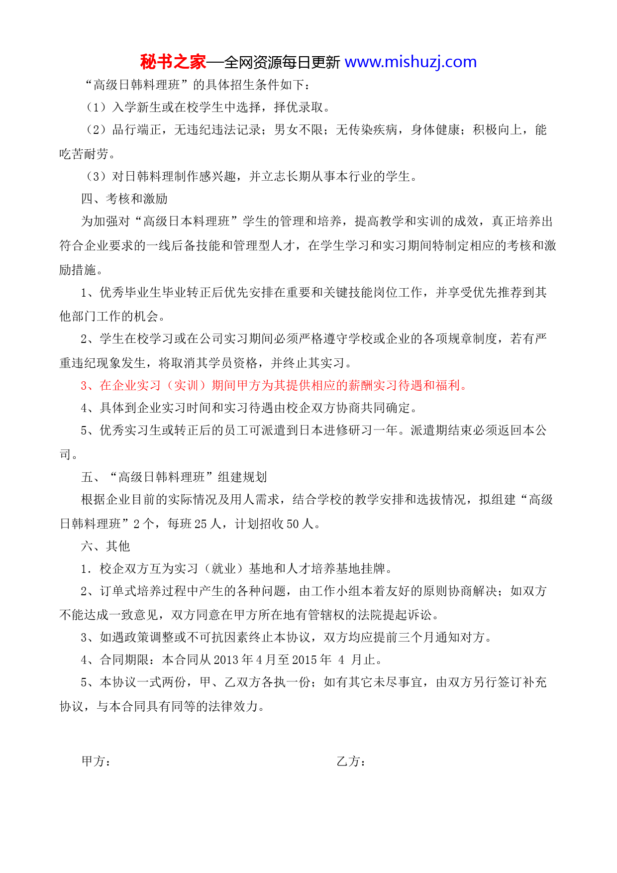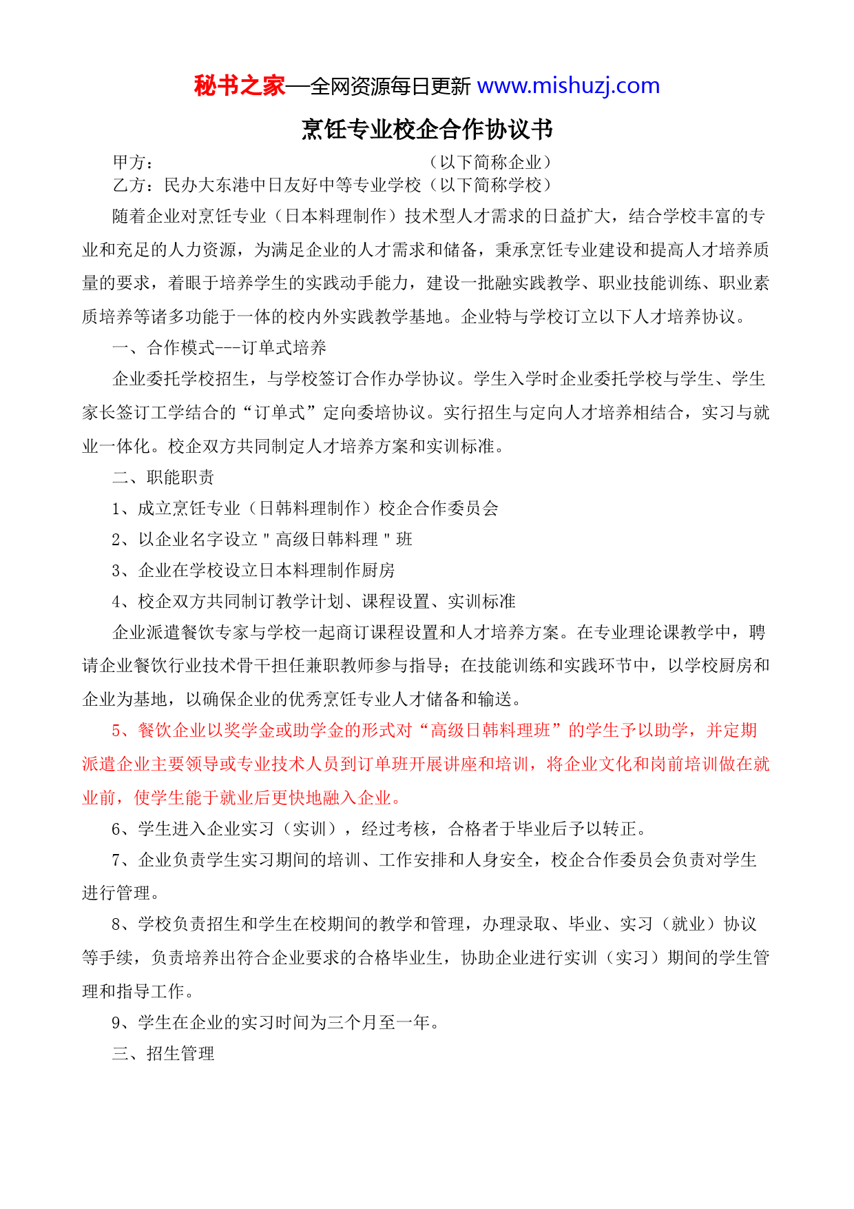 秘书之家—全网资源每日更新www.mishuzj.com烹饪专业校企合作协议书甲方:(以下简称企业)乙方:民办大东港中日友好中等专业学校(以下简称学校)随着企业对烹饪专业(日本料理制作)技术型人才需求的日益扩大,结合学校丰富的专业和充足的人力资源,为满足企业的人才需求和储备,秉承烹饪专业建设和提高人才培养质量的要求,着眼于培养学生的实践动手能力,建设一批融实践教学、职业技能训练、职业素质培养等诸多功能于一体的校内外实践教学基地。企业特与学校订立以下人才培养协议。一、合作模式---订单式培养企业委托学校招生,与学校签订合作办学协议。学生入学时企业委托学校与学生、学生家长签订工学结合的“订单式”定向委培协议。实行招生与定向人才培养相结合,实习与就业一体化。校企双方共同制定人才培养方案和实训标准。二、职能职责1、成立烹饪专业(日韩料理制作)校企合作委员会2、以企业名字设立"高级日韩料理"班3、企业在学校设立日本料理制作厨房4、校企双方共同制订教学计划、课程设置、实训标准企业派遣餐饮专家与学校一起商订课程设置和人才培养方案。在专业理论课教学中,聘请企业餐饮行业技术骨干担任兼职教师参与指导;在技能训练和实践环节中,以学校厨房和企业为基地,以确保企业的优秀烹饪专业人才储备和输送。5、餐饮企业以奖学金或助学金的形式对“高级日韩料理班”的学生予以助学,并定期派遣企业主要领导或专业技术人员到订单班开展讲座和培训,将企业文化和岗前培训做在就业前,使学生能于就业后更快地融入企业。6、学生进入企业实习(实训),经过考核,合格者于毕业后予以转正。7、企业负责学生实习期间的培训、工作安排和人身安全,校企合作委员会负责对学生进行管理。8、学校负责招生和学生在校期间的教学和管理,办理录取、毕业、实习(就业)协议等手续,负责培养出符合企业要求的合格毕业生,协助企业进行实训(实习)期间的学生管理和指导工作。9、学生在企业的实习时间为三个月至一年。三、招生管理秘书之家—全网资源每日更新www.mishuzj.com“高级日韩料理班”的具体招生条件如下:(1)入学新生或在校学生中选择,择优录取。(2)品行端正,无违纪违法记录;男女不限;无传染疾病,身体健康;积极向上,能吃苦耐劳。(3)对日韩料理制作感兴趣,并立志长期从事本行业的学生。四、考核和激励为加强对“高级日本料理班”学生的管理和培养,提高教学和实训的成效,真正培养出符合企业要求的一线后备技能和管理型人才,在学生学习和实习期间特制定相应的考核和激励措施。1、优秀毕业生毕业转正后优先安排在重要和关键技能岗位工作,并享受优先推荐到其他部门工作的机会。2、学生在校学习或在公司实习期间必须严格遵守学校或企业的各项规章制度,若有严重违纪现象发生,将取消其学员资格,并终止其实习。3、在企业实习(实训)期间甲方为其提供相应的薪酬实习待遇和福利。4、具体到企业实习时间和实习待遇由校企双方协商共同确定。5、优秀实习生或转正后的员工可派遣到日本进修研习一年。派遣期结束必须返回本公司。五、“高级日韩料理班”组建规划根据企业目前的实际情况及用人需求,结合学校的教学安排和选拔情况,拟组建“高级日韩料理班”2个,每班25人,计划招收50人。六、其他1.校企双方互为实习(就业)基地和人才培养基地挂牌。2、订单式培养过程中产生的各种问题,由工作小组本着友好的原则协商解决;如双方不能达成一致意见,双方同意在甲方所在地有管辖权的法院提起诉讼。3、如遇政策调整或不可抗因素终止本协议,双方均应提前三个月通知对方。4、合同期限:本合同从2013年4月至2015年4月止。5、本协议一式两份,甲、乙双方各执一份;如有其它未尽事宜,由双方另行签订补充协议,与本合同具有同等的法律效力。甲方:乙方:秘书之家—全网资源每日更新www.mishuzj.com年月日年月日