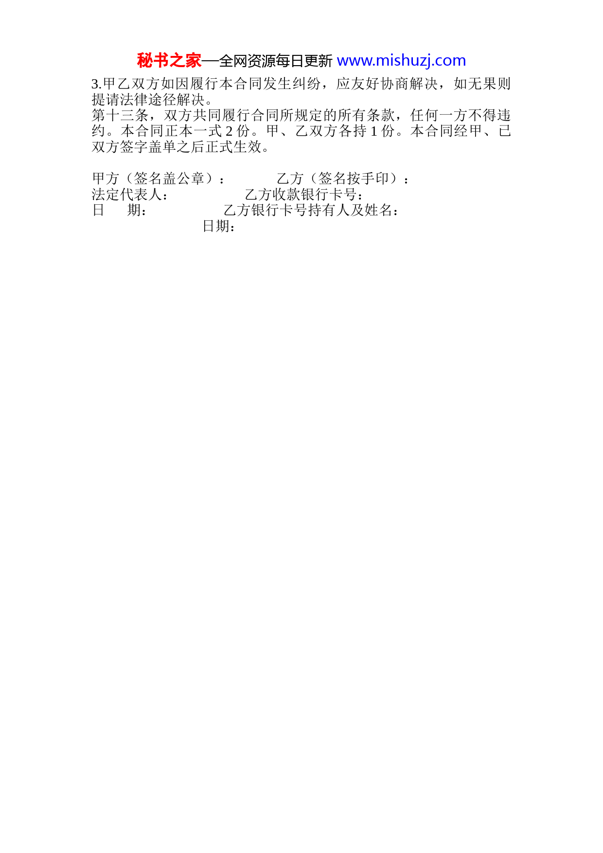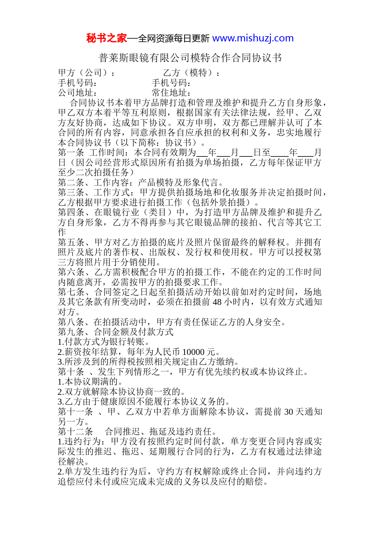 秘书之家—全网资源每日更新www.mishuzj.com普莱斯眼镜有限公司模特合作合同协议书甲方(公司):乙方(模特):手机号码:手机号码:公司地址:常住地址:合同协议书本着甲方品牌打造和管理及维护和提升乙方自身形象,甲乙双方本着平等互利原则,根据国家有关法律法规,经甲、乙双方友好协商,达成如下协议。双方申明,双方都已理解并认可了本合同的所有内容,同意承担各自应承担的权利和义务,忠实地履行本合同协议书(以下简称:协议书)。第一条工作时间:本合同有效期为年月日至年月日(因公司经营形式原因所有拍摄为单场拍摄,乙方每年保证甲方至少二次拍摄任务)第二条、工作内容:产品模特及形象代言。第三条、工作方式:甲方提供拍摄场地和化妆服务并决定拍摄时间,乙方根据甲方要求进行拍摄工作(包括外景拍摄)。第四条、在眼镜行业(类目)中,为打造甲方品牌及维护和提升乙方自身形象,乙方不得再参与其它眼镜品牌的接拍、代言等其它工作第五条、甲方对乙方拍摄的底片及照片保留最终的解释权。并拥有照片及底片的著作权、出版权、发行权和使用权。甲方可以授权第三方将照片用于分销使用。第六条、乙方需积极配合甲方的拍摄工作,不能在约定的工作时间内随意离开,必需按甲方的拍摄要求工作。第七条、合同签定之日起至拍摄活动开始以前如对约定时间,场地及其它条款有所变动时,必须在拍摄前48小时内,以有效方式通知对方。第八条、在拍摄活动中,甲方有责任保证乙方的人身安全。第九条、合同金额及付款方式1.付款方式为银行转账。2.薪资按年结算,每年为人民币10000元。3.所涉及到的所得税按照相关规定由乙方缴纳。第十条、发生下列情形之一,甲方有优先续约权或本协议终止。1.本协议期满的。2.双方就解除本协议协商一致的。3.乙方由于健康原因不能履行本协议义务的。第十一条、甲、乙双方中若单方面解除本协议,需提前30天通知另一方。第十二条合同推迟、拖延及违约责任。1.违约行为:甲方没有按照约定时间付款,单方变更合同内容或实际发生的推迟、拖迟、延期履行合同的行为,乙方有权通过法律途径解决。2.单方发生违约行为后,守约方有权解除或终止合同,并向违约方追偿应付未付或应完成未完成的义务以及应付的赔偿。秘书之家—全网资源每日更新www.mishuzj.com3.甲乙双方如因履行本合同发生纠纷,应友好协商解决,如无果则提请法律途径解决。第十三条,双方共同履行合同所规定的所有条款,任何一方不得违约。本合同正本一式2份。甲、乙双方各持1份。本合同经甲、已双方签字盖单之后正式生效。甲方(签名盖公章):乙方(签名按手印):法定代表人:乙方收款银行卡号:日期:乙方银行卡号持有人及姓名:日期: