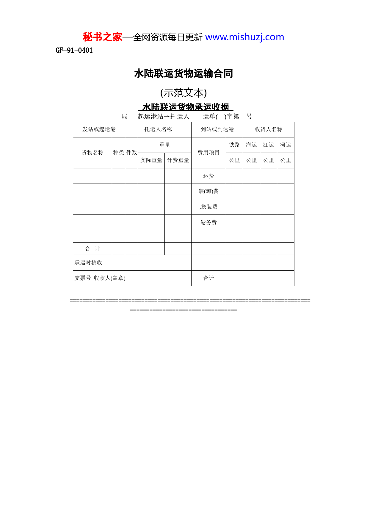 秘书之家—全网资源每日更新www.mishuzj.comGF-91-0401水陆联运货物运输合同局(示范文本)号发站或起运港水陆联运货物承运收据收货人名称起运港站→托运人运单()字第托运人名称到站或到达港货物名称重量费用项目铁路海运江运河运种类件数公里公里公里公里实际重量计费重量运费装(卸)费,换装费港务费合计承运时核收支票号收款人(盖章)合计===========================================================================================================