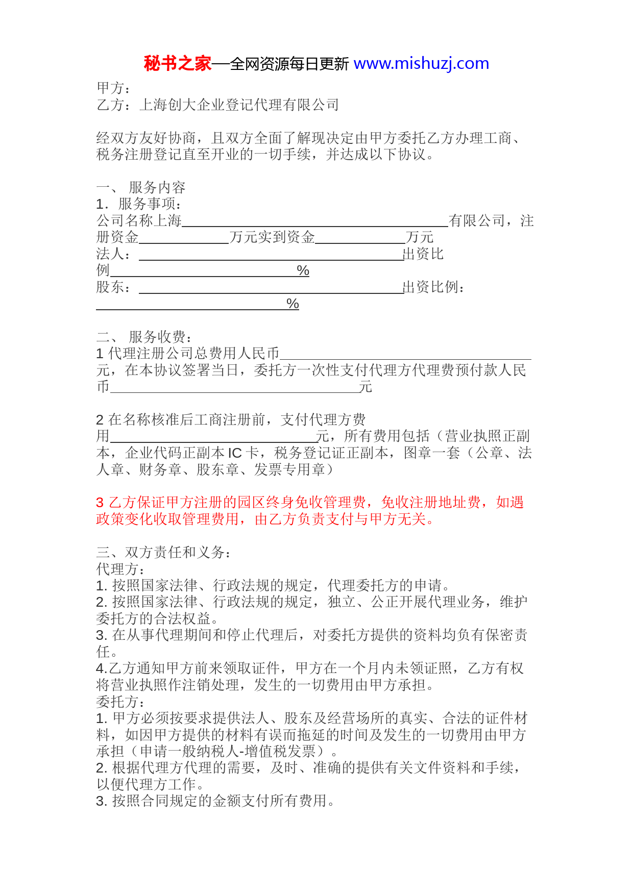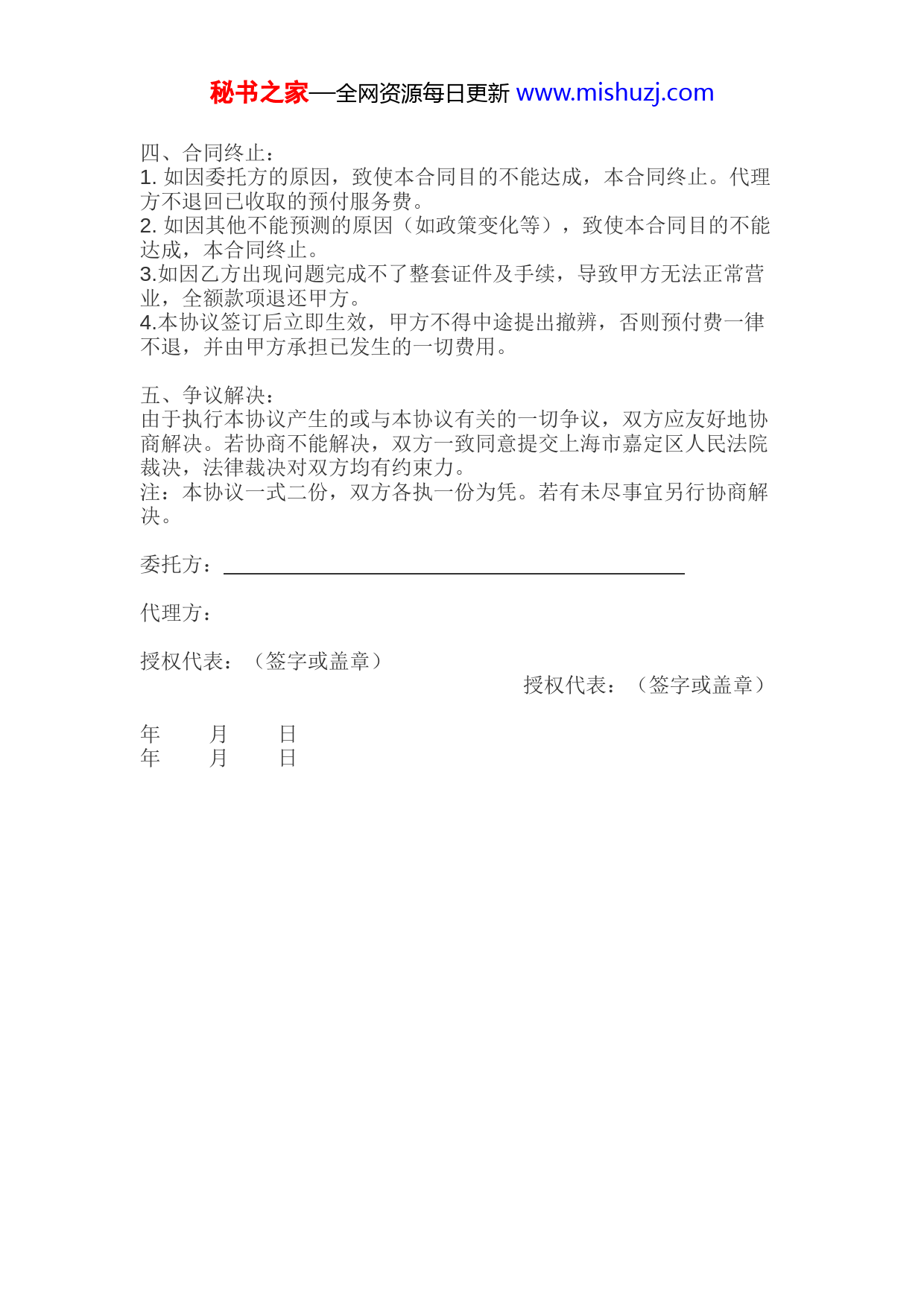 秘书之家—全网资源每日更新www.mishuzj.com甲方:乙方:上海创大企业登记代理有限公司经双方友好协商,且双方全面了解现决定由甲方委托乙方办理工商、税务注册登记直至开业的一切手续,并达成以下协议。一、服务内容万元实到资金有限公司,注1.服务事项:%万元公司名称上海出资比册资金%法人:出资比例:例股东:二、服务收费:1代理注册公司总费用人民币元,在本协议签署当日,委托方一次性支付代理方代理费预付款人民币元2在名称核准后工商注册前,支付代理方费用元,所有费用包括(营业执照正副本,企业代码正副本IC卡,税务登记证正副本,图章一套(公章、法人章、财务章、股东章、发票专用章)3乙方保证甲方注册的园区终身免收管理费,免收注册地址费,如遇政策变化收取管理费用,由乙方负责支付与甲方无关。三、双方责任和义务:代理方:1.按照国家法律、行政法规的规定,代理委托方的申请。2.按照国家法律、行政法规的规定,独立、公正开展代理业务,维护委托方的合法权益。3.在从事代理期间和停止代理后,对委托方提供的资料均负有保密责任。4.乙方通知甲方前来领取证件,甲方在一个月内未领证照,乙方有权将营业执照作注销处理,发生的一切费用由甲方承担。委托方:1.甲方必须按要求提供法人、股东及经营场所的真实、合法的证件材料,如因甲方提供的材料有误而拖延的时间及发生的一切费用由甲方承担(申请一般纳税人-增值税发票)。2.根据代理方代理的需要,及时、准确的提供有关文件资料和手续,以便代理方工作。3.按照合同规定的金额支付所有费用。秘书之家—全网资源每日更新www.mishuzj.com四、合同终止:1.如因委托方的原因,致使本合同目的不能达成,本合同终止。代理方不退回已收取的预付服务费。2.如因其他不能预测的原因(如政策变化等),致使本合同目的不能达成,本合同终止。3.如因乙方出现问题完成不了整套证件及手续,导致甲方无法正常营业,全额款项退还甲方。4.本协议签订后立即生效,甲方不得中途提出撤辨,否则预付费一律不退,并由甲方承担已发生的一切费用。五、争议解决:由于执行本协议产生的或与本协议有关的一切争议,双方应友好地协商解决。若协商不能解决,双方一致同意提交上海市嘉定区人民法院裁决,法律裁决对双方均有约束力。注:本协议一式二份,双方各执一份为凭。若有未尽事宜另行协商解决。委托方:代理方:授权代表:(签字或盖章)授权代表:(签字或盖章)年月日年月日