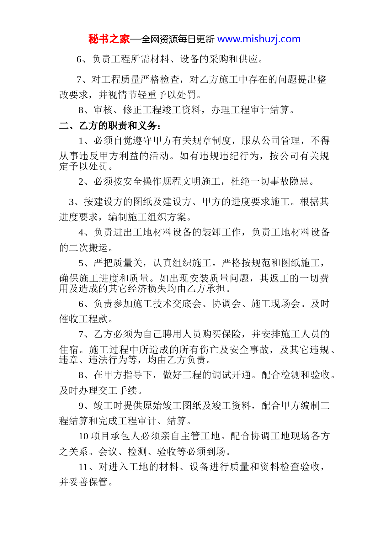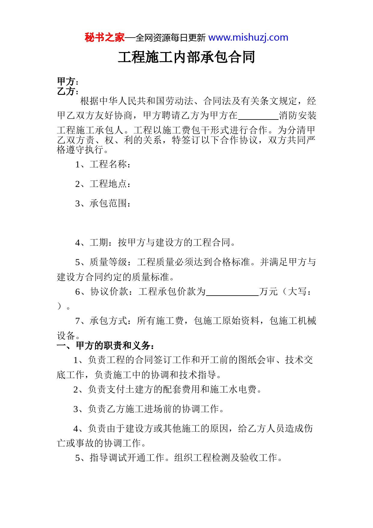 秘书之家—全网资源每日更新www.mishuzj.com工程施工内部承包合同甲方:乙方:根据中华人民共和国劳动法、合同法及有关条文规定,经甲乙双方友好协商,甲方聘请乙方为甲方在消防安装工程施工承包人。工程以施工费包干形式进行合作。为分清甲乙双方责、权、利的关系,特签订以下合作协议,双方共同严格遵守执行。1、工程名称:2、工程地点:3、承包范围:4、工期:按甲方与建设方的工程合同。5、质量等级:工程质量必须达到合格标准。并满足甲方与建设方合同约定的质量标准。6、协议价款:工程承包价款为万元(大写:)。7、承包方式:所有施工费,包施工原始资料,包施工机械设备。一、甲方的职责和义务:1、负责工程的合同签订工作和开工前的图纸会审、技术交底工作,负责施工中的协调和技术指导。2、负责支付土建方的配套费用和施工水电费。3、负责乙方施工进场前的协调工作。4、负责由于建设方或其他施工的原因,给乙方人员造成伤亡或事故的协调工作。5、指导调试开通工作。组织工程检测及验收工作。秘书之家—全网资源每日更新www.mishuzj.com6、负责工程所需材料、设备的采购和供应。7、对工程质量严格检查,对乙方施工中存在的问题提出整改要求,并视情节轻重予以处罚。8、审核、修正工程竣工资料,办理工程审计结算。二、乙方的职责和义务:1、必须自觉遵守甲方有关规章制度,服从公司管理,不得从事违反甲方利益的活动。如有违规违纪行为,按公司有关规定予以处罚。2、必须按安全操作规程文明施工,杜绝一切事故隐患。3、按建设方的图纸及建设方、甲方的进度要求施工。根据其进度要求,编制施工组织方案。4、负责进出工地材料设备的装卸工作,负责工地材料设备的二次搬运。5、严把质量关,认真组织施工。严格按规范和图纸施工,确保施工进度和质量。如出现安装质量问题,其返工的一切费用及造成的其它经济损失均由乙方承担。6、负责参加施工技术交底会、协调会、施工现场会。及时催收工程款。7、乙方必须为自己聘用人员购买保险,并安排施工人员的住宿。施工过程中所造成的所有伤亡及安全事故,及其它违规、违章、违法行为等,均由乙方负责。8、在甲方指导下,做好工程的调试开通。配合检测和验收。及时办理交工手续。9、竣工时提供原始竣工图纸及竣工资料,配合甲方编制工程结算和完成工程审计、结算。10项目承包人必须亲自主管工地。配合协调工地现场各方之关系。会议、检测、验收等必须到场。11、对进入工地的材料、设备进行质量和资料检查验收,并妥善保管。秘书之家—全网资源每日更新www.mishuzj.com12、在每月28日前按月及时真实的向公司呈报项目进度报表及下月施工计划。工程进度以前月26日零时至当月25日24时完成的工程量为准。13、保证项目施工质量并能一次性通过检测中心的检测及消防验收。14、负责保修期内的维修任务(保修时间以甲方与建设方所签合同中所规定的保修期为准,材料、设备由甲方提供)。三、付款方式:1、乙方每月28日前向甲方提交经甲方和监理审核的月进度报表。2、甲方按审核后的月进度报表的定额人工的80%在次月五日前支付乙方费用。3、甲方按协议付款至协议总价款的80%时即暂停支付乙方款项。4、工程经消防检测中心检测和消防部门验收合格后二个月内甲方支付至施工费的90%。5、甲方与业主结算完毕,业主支付甲方的工程款达到业主与甲方合同总额的95%后,甲方在一月内向乙方支付至协议价款的95%。6、余额5%作为保修金,按甲方与业主合同约定的方式和条件支付。四、合同价款及调整:1、本合同为包干价。在项目实施过程中,现场实际工程量累计增减5万元内(含5万元),视为协议包干范围内变更,双方不调整协议价款。2、累计变更工程量超过5万元后,甲方按业主认可的签证,按相应工程量的12%调整双方协议价款,(纯点工签证的70%归乙方)。如项目变更人工用量过多,双方按实协商。3、所有的调整后的合同价款均待甲方与业主结算完成后进行计算和支付。五、双方约定:1、乙方在现场施工中必须接受甲方或甲方指定的管理人员的管理和指挥。发生争执时,也必须保证现场正常的和必须的施工,否则甲方有权对乙方进行处罚直至要求乙方无条件退场。秘书之家—全网资源每日更新www.mishuzj.com2、现场材料的节约使用及现场保管,均由乙方负责(材料员由甲方指派,乙方负责管理)。设备材料如有遗失和损坏,必须照价赔偿。施工过程中造成不正当损耗和材料消耗超过限额部分由乙方承担。3、甲方应保证工程材料和设备的及时供应。4、施工过程中乙方整理好各类施工资料,向甲方提供工程验收所必备的资料,并协助甲方办理工程结算。5、施工中所需要的设备、工具及相关消耗用品均由乙方自备,甲方一概不予提供。6、如遇施工变更,乙方应及时办理相关签证手续,并把相关情况通知甲方。7、乙方人员配备不齐,施工质量低劣及不服甲方调度等,甲方可中途辞退乙方,另请其它安装队伍。辞退时的施工费用按已完工程量扣除罚款后按实结算。8、未经甲方同意,乙方不得自行停工(包括节假日、农忙等季节),否则将予以处罚,直至更换施工队伍。9、甲方如派驻专职材料员,乙方负责材料员工资的20%。10、协议中未包括的施工内容,经双方协商后可以签订补充协议。六、违