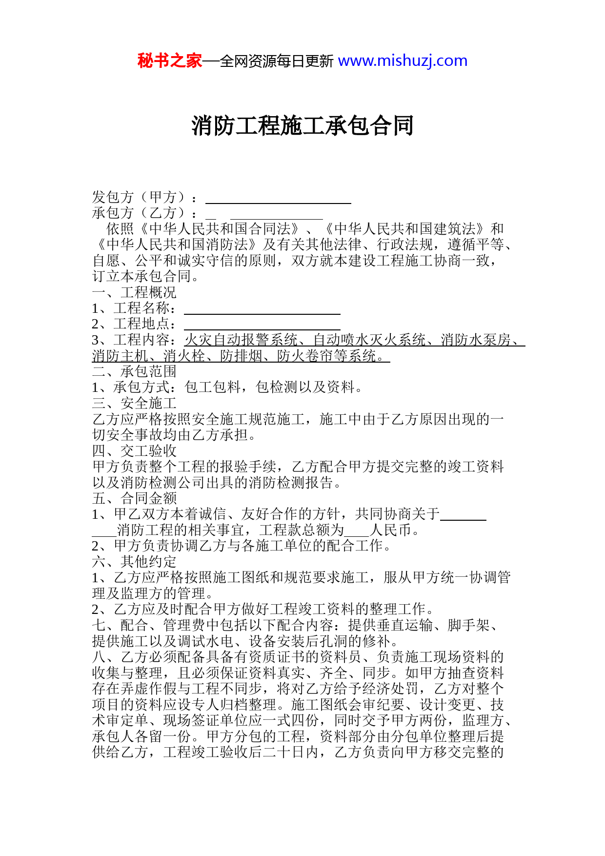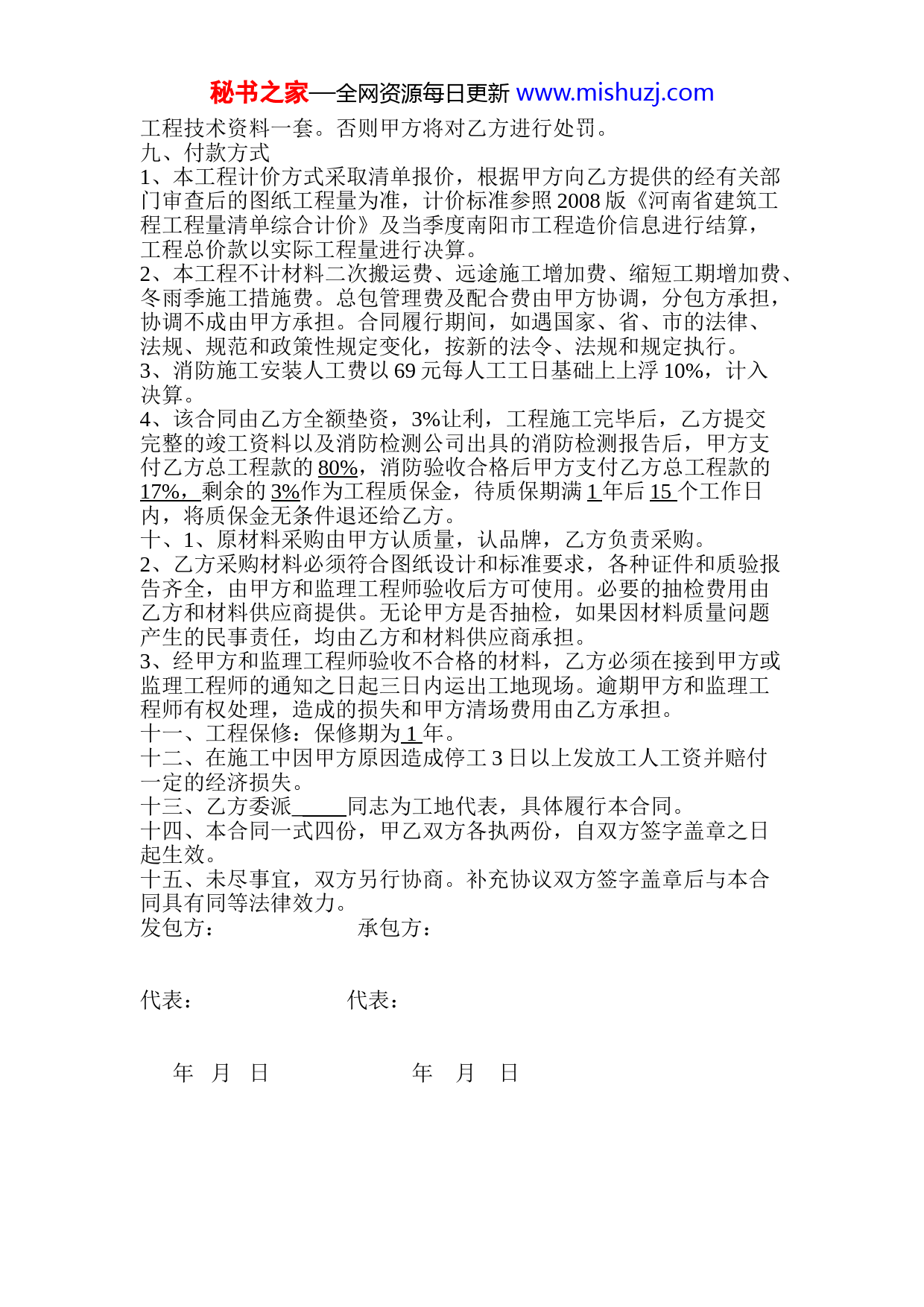 秘书之家—全网资源每日更新www.mishuzj.com消防工程施工承包合同发包方(甲方):承包方(乙方):依照《中华人民共和国合同法》、《中华人民共和国建筑法》和《中华人民共和国消防法》及有关其他法律、行政法规,遵循平等、自愿、公平和诚实守信的原则,双方就本建设工程施工协商一致,订立本承包合同。一、工程概况1、工程名称:2、工程地点:3、工程内容:火灾自动报警系统、自动喷水灭火系统、消防水泵房、消防主机、消火栓、防排烟、防火卷帘等系统。二、承包范围1、承包方式:包工包料,包检测以及资料。三、安全施工乙方应严格按照安全施工规范施工,施工中由于乙方原因出现的一切安全事故均由乙方承担。四、交工验收甲方负责整个工程的报验手续,乙方配合甲方提交完整的竣工资料以及消防检测公司出具的消防检测报告。五、合同金额1、甲乙双方本着诚信、友好合作的方针,共同协商关于消防工程的相关事宜,工程款总额为人民币。2、甲方负责协调乙方与各施工单位的配合工作。六、其他约定1、乙方应严格按照施工图纸和规范要求施工,服从甲方统一协调管理及监理方的管理。2、乙方应及时配合甲方做好工程竣工资料的整理工作。七、配合、管理费中包括以下配合内容:提供垂直运输、脚手架、提供施工以及调试水电、设备安装后孔洞的修补。八、乙方必须配备具备有资质证书的资料员、负责施工现场资料的收集与整理,且必须保证资料真实、齐全、同步。如甲方抽查资料存在弄虚作假与工程不同步,将对乙方给予经济处罚,乙方对整个项目的资料应设专人归档整理。施工图纸会审纪要、设计变更、技术审定单、现场签证单位应一式四份,同时交予甲方两份,监理方、承包人各留一份。甲方分包的工程,资料部分由分包单位整理后提供给乙方,工程竣工验收后二十日内,乙方负责向甲方移交完整的秘书之家—全网资源每日更新www.mishuzj.com工程技术资料一套。否则甲方将对乙方进行处罚。九、付款方式1、本工程计价方式采取清单报价,根据甲方向乙方提供的经有关部门审查后的图纸工程量为准,计价标准参照2008版《河南省建筑工程工程量清单综合计价》及当季度南阳市工程造价信息进行结算,工程总价款以实际工程量进行决算。2、本工程不计材料二次搬运费、远途施工增加费、缩短工期增加费、冬雨季施工措施费。总包管理费及配合费由甲方协调,分包方承担,协调不成由甲方承担。合同履行期间,如遇国家、省、市的法律、法规、规范和政策性规定变化,按新的法令、法规和规定执行。3、消防施工安装人工费以69元每人工工日基础上上浮10%,计入决算。4、该合同由乙方全额垫资,3%让利,工程施工完毕后,乙方提交完整的竣工资料以及消防检测公司出具的消防检测报告后,甲方支付乙方总工程款的80%,消防验收合格后甲方支付乙方总工程款的17%,剩余的3%作为工程质保金,待质保期满1年后15个工作日内,将质保金无条件退还给乙方。十、1、原材料采购由甲方认质量,认品牌,乙方负责采购。2、乙方采购材料必须符合图纸设计和标准要求,各种证件和质验报告齐全,由甲方和监理工程师验收后方可使用。必要的抽检费用由乙方和材料供应商提供。无论甲方是否抽检,如果因材料质量问题产生的民事责任,均由乙方和材料供应商承担。3、经甲方和监理工程师验收不合格的材料,乙方必须在接到甲方或监理工程师的通知之日起三日内运出工地现场。逾期甲方和监理工程师有权处理,造成的损失和甲方清场费用由乙方承担。十一、工程保修:保修期为1年。十二、在施工中因甲方原因造成停工3日以上发放工人工资并赔付一定的经济损失。十三、乙方委派_同志为工地代表,具体履行本合同。十四、本合同一式四份,甲乙双方各执两份,自双方签字盖章之日起生效。十五、未尽事宜,双方另行协商。补充协议双方签字盖章后与本合同具有同等法律效力。发包方:承包方:代表:代表:年月日年月日