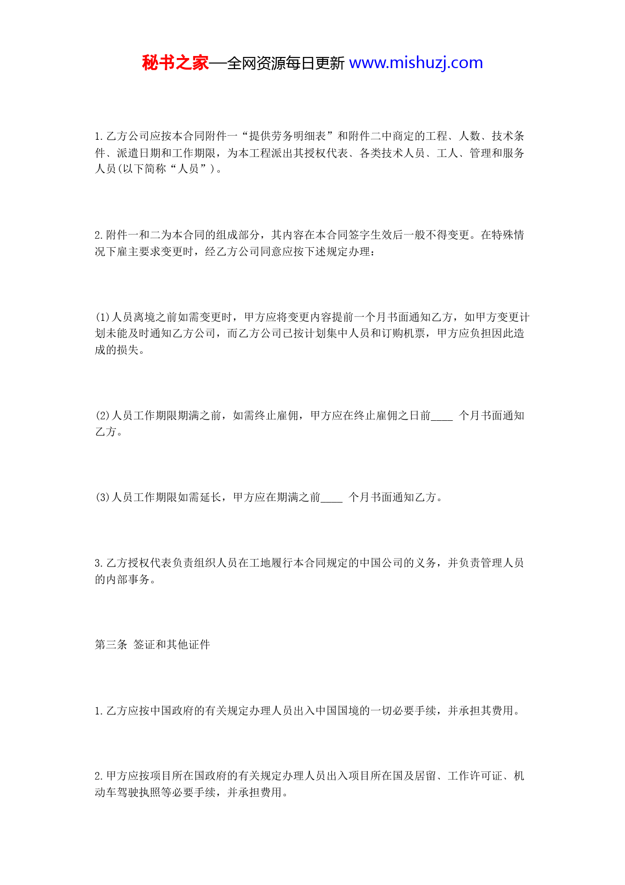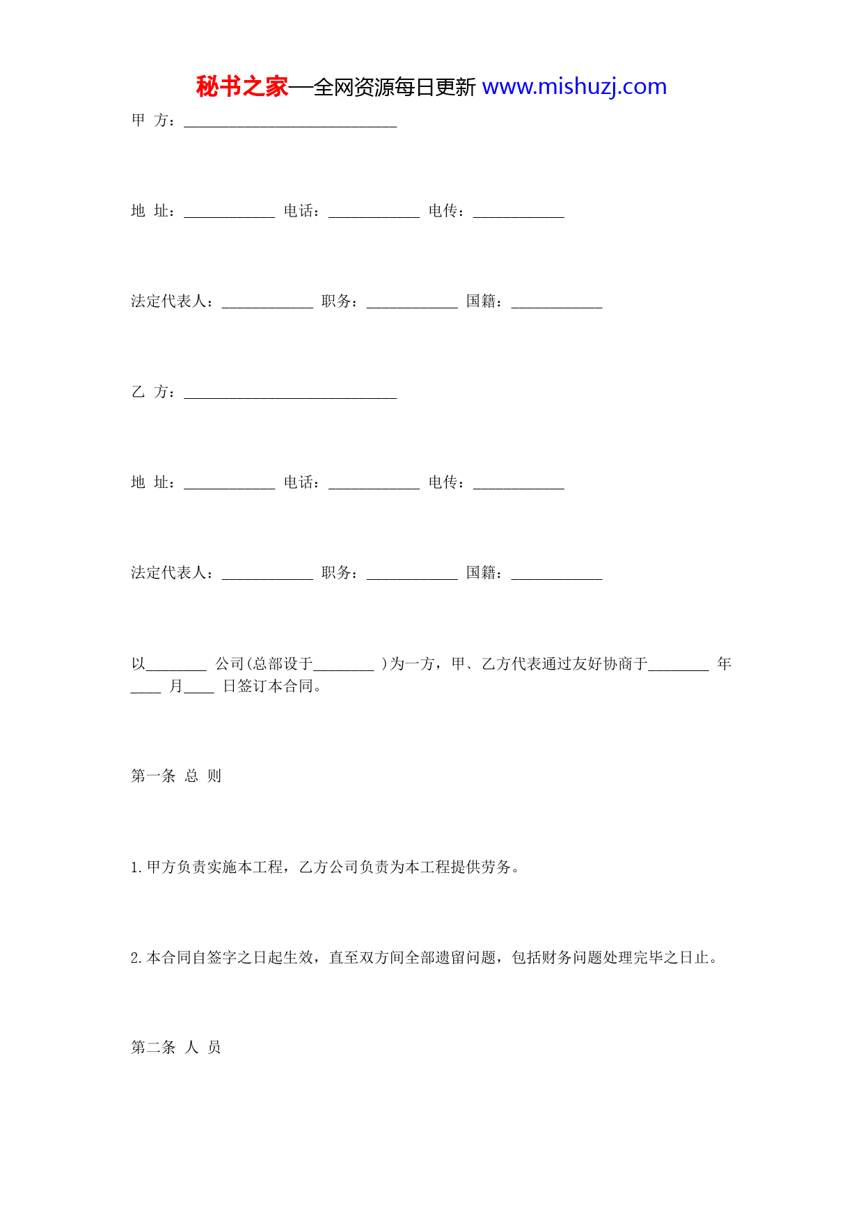 秘书之家—全网资源每日更新www.mishuzj.com甲方:____________________________地址:____________电话:____________电传:____________法定代表人:____________职务:____________国籍:____________乙方:____________________________地址:____________电话:____________电传:____________法定代表人:____________职务:____________国籍:____________以________公司(总部设于________)为一方,甲﹑乙方代表通过友好协商于________年____月____日签订本合同。第一条总则1.甲方负责实施本工程,乙方公司负责为本工程提供劳务。2.本合同自签字之日起生效,直至双方间全部遗留问题,包括财务问题处理完毕之日止。第二条人员秘书之家—全网资源每日更新www.mishuzj.com1.乙方公司应按本合同附件一“提供劳务明细表”和附件二中商定的工程﹑人数﹑技术条件﹑派遣日期和工作期限,为本工程派出其授权代表﹑各类技术人员﹑工人﹑管理和服务人员(以下简称“人员”)。2.附件一和二为本合同的组成部分,其内容在本合同签字生效后一般不得变更。在特殊情况下雇主要求变更时,经乙方公司同意应按下述规定办理:(1)人员离境之前如需变更时,甲方应将变更内容提前一个月书面通知乙方,如甲方变更计划未能及时通知乙方公司,而乙方公司已按计划集中人员和订购机票,甲方应负担因此造成的损失。(2)人员工作期限期满之前,如需终止雇佣,甲方应在终止雇佣之日前____个月书面通知乙方。(3)人员工作期限如需延长,甲方应在期满之前____个月书面通知乙方。3.乙方授权代表负责组织人员在工地履行本合同规定的中国公司的义务,并负责管理人员的内部事务。第三条签证和其他证件1.乙方应按中国政府的有关规定办理人员出入中国国境的一切必要手续,并承担其费用。2.甲方应按项目所在国政府的有关规定办理人员出入项目所在国及居留﹑工作许可证﹑机动车驾驶执照等必要手续,并承担费用。秘书之家—全网资源每日更新www.mishuzj.com甲方为人员办理上述手续,应向乙方具体明确提出由乙方提供的全部必要的证件,如因甲方的要求不明确而引起证件不足致使人员不能入境或无法获得居留和工作许可证,则乙方不负责任。3.如果甲方未能为人员获得在项目所在国的居留﹑工作许可证和机动车驾驶执照等,而使人员无法进行工作,应付给人员在此期间的合同工资。如人员因此被迫返国时,甲方应负担人员的回程旅费,并支付每人____个月合同工资的赔偿费。乙方公司没有按甲方要求提供全部必要的证件,从而使甲方无法为人员办理在项目所在国的居留和工作许可证等使人员无法工作或被迫返回中国,人员工资﹑回程旅费等由乙方公司负担。4.乙方公司应按本合同附件一和二将人员的姓名﹑出生地和日期﹑职称﹑护照号码﹑发照日期和单位﹑出发日期通知甲方或甲方在项目所在国的授权代表。甲方应在接到乙方公司的通知后即向项目所在国政府办理申请入境的必要手续,并通知乙方公司。同时甲方应通过项目所在国有关机构通知该国驻华使馆,以便办理入境签证。第四条乙方公司的义务1.符合双方在附件一商定的技术条件;2.遵守项目所在国的法律和法令,尊重当地风俗习惯;3.尊重甲方人员的技术指导;4.不参与项目所在国的任何政治活动;秘书之家—全网资源每日更新www.mishuzj.com5.遵守工地和驻地的纪律和规章制度;6.与甲方为实施本工程而雇佣的其他国籍的人员合作共事。第五条甲方的义务1.对人员给予正确的技术指导;2.尊重人员的人格﹑风俗和习惯;3.不干涉人员在非工作时间的活动自由;4.保障人员的安全;5.对人员的解雇和更换,应由双方的工地的授权代表商定。第六条工作时间1.人员每周工作5天,每天工作白班8小时,夜班7小时,每天工作时间安排可由甲方与乙方公司授权代表在工地商定。秘书之家—全网资源每日更新www.mishuzj.com2.凡由于待料﹑停电﹑气候恶劣等非人员的责任而造成的停工,应计为工作时间,合同工资照付。3.驻地至工地的单程所用时间,不应超过20分钟,超过的时间应计入工作时间。4.人员自中国到达工地后和本合同期满自工地回中国前,应分别享有____日有薪休息。第七条合同工资1.人员的月工资(包括伙食费)在本合同有效内按以下标准支付(美元):(1)半熟炼工,帮厨,服务人员(2)熟练技工,厨师(3)工长(4)技术员,护士,翻译,会计员(5)驻地经理秘书之家—全网资源每日更新www.mishuzj.com(6)工程师,医师,会计师(7)高级工程师(8)授权代表(9)副授权代表2.如本合同期超过1年,自第2年始,每月工资递增____%。第八条夜班及加班1.根据工程的需要,甲方要求人员在夜间工作或加班,应商得乙方授权代表同意,每月加班工作小时原则上不得超过____小时。2.夜间时间系指从当日晚上9时至次日晨5时。人员夜间工作(指正常夜班工作)甲方应按合同工资150%支付工资;人员夜间加班,甲方应按合同工资200%支付加班费。3.小时工资按下式计算:第九条工资和加班费支付秘书之家—全网资源每日更新www.mishuzj.com1.人员工资支付应自人员离开中国________之日起至回到中国________之日止。平均日工资为月合同工资的1/25。2.乙方公司在工地的授权代表应按甲方提供的表格填写工作时间和加班时间,编制工资单,在每月工资结算日即________日后________天内即________日前提交甲方在工地的授权代表审核批准。3.工资单审批后,甲方应在每月工资结算日即________日后一天内将