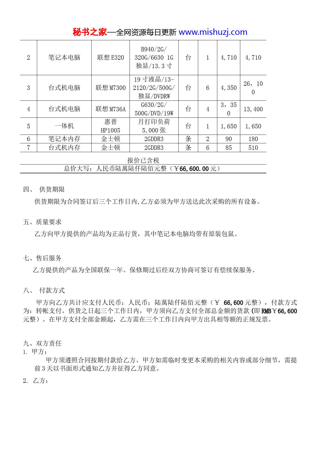 秘书之家—全网资源每日更新www.mishuzj.com电脑及办公设备采购合同甲方:XX广告有限公司乙方:XX有限公司地址:XX地址:XX邮编:邮编:X电话:电话:X传真:传真:X甲方因公司业务需要,新添置笔记本电脑、台式电脑及打印办公设备,经与乙双方协商,本着互惠互利的原则,根据《中华人民共和国合同法》,自愿达成以下采购合作条款:一、采购概况1、采购名称:电脑及办公设备采购2、送货地点:广州市越秀区五羊新城广场13楼3、送货方式:由乙方承担此次采购产生的所有运输费用,乙方必须将设备如期送达甲方指定地点。二、采购内容乙方为甲方提供笔记本电脑、台式机电脑及打印办公设备。三、采购明细现将具体设备名称、品牌型号,参数数量、交易金额如下:序名称品牌/型号参数单位数量单价合计(元(元)号)20,050i3-4,010370M(2.4G)/14.0”HDLED/ATI545V1笔记本电脑联想E40512M/2G/320G/台5Rambo/LINUX/网卡/ThinkPadBGN/7合1读卡器/4芯/亚光黑秘书之家—全网资源每日更新www.mishuzj.comB940/2G/2笔记本电脑联想E320320G/66301G台14,7104,710独显/13.3寸19寸液晶/i3-26,103台式机电脑联想M73002120/2G/500G/台64,3500独显/DVDRW4台式机电脑联想M736AG630/2G/台43,3513,400500G/DVD/19W05一体机惠普月打印负荷台11,6501,650HP10055,000张6笔记本内存金士顿2GDDR3条2901807台式机内存金士顿2GDDR3条685510报价已含税总价大写:人民币陆萬陆仟陆佰元整(¥66,600.00元)四、供货期限供货期限为合同签订后三个工作日内,乙方必须为甲方送达此次采购的所有设备。五、质量要求乙方向甲方提供的产品均为正品行货,其中笔记本电脑均带有原装包鼠。七、售后服务乙方提供的产品为全国联保一年。保修期过后经双方协商可签订有偿续保服务。八、付款方式甲方向乙方共计应支付人民币:人民币:陆萬陆仟陆佰元整(¥66,600元整),付款方式为:转帐支付。供货之日起三个工作日内,甲方须向乙方支付全部总金额的货款(即RMB¥66,600元整)。在甲方支付全部金额起,乙方需在三个工作日内向甲方出具相等额的正规发票。九、双方责任1.甲方:甲方须遵照合同按期付款给乙方。甲方如需临时变更本采购的相关内容或部分细节,需提前3天以书面形式通知乙方并征得乙方同意。2.乙方:秘书之家—全网资源每日更新www.mishuzj.com乙方须向甲方提供详细的采购报价。乙方有责任遵照合同按期按量交货给甲方,并保证设备原装正品。乙方必须严守商业道德,做好保密工作,未经甲方同意,一切甲方资料均不得外传。十、其它事宜经甲乙双方商定做出如下协议:1.若甲方因单方面原因延期向乙方支付款项,每逾期1天需向乙方支付本合同总金额的千份之五作为滞纳金,以此类推;若甲方因单方面原因延期向甲方支付款项10天以上,乙方有权即时解除合同,并依据法律程序向甲方追讨欠款及上述标准的滞纳金;2.乙方须在双方约定之时间内完成甲方委托的此次采购,如遇不可避免的时间耽误,乙方须提前1天向甲方说明。如发生违约所造成的一切损失,由违约方承担。3.合同签约地:广州4.如甲方或乙方违约而没有按合同规定执行的,甲乙双方可向本合同原签订地广东省广州市有管辖权的法院提请诉讼。5.其它未尽事宜由双方协商解决。6.合同一式贰份,甲乙双方签字生效,各持壹份,并具有同等法律效力。甲方单位名称:广州蓝海康桥广告有限公司乙方单位名称:广州慧泽计算机系统工程有限公司(盖公章)(盖公章)签约代表:签约代表:签署日期:签署日期: