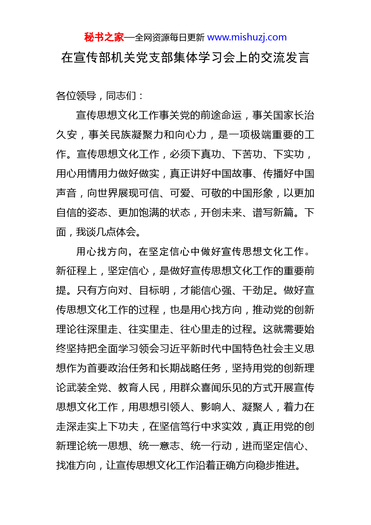 秘书之家—全网资源每日更新www.mishuzj.com在宣传部机关党支部集体学习会上的交流发言各位领导,同志们:宣传思想文化工作事关党的前途命运,事关国家长治久安,事关民族凝聚力和向心力,是一项极端重要的工作。宣传思想文化工作,必须下真功、下苦功、下实功,用心用情用力做好做实,真正讲好中国故事、传播好中国声音,向世界展现可信、可爱、可敬的中国形象,以更加自信的姿态、更加饱满的状态,开创未来、谱写新篇。下面,我谈几点体会。用心找方向,在坚定信心中做好宣传思想文化工作。新征程上,坚定信心,是做好宣传思想文化工作的重要前提。只有方向对、目标明,才能信心强、干劲足。做好宣传思想文化工作的过程,也是用心找方向,推动党的创新理论往深里走、往实里走、往心里走的过程。这就需要始终坚持把全面学习领会习近平新时代中国特色社会主义思想作为首要政治任务和长期战略任务,坚持用党的创新理论武装全党、教育人民,用群众喜闻乐见的方式开展宣传思想文化工作,用思想引领人、影响人、凝聚人,着力在走深走实上下功夫,在坚信笃行中求实效,真正用党的创新理论统一思想、统一意志、统一行动,进而坚定信心、找准方向,让宣传思想文化工作沿着正确方向稳步推进。秘书之家—全网资源每日更新www.mishuzj.com用情讲故事,在传播声音中做好宣传思想文化工作。无论是塑造更多为世界所认知的中华文化形象,充分展示一个生动立体的中国,还是通过讲好中国故事,让可信、可爱、可敬的中国形象更好地展现在世界面前,都离不开用情讲好中国故事的实际行动。讲好中国故事,必须用情,怀揣一颗真心、带着一份真情做宣传思想文化工作。不仅多讲是什么,更多传播为什么、怎么办,不仅管好自己的“一亩三分地”,更立足中国大地、世界沃土,肩负起大国担当、彰显大国形象,让纸面上的理论鲜活起来、让耳朵里的故事真实起来、让脑海中的形象生动起来,进而切实增强中华文明的传播力、影响力,让世界读懂中国、读懂中国人民、读懂中国共产党、读懂中华民族。用力入人心,在团结奋斗中做好宣传思想文化工作。民心是最大的政治。入人心、得民心,是做好宣传思想文化工作的终极目标。实现这一目标,必须用力。只有用力入人心,才能真正通过做好宣传思想文化工作,将广大干部群众团结起来、凝聚起来,拧成一股绳、形成一盘棋,风雨共担、携手共进。做好宣传思想文化工作,一定要时时处处站稳人民立场,时时刻刻心系人民群众,想人民所想、忧人民所忧,不脱离群众搞宣传、做工作,用群众乐于接受、共同期待的方式做宣传思想文化工作,群众的关注点在哪里、需求点在哪里,宣传思想文化工作的脚步就秘书之家—全网资源每日更新www.mishuzj.com跟进到哪里、覆盖到哪里,让党的声音真正传到群众身边、传入千家万户,让群众感到放心安心,进而更好地团结奋斗、砥砺向前。发言完毕,谢谢大家!