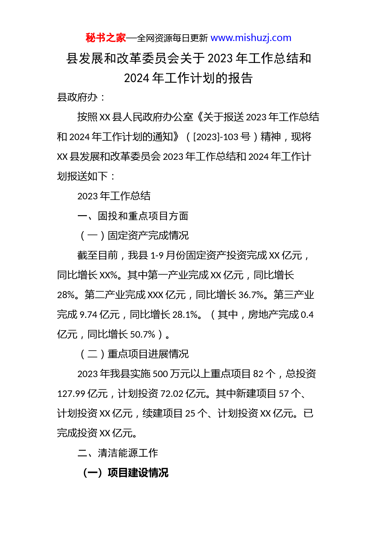 秘书之家—全网资源每日更新www.mishuzj.com县发展和改革委员会关于2023年工作总结和2024年工作计划的报告县政府办:按照XX县人民政府办公室《关于报送2023年工作总结和2024年工作计划的通知》([2023]-103号)精神,现将XX县发展和改革委员会2023年工作总结和2024年工作计划报送如下:2023年工作总结一、固投和重点项目方面(一)固定资产完成情况截至目前,我县1-9月份固定资产投资完成XX亿元,同比增长XX%。其中第一产业完成XX亿元,同比增长28%。第二产业完成XXX亿元,同比增长36.7%。第三产业完成9.74亿元,同比增长28.1%。(其中,房地产完成0.4亿元,同比增长50.7%)。(二)重点项目进展情况2023年我县实施500万元以上重点项目82个,总投资127.99亿元,计划投资72.02亿元。其中新建项目57个、计划投资XX亿元,续建项目25个、计划投资XX亿元。已完成投资XX亿元。二、清洁能源工作(一)项目建设情况秘书之家—全网资源每日更新www.mishuzj.com1.推动远景、天能重工风电项目并网发电进展情况:远景40万千瓦风电项目已于2023年2月26日并网发电。天能重工15万千瓦风电项目2023年3月22日并网发电。2.加快推进北方联合电力火电灵活性改造项目,确保年内并网进展情况:北方联合电力火电灵活性改造项目于2023年2月6日开工建设,截止目前,风机40台全部吊装完成,升压站设备安装完毕,已开始调试,综合楼正在进行内部装修,待呼供输电线路建成后即可并网发电。3.加快推进4万千瓦分散式风电项目,确保年内实现并网市发改委于2023年4月7日下达4万千瓦分散式风电项目指标。其中XX县15MW分散式风电乡村民生改善示范项目于6月21日取得核准批复,目前正在进行开工前准备工作,计划10月底开工建设;中科聚源新能源XX县一期10MW分散式风电项目已取得核准批复,正在进行建设用地报批工作,计划11月初开工建设;中和晟达新能源后柜二期15MW分散式风电项目已取得核准批复,正在进行建设用地报批工作,计划11月初开工建设。4.积极推进呼和浩特抽水蓄能电站二期项目抽水蓄能电站二期项目,申请调整纳入国家“十四秘书之家—全网资源每日更新www.mishuzj.com五”规划的请示已上报国家能源局,等待批复。积极对接了解抽水蓄能电站二期项目纳规情况,及时提供补证材料。完成预可研阶段和下水库深钻孔310米;上水库及料场深钻孔650米;地下厂房深钻孔,临时道路施工。5.完成大豆铺500千伏变电站3号主变扩建工程。大豆铺500千伏变电站3号主变扩建工程于2023年2月10复工,目前已全部完工,计划10月26日投运。6.推动XX—鸿盛、XX—金山2条“双回路”输电线路、变电站等电力基础设施开工建设XX—鸿盛输电线路工程目前项目目前已与新城区人民政府对接初步确定鸿盛500千伏变电站拟选站址和线路出线,已办理完成项目相关协议,计划2023年底完成项目核准;XX—金山输电线路工程正在开展土地预审、规划选址和社会稳定性评估等核准支持性文件办理工作,预计12月取得核准批复。(二)认真做好能源统筹发展与安全生产工作在安全生产监管上。严格按照“管行业必须管安全、管业务必须管安全、管生产经营必须管安全”的原则,坚持人民至上、生命至上,坚持安全第一,牢固树立红线意识,统筹发展和安全。我委制定了《XX县能源重大事故隐患专项排查整治2023行动实施方案》、《XX县电化学储能电站安全风险隐患专项整治工作方案》,编制了《XX县突秘书之家—全网资源每日更新www.mishuzj.com发事件能源供应应急预案》,针对全县清洁能源领域实施拉网式、地毯式排查检查整改,做到不留死角、不留空白、不留盲区。要求企业履行安全生产主体责任,建立健全安全生产责任制和安全生产管理制度,符合实际、覆盖各级生产人员的作业规程及操作规程;同时深入企业进行安全生产检查,重点对机构人员、管理制度、安全投入、教育培训、风险管控等方面入手,深入查找安全生产管理薄弱环节以及影响安全生产的各类缺陷,按时完成整改,防范各类安全风险,确保电站安全稳定运行。以“人人讲安全,个个会应急”为主题,开展系列安全生产宣传教育活动,推动安全生产责任落实,提高风险隐患排查整改质量,增强发现和解决问题的意愿和能力,切实提升新能源行业安全意识和应急能力。在统筹发展和安全上。持续深化安全思想学习教育,压实安全生产领导责任,起草制定了《XX县全力打造清洁能源输出基地实施方案》。三、粮食工作(一)不断强化应急保障能力,加强粮食流通市场供应。2023年按照上级要求,积极帮助2家粮食应急加工企业必须复工复产,鼓励其他加工企业有序复工复产,并要求15户粮食应急供应网点和鼓励其他粮食经营户开门营业,秘书之家—全网资源每日更新www.mishuzj.com协调县外粮食供应商为经营户供货,保障了我县粮食市场安全,没有发生居民抢购和屯粮现象,粮食价格稳定,市场供应充足。(二)严格落实储备粮安全监管和粮食安全生产。2023年按照储备粮属地监管原则,县发改委对内蒙古薯元康生物科技有限公司试点储存的1000吨自治区级储备淀粉进行了监督管理。2023年10月按照自治区粮食和物资储备局安排,薯元康公司完成1000吨自治区级淀粉储备移库轮换,现申请自治区粮食和物资储备局进行验收。2023年要求XX国储库在职人员进行了消防安全、粮食统计、国家粮食政策培训。对全县涉粮企业进行了多轮次安全生产