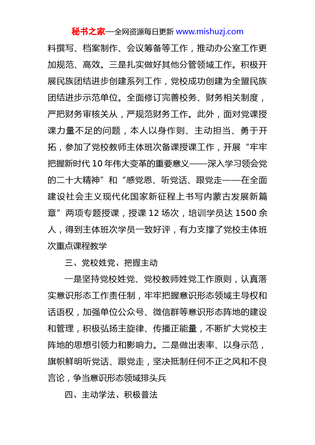 秘书之家—全网资源每日更新www.mishuzj.com党校副校长2023年述职述德述廉报告根据考核工作安排,现将一年来本人思想、工作情况述职如下:一、坚持学习、以学促干一年来,我始终坚持加强学习不懈怠,重点围绕习近平新时代中国特色社会主义思想、党二十大精神和习近平总书记对内蒙古的重要指示精神,不断提高理论素养和政策水平。同时.积极参加各类理论学习培训和讲座,并充分利用零散时间通过报刊、网络等媒体及时了解时政,有针对性地学习相关理论业务知识,坚持学以致用,努力把学习的体会和成果转化为谋划工作的正确思路和促进工作的具体措施。通过坚持不懈地学习实践,本人的政治素养和政策理论素养明显提高,较好完成了全年各项工作任务,得到了领导和同事们的一致肯定。二、尽职尽责、担当作为根据领导班子责任分工,本人主要分管财务和办公室。-年来,我坚持听从指挥、服务大局,始终高标准高质量完成每一项工作任务。一是协助校长统筹协调日常教学安排、学员管理和后勤服务等事项,推动全年教学任务圆满完成。二是全力做好办文办会工作,进一步明确分工并强化责任落实,从严规范公文运转、收发、文件制定、材秘书之家—全网资源每日更新www.mishuzj.com料撰写、档案制作、会议筹备等工作,推动办公室工作更加规范、高效。三是扎实做好其他分管领域工作。积极开展民族团结进步创建系列工作,党校成功创建为全盟民族团结进步示范单位。全面修订完善校务、财务相关制度,严把财务审核关从,严规范财务工作。此外,面对党课授课力量不足的问题,本人以身作则、主动担当、勇于开拓,参加了党校教师主体班次备课授课工作,开展“...