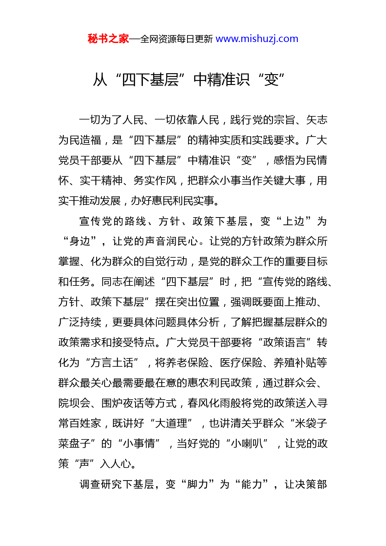 秘书之家—全网资源每日更新www.mishuzj.com从“四下基层”中精准识“变”一切为了人民、一切依靠人民,践行党的宗旨、矢志为民造福,是“四下基层”的精神实质和实践要求。广大党员干部要从“四下基层”中精准识“变”,感悟为民情怀、实干精神、务实作风,把群众小事当作关键大事,用实干推动发展,办好惠民利民实事。宣传党的路线、方针、政策下基层,变“上边”为“身边”,让党的声音润民心。让党的方针政策为群众所掌握、化为群众的自觉行动,是党的群众工作的重要目标和任务。同志在阐述“四下基层”时,把“宣传党的路线、方针、政策下基层”摆在突出位置,强调既要面上推动、广泛持续,更要具体问题具体分析,了解把握基层群众的政策需求和接受特点。广大党员干部要将“政策语言”转化为“方言土话”,将养老保险、医疗保险、养殖补贴等群众最关心最需要最在意的惠农利民政策,通过群众会、院坝会、围炉夜话等方式,春风化雨般将党的政策送入寻常百姓家,既讲好“大道理”,也讲清关乎群众“米袋子菜盘子”的“小事情”,当好党的“小喇叭”,让党的政策“声”入人心。调查研究下基层,变“脚力”为“能力”,让决策部秘书之家—全网资源每日更新www.mishuzj.com署顺民心。调查研究是谋事之基、成事之道,是了解基层、知晓民意的“桥梁”。同志在宁德工作之初,为解决闽东贫困地区的发展难题,走遍闽东9个县收集一手资料、倾听一线声音,提出了“弱鸟先飞”“滴水穿石”等一系列重要理念和重大实践,彻底结束了当地“一方水土养不活一方人”的历史。“知屋漏者在宇下,知政失者在草野”。广大党员干部要用好调查研究这个...