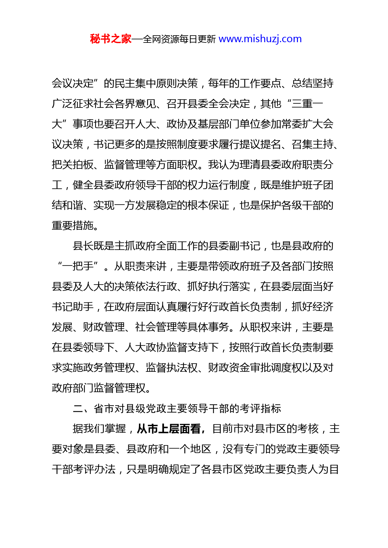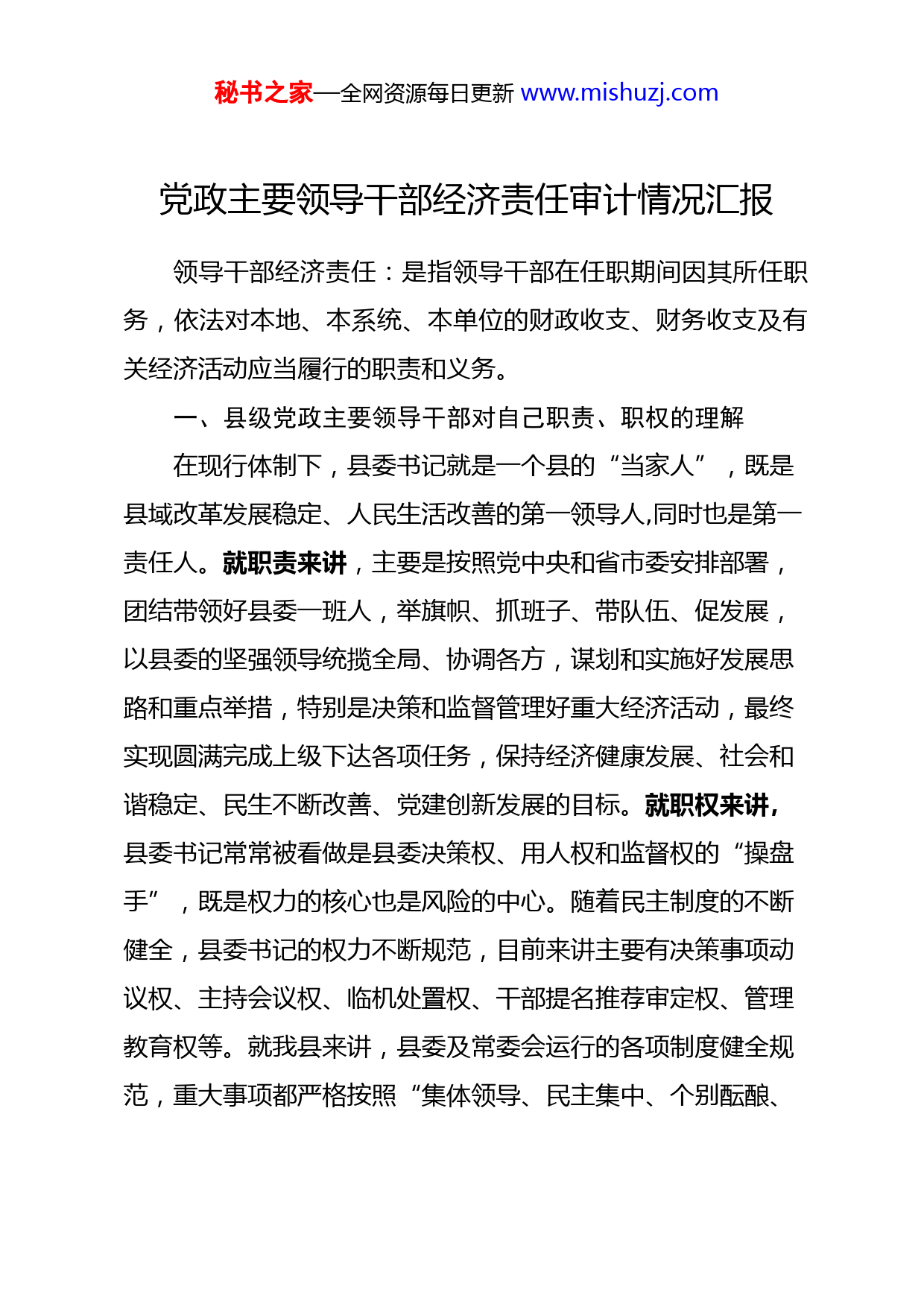 秘书之家—全网资源每日更新www.mishuzj.com党政主要领导干部经济责任审计情况汇报领导干部经济责任:是指领导干部在任职期间因其所任职务,依法对本地、本系统、本单位的财政收支、财务收支及有关经济活动应当履行的职责和义务。一、县级党政主要领导干部对自己职责、职权的理解在现行体制下,县委书记就是一个县的“当家人”,既是县域改革发展稳定、人民生活改善的第一领导人,同时也是第一责任人。就职责来讲,主要是按照党中央和省市委安排部署,团结带领好县委一班人,举旗帜、抓班子、带队伍、促发展,以县委的坚强领导统揽全局、协调各方,谋划和实施好发展思路和重点举措,特别是决策和监督管理好重大经济活动,最终实现圆满完成上级下达各项任务,保持经济健康发展、社会和谐稳定、民生不断改善、党建创新发展的目标。就职权来讲,县委书记常常被看做是县委决策权、用人权和监督权的“操盘手”,既是权力的核心也是风险的中心。随着民主制度的不断健全,县委书记的权力不断规范,目前来讲主要有决策事项动议权、主持会议权、临机处置权、干部提名推荐审定权、管理教育权等。就我县来讲,县委及常委会运行的各项制度健全规范,重大事项都严格按照“集体领导、民主集中、个别酝酿、秘书之家—全网资源每日更新www.mishuzj.com会议决定”的民主集中原则决策,每年的工作要点、总结坚持广泛征求社会各界意见、召开县委全会决定,其他“三重一大”事项也要召开人大、政协及基层部门单位参加常委扩大会议决策,书记更多的是按照制度要求履行提议提名、召集主持、把关拍板、监督管理等方面职权。我认为理清县委政府职责分工,健...
