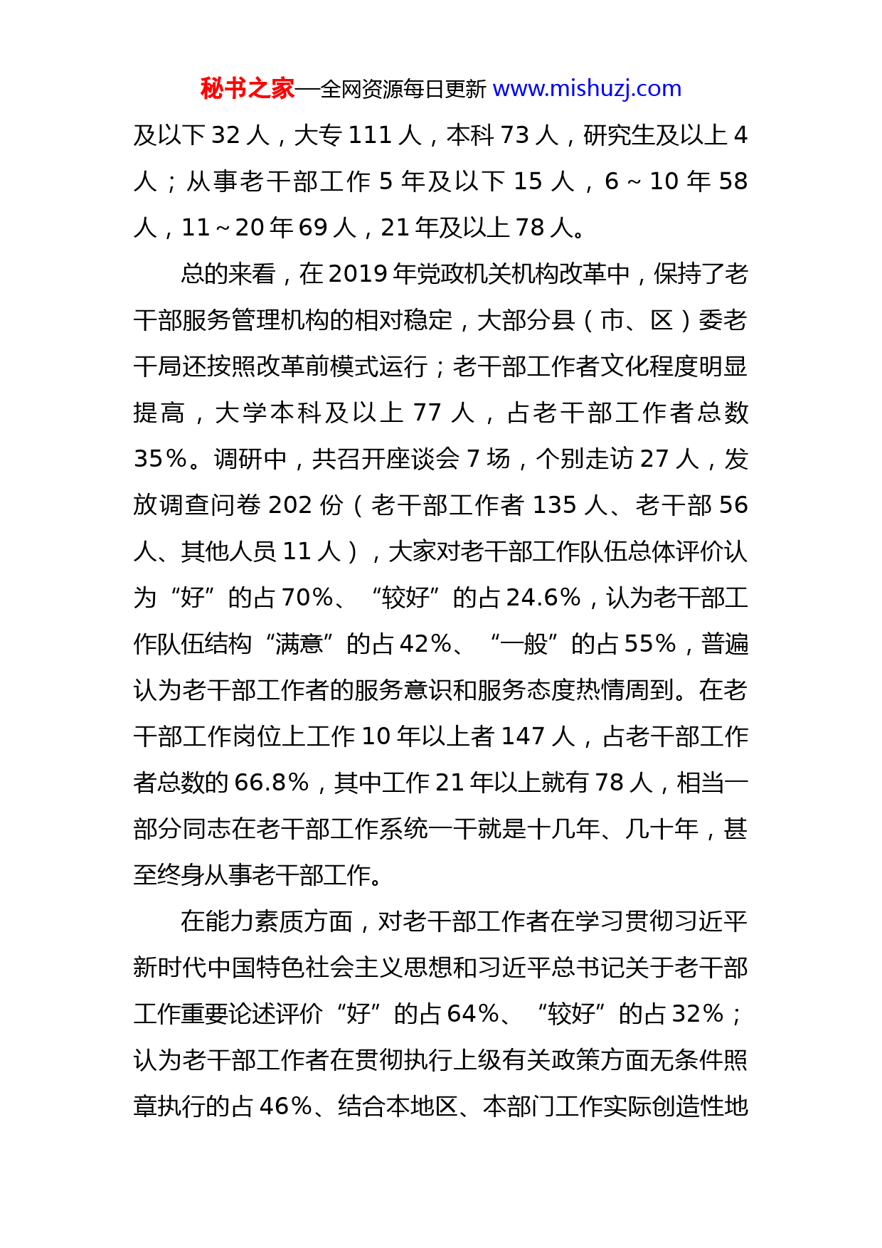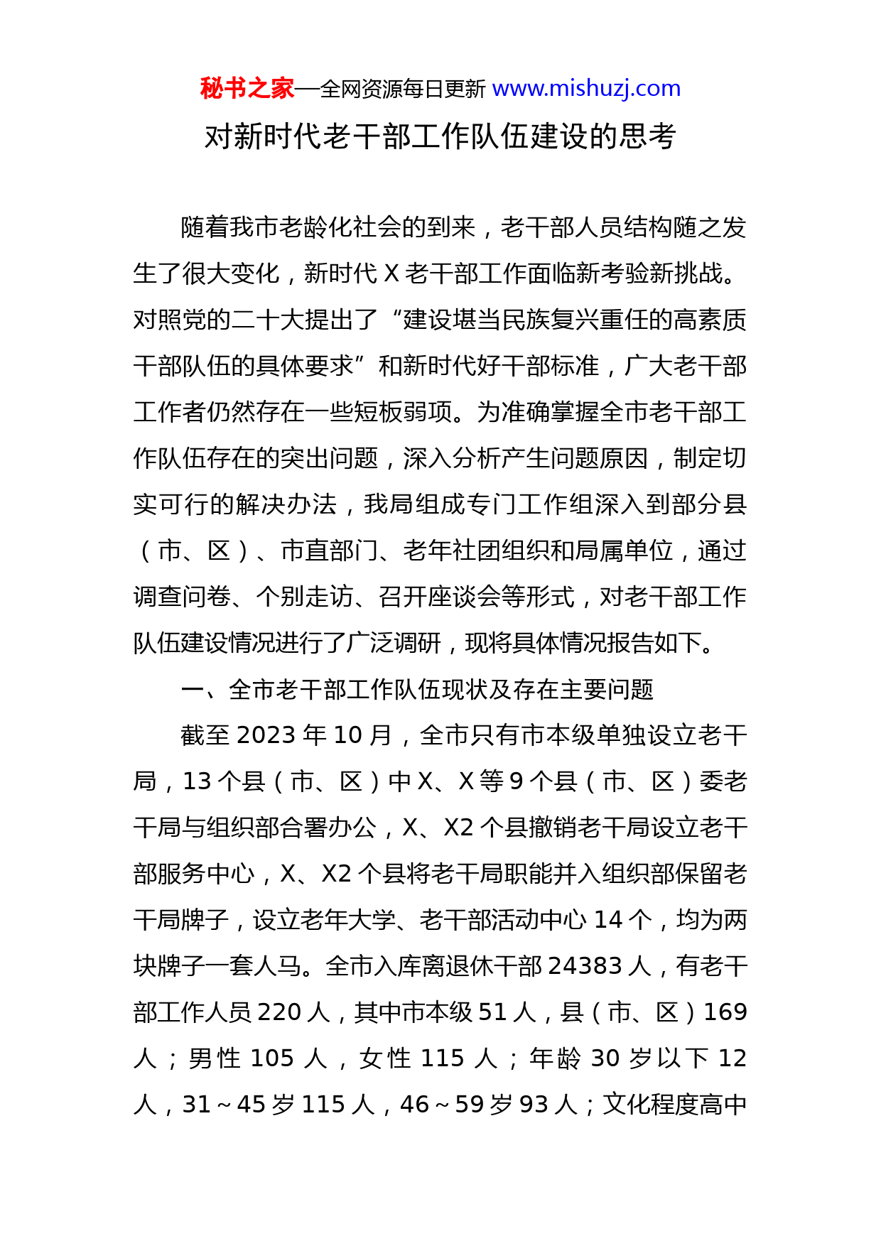 秘书之家—全网资源每日更新www.mishuzj.com对新时代老干部工作队伍建设的思考随着我市老龄化社会的到来,老干部人员结构随之发生了很大变化,新时代X老干部工作面临新考验新挑战。对照党的二十大提出了“建设堪当民族复兴重任的高素质干部队伍的具体要求”和新时代好干部标准,广大老干部工作者仍然存在一些短板弱项。为准确掌握全市老干部工作队伍存在的突出问题,深入分析产生问题原因,制定切实可行的解决办法,我局组成专门工作组深入到部分县(市、区)、市直部门、老年社团组织和局属单位,通过调查问卷、个别走访、召开座谈会等形式,对老干部工作队伍建设情况进行了广泛调研,现将具体情况报告如下。一、全市老干部工作队伍现状及存在主要问题截至2023年10月,全市只有市本级单独设立老干局,13个县(市、区)中X、X等9个县(市、区)委老干局与组织部合署办公,X、X2个县撤销老干局设立老干部服务中心,X、X2个县将老干局职能并入组织部保留老干局牌子,设立老年大学、老干部活动中心14个,均为两块牌子一套人马。全市入库离退休干部24383人,有老干部工作人员220人,其中市本级51人,县(市、区)169人;男性105人,女性115人;年龄30岁以下12人,31~45岁115人,46~59岁93人;文化程度高中秘书之家—全网资源每日更新www.mishuzj.com及以下32人,大专111人,本科73人,研究生及以上4人;从事老干部工作5年及以下15人,6~10年58人,11~20年69人,21年及以上78人。总的来看,在2019年党政机关机构改革中,保持了老干部服务管理机构的相对稳定,大部分县(市、区)委老干局还按照改革前模式运行;老干部工作者文化程度...