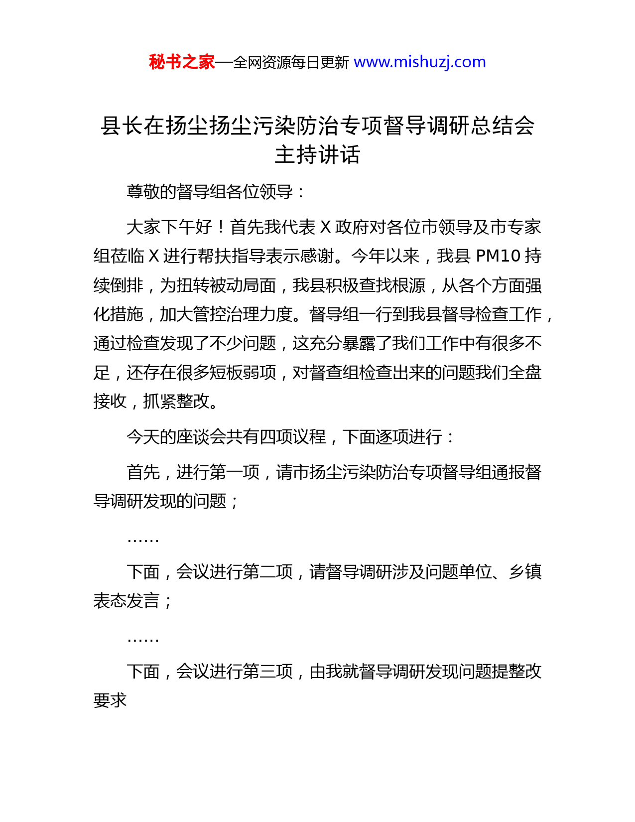 秘书之家—全网资源每日更新www.mishuzj.com县长在扬尘扬尘污染防治专项督导调研总结会主持讲话尊敬的督导组各位领导:大家下午好!首先我代表X政府对各位市领导及市专家组莅临X进行帮扶指导表示感谢。今年以来,我县PM10持续倒排,为扭转被动局面,我县积极查找根源,从各个方面强化措施,加大管控治理力度。督导组一行到我县督导检查工作,通过检查发现了不少问题,这充分暴露了我们工作中有很多不足,还存在很多短板弱项,对督查组检查出来的问题我们全盘接收,抓紧整改。今天的座谈会共有四项议程,下面逐项进行:首先,进行第一项,请市扬尘污染防治专项督导组通报督导调研发现的问题;……下面,会议进行第二项,请督导调研涉及问题单位、乡镇表态发言;……下面,会议进行第三项,由我就督导调研发现问题提整改要求秘书之家—全网资源每日更新www.mishuzj.com……刚才,市扬尘专项督导组通报了在我县督导调研发现的重点问题,涉及问题单位、乡镇也作了表态发言,希望说到做到、见到成效。就我县来说,扬尘治理工作在大气污染防治中也特别突出,建筑施工、道路扬尘、空地裸地扬尘、工业企业扬尘等直接影响到空气质量的改善,已成为拉升我县污染指数的首要污染物。为全面做好扬尘治理工作,下面,我讲三点意见:一、务必认清形势,切实提高扬尘治理攻坚的重要性认识扬尘治理工作成效如何,直接影响到全年我县在省市的排名,这是一场输不起的攻坚硬仗。对此,大家务必保持高度敏感、高度重视、高度负责、高度自觉,必须坚决守住目标底线、工作底线、纪律底线,全力扭转我县的不利局面。二、务必刚性管控,以更严更细的措施推进...
