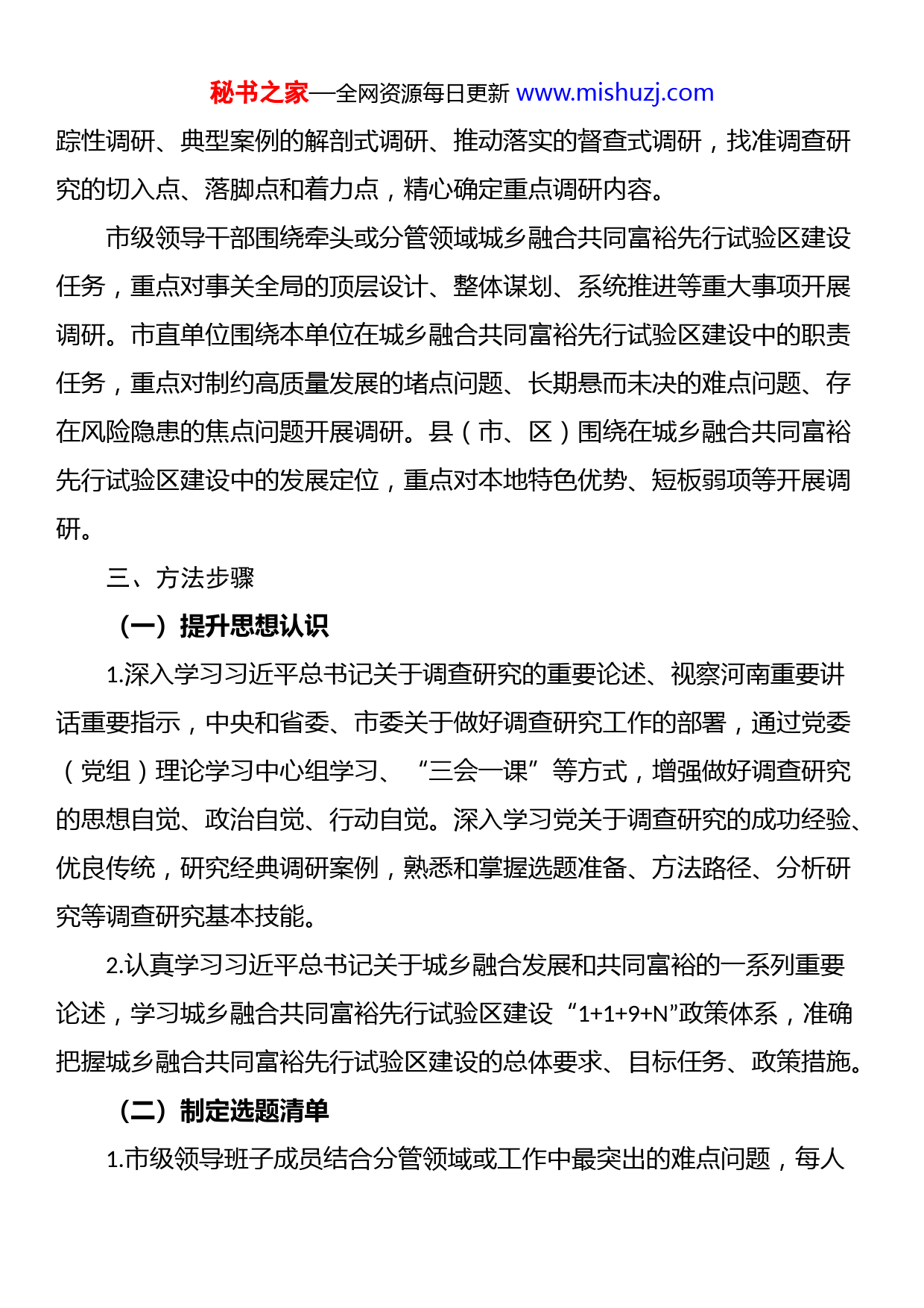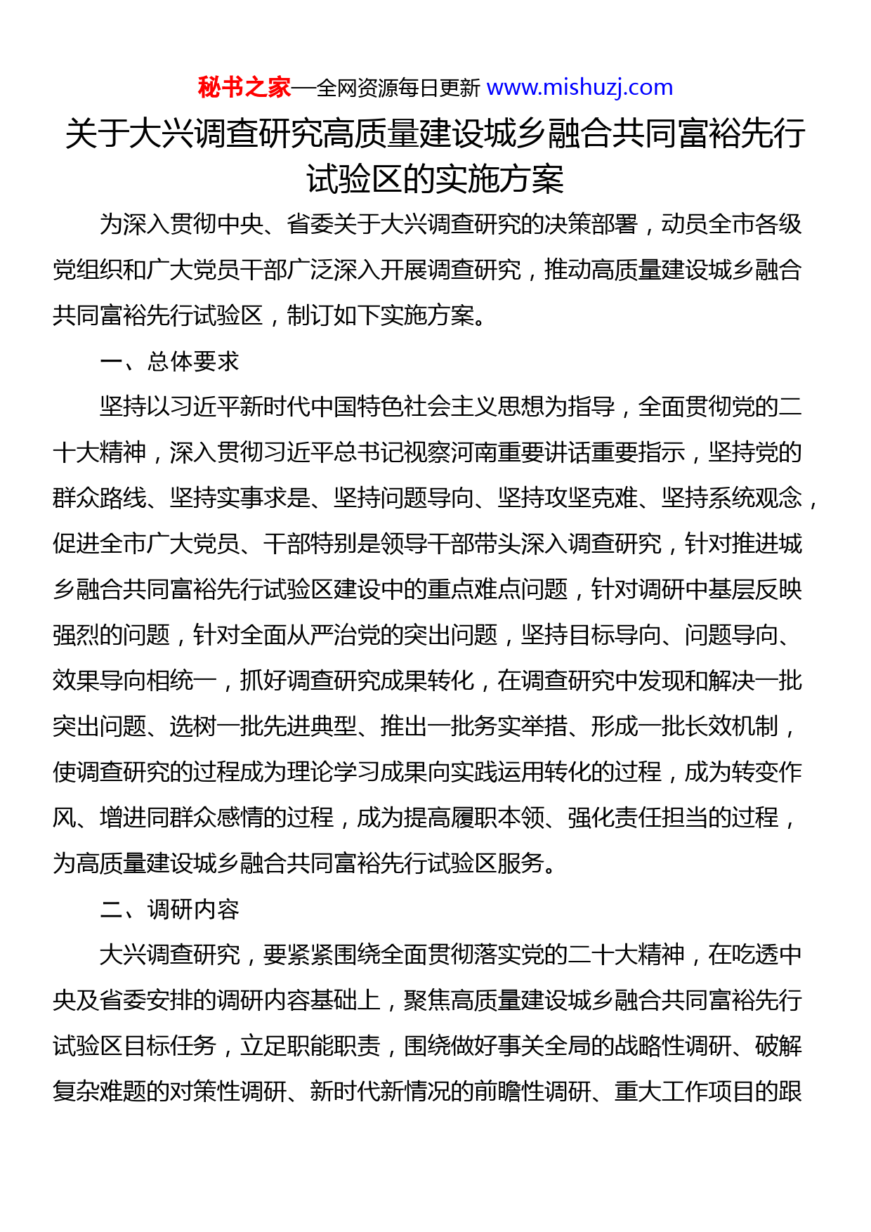 秘书之家—全网资源每日更新www.mishuzj.com关于大兴调查研究高质量建设城乡融合共同富裕先行试验区的实施方案为深入贯彻中央、省委关于大兴调查研究的决策部署,动员全市各级党组织和广大党员干部广泛深入开展调查研究,推动高质量建设城乡融合共同富裕先行试验区,制订如下实施方案。一、总体要求坚持以习近平新时代中国特色社会主义思想为指导,全面贯彻党的二十大精神,深入贯彻习近平总书记视察河南重要讲话重要指示,坚持党的群众路线、坚持实事求是、坚持问题导向、坚持攻坚克难、坚持系统观念,促进全市广大党员、干部特别是领导干部带头深入调查研究,针对推进城乡融合共同富裕先行试验区建设中的重点难点问题,针对调研中基层反映强烈的问题,针对全面从严治党的突出问题,坚持目标导向、问题导向、效果导向相统一,抓好调查研究成果转化,在调查研究中发现和解决一批突出问题、选树一批先进典型、推出一批务实举措、形成一批长效机制,使调查研究的过程成为理论学习成果向实践运用转化的过程,成为转变作风、增进同群众感情的过程,成为提高履职本领、强化责任担当的过程,为高质量建设城乡融合共同富裕先行试验区服务。二、调研内容大兴调查研究,要紧紧围绕全面贯彻落实党的二十大精神,在吃透中央及省委安排的调研内容基础上,聚焦高质量建设城乡融合共同富裕先行试验区目标任务,立足职能职责,围绕做好事关全局的战略性调研、破解复杂难题的对策性调研、新时代新情况的前瞻性调研、重大工作项目的跟秘书之家—全网资源每日更新www.mishuzj.com踪性调研、典型案例的解剖式调研、推动落实的督查式调研,找准调查研究...