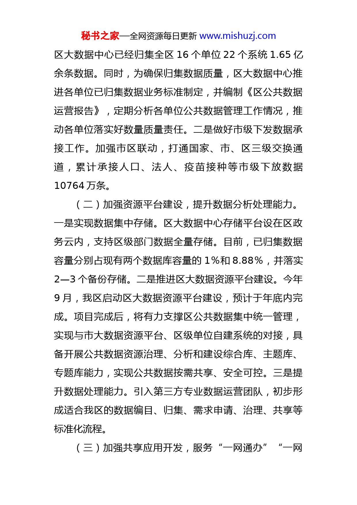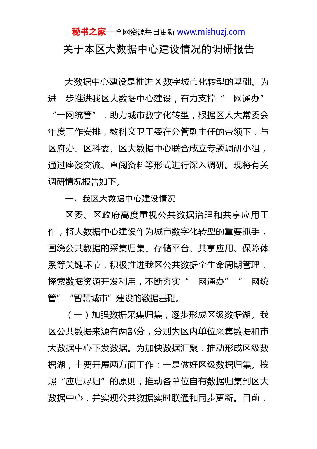 秘书之家—全网资源每日更新www.mishuzj.com关于本区大数据中心建设情况的调研报告大数据中心建设是推进X数字城市化转型的基础。为进一步推进我区大数据中心建设,有力支撑“一网通办”“一网统管”,助力城市数字化转型,根据区人大常委会年度工作安排,教科文卫工委在分管副主任的带领下,与区府办、区科委、区大数据中心联合成立专题调研小组,通过座谈交流、查阅资料等形式进行深入调研。现将有关调研情况报告如下。一、我区大数据中心建设情况区委、区政府高度重视公共数据治理和共享应用工作,将大数据中心建设作为城市数字化转型的重要抓手,围绕公共数据的采集归集、存储平台、共享应用、保障体系等关键环节,积极推进我区公共数据全生命周期管理,探索数据资源开发利用,不断夯实“一网通办”“一网统管”“智慧城市”建设的数据基础。(一)加强数据采集归集,逐步形成区级数据湖。我区公共数据来源有两部分,分别为区内单位采集数据和市大数据中心下发数据。为加快数据汇聚,推动形成区级数据湖,主要开展两方面工作:一是做好区级数据归集。按照“应归尽归”的原则,推动各单位自有数据归集到区大数据中心,并实现公共数据实时联通和同步更新。目前,秘书之家—全网资源每日更新www.mishuzj.com区大数据中心已经归集全区16个单位22个系统1.65亿余条数据。同时,为确保归集数据质量,区大数据中心推进各单位已归集数据业务标准制定,并编制《区公共数据运营报告》,定期分析各单位公共数据管理工作情况,推动各单位落实好数量质量责任。二是做好市级下发数据承接工作。加强市区联动,打通国家、市、区三级交换通道,累...