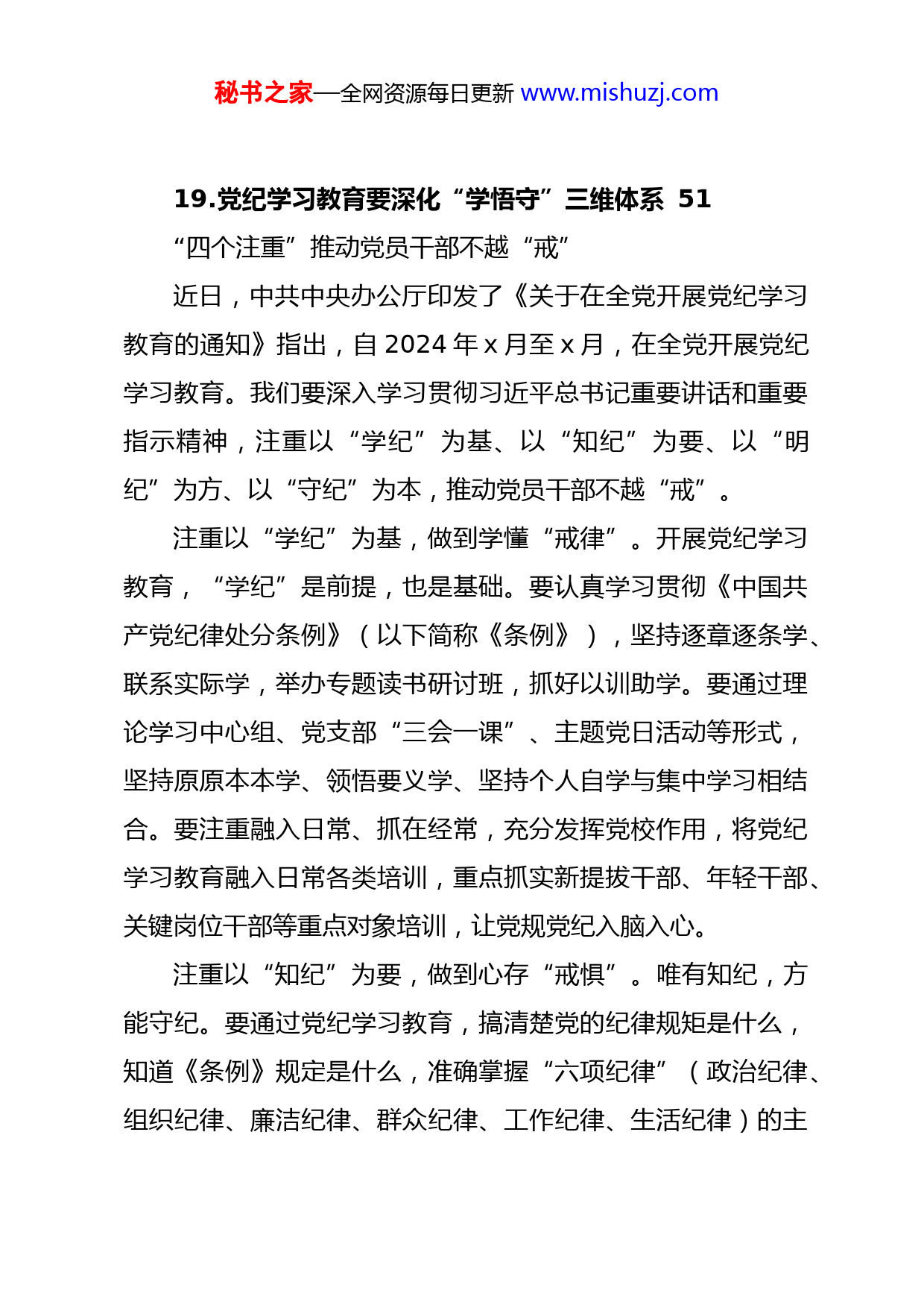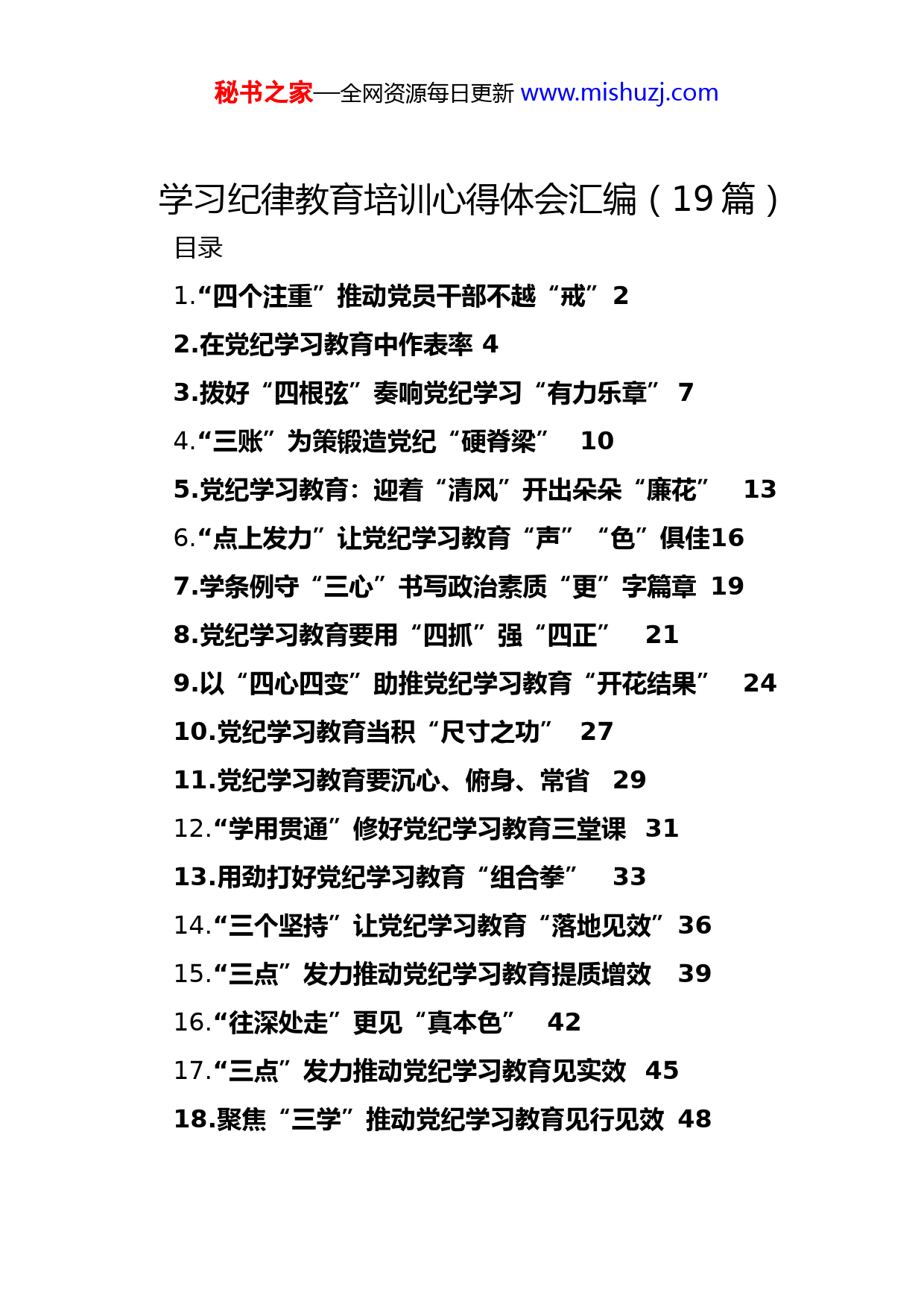 秘书之家—全网资源每日更新www.mishuzj.com学习纪律教育培训心得体会汇编(19篇)目录1.“四个注重”推动党员干部不越“戒”22.在党纪学习教育中作表率43.拨好“四根弦”奏响党纪学习“有力乐章”74.“三账”为策锻造党纪“硬脊梁”105.党纪学习教育:迎着“清风”开出朵朵“廉花”136.“点上发力”让党纪学习教育“声”“色”俱佳167.学条例守“三心”书写政治素质“更”字篇章198.党纪学习教育要用“四抓”强“四正”219.以“四心四变”助推党纪学习教育“开花结果”2410.党纪学习教育当积“尺寸之功”2711.党纪学习教育要沉心、俯身、常省2912.“学用贯通”修好党纪学习教育三堂课3113.用劲打好党纪学习教育“组合拳”3314.“三个坚持”让党纪学习教育“落地见效”3615.“三点”发力推动党纪学习教育提质增效3916.“往深处走”更见“真本色”4217.“三点”发力推动党纪学习教育见实效4518.聚焦“三学”推动党纪学习教育见行见效48秘书之家—全网资源每日更新www.mishuzj.com19.党纪学习教育要深化“学悟守”三维体系51“四个注重”推动党员干部不越“戒”近日,中共中央办公厅印发了《关于在全党开展党纪学习教育的通知》指出,自2024年x月至x月,在全党开展党纪学习教育。我们要深入学习贯彻习近平总书记重要讲话和重要指示精神,注重以“学纪”为基、以“知纪”为要、以“明纪”为方、以“守纪”为本,推动党员干部不越“戒”。注重以“学纪”为基,做到学懂“戒律”。开展党纪学习教育,“学纪”是前提,也是基础。要认真学习贯彻《中国共产党纪律处分条例》(以下简称《条例》),坚持逐章逐条学、联系实际学,举办专题读...