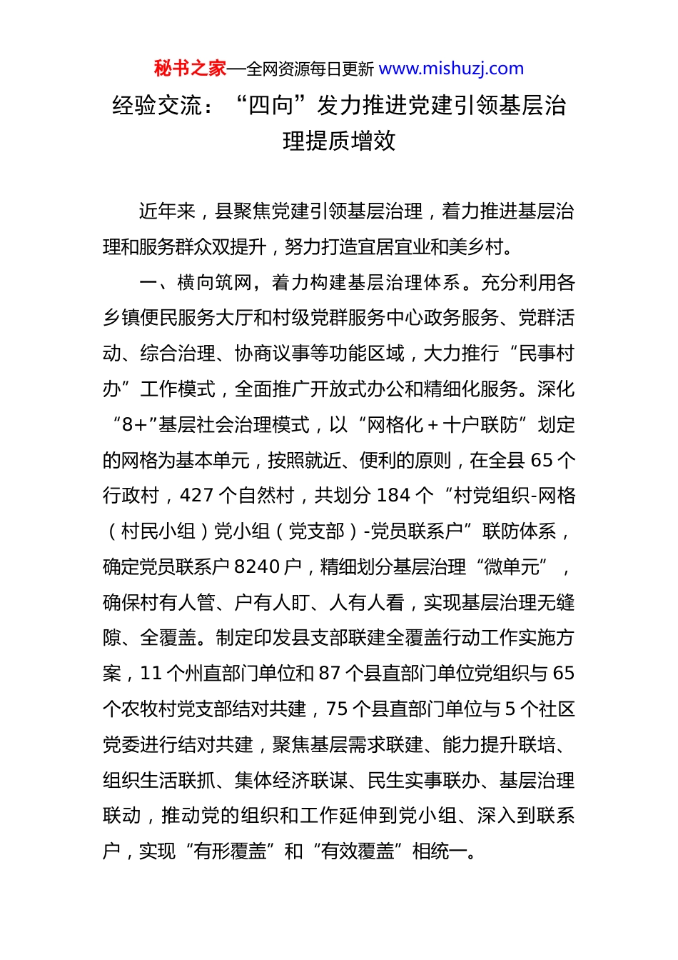 秘书之家—全网资源每日更新www.mishuzj.com经验交流:“四向”发力推进党建引领基层治理提质增效近年来,县聚焦党建引领基层治理,着力推进基层治理和服务群众双提升,努力打造宜居宜业和美乡村。一、横向筑网,着力构建基层治理体系。充分利用各乡镇便民服务大厅和村级党群服务中心政务服务、党群活动、综合治理、协商议事等功能区域,大力推行“民事村办”工作模式,全面推广开放式办公和精细化服务。深化“8+”基层社会治理模式,以“网格化+十户联防”划定的网格为基本单元,按照就近、便利的原则,在全县65个行政村,427个自然村,共划分184个“村党组织-网格(村民小组)党小组(党支部)-党员联系户”联防体系,确定党员联系户8240户,精细划分基层治理“微单元”,确保村有人管、户有人盯、人有人看,实现基层治理无缝隙、全覆盖。制定印发县支部联建全覆盖行动工作实施方案,11个州直部门单位和87个县直部门单位党组织与65个农牧村党支部结对共建,75个县直部门单位与5个社区党委进行结对共建,聚焦基层需求联建、能力提升联培、组织生活联抓、集体经济联谋、民生实事联办、基层治理联动,推动党的组织和工作延伸到党小组、深入到联系户,实现“有形覆盖”和“有效覆盖”相统一。秘书之家—全网资源每日更新www.mishuzj.com二、纵向夯基,着力强化基层治理保障。持续强化村级党组织政治功能和组织功能,不断健全“三级网格”责任体系和“四抓”工作机制,扎实推进“集体经济倍增、领办创办突破、基层治理创优、基层党务提标”四大行动,全县集体经济村均收入达到15万元以上、经营性收入5万元以上的村达到100%。牢固树立大抓基层、大抓支部鲜明导向,印发了《县培育储备村(社区)党组织书记后备力量工作方案》,着力培养出一批政治思想好、能力素质好、遵纪守法好、道德品行好、群众基础好的村(社区)党组织书记后备力量。同时坚持精培严管相结合,按照“干什么学什么、缺什么补什么”原则,举办好各级各类培训班次,做到所有村(社区)干部县级培训全覆盖,实现村(社区)干部能力素质、为民办事能力、基层治理能力持续提升。扎实开展流动党员和离退休党员摸底排查,确保每一名党员都能纳入党组织的有效管理,提高基层党员队伍建设质量。定期组织开展困难党员和老党员走访慰问活动,接续推进无职党员设岗定责和党员责任区、党员先锋岗创建活动,提升驾驭复杂局面、处理复杂矛盾的能力本领。三、轴向赋能,着力提升基层治理服务。积极践行“四下基层”优良传统,按照“村不漏户、户不漏人”工作要求,组织89个县直单位2834人,下沉5042人次,秘书之家—全网资源每日更新www.mishuzj.com以最直接、最真诚、最有效、最温暖、最贴心的方式,解决群众困难669件,帮办实事929件,资助资金(含物质折合)77.3万余元,政策法律法规宣讲5206次,排查化解矛盾纠纷385余件。常态化开展困境妇女儿童关爱工作,以“99公益”项目为载体,组建52支爱心队伍,发起“家家幸福一元捐”“春蕾计划”“母亲邮包”等公益项目,募集善款45856元。开展春蕾计划,资助中小学生26人65400元。参与天津团委希望工程1+1幻方助学计划,资助小学生25名25000元。确保群团组织始终与党组织在思想上同心同向、在目标上同心同力、在行动上同心同行。扎实开展“结对帮扶·爱心甘肃”活动,671名省州县三级结对干部,与14名孤儿,83名事实无人抚养儿童,276名分散特困供养人员,307名重度一、二级残疾人实现“一对一”精准结对,深入开展“爱心扶孤、爱心助残、爱心济困”行动,以实际行动汇聚大爱洪流,用实在成效赢得群众认可。四、径向提亮,着力创建基层治理品牌。全面开展“一乡镇一特色·一工委一亮点”基层党建示范点创建工作,针对性提出了抓党建促乡村振兴、党建引领乡村治理等19个打造规划,打造出“莓好”党建、“安心桑科”“绿色香告”“成长先锋”“石榴花开”“五心社区”等一批党建示范点,通过典型带动、示范引领,推动基层党秘书之家—全网资源每日更新www.mishuzj.com建引领基层治理工作从点上出彩到面上开花。升级拓展“民事村办”工作模式,结合半农半牧区生产生活实际,聚焦产业发展...