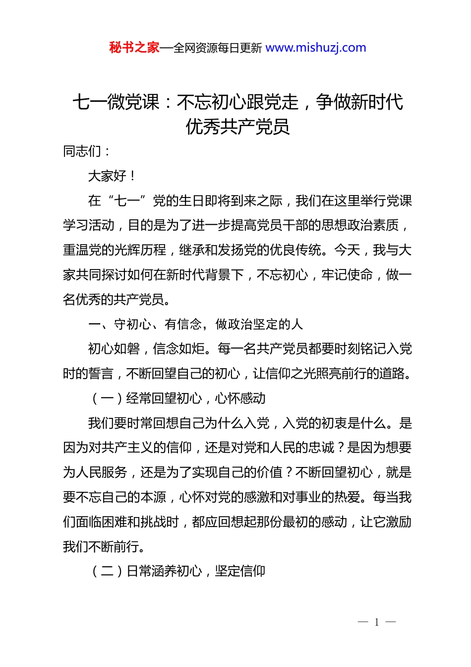 秘书之家—全网资源每日更新www.mishuzj.com七一微党课:不忘初心跟党走,争做新时代优秀共产党员同志们:大家好!在“七一”党的生日即将到来之际,我们在这里举行党课学习活动,目的是为了进一步提高党员干部的思想政治素质,重温党的光辉历程,继承和发扬党的优良传统。今天,我与大家共同探讨如何在新时代背景下,不忘初心,牢记使命,做一名优秀的共产党员。一、守初心、有信念,做政治坚定的人初心如磐,信念如炬。每一名共产党员都要时刻铭记入党时的誓言,不断回望自己的初心,让信仰之光照亮前行的道路。(一)经常回望初心,心怀感动我们要时常回想自己为什么入党,入党的初衷是什么。是因为对共产主义的信仰,还是对党和人民的忠诚?是因为想要为人民服务,还是为了实现自己的价值?不断回望初心,就是要不忘自己的本源,心怀对党的感激和对事业的热爱。每当我们面临困难和挑战时,都应回想起那份最初的感动,让它激励我们不断前行。(二)日常涵养初心,坚定信仰—1—秘书之家—全网资源每日更新www.mishuzj.com信仰是精神的支柱,是行动的指南。我们要通过不断学习党的理论,加深对党的认识,增强对党的信任。在日常工作和生活中,要时刻以党的标准要求自己,不断提高自己的思想政治觉悟,涵养自己的初心,使之更加坚定和纯洁。(三)坚决不忘初心,维护核心在新时代的征程上,我们要始终与党中央保持高度一致,坚决维护党中央的权威和集中统一领导。无论遇到什么困难和挑战,都要坚守初心,不忘本来,为实现中华民族伟大复兴的中国梦贡献力量。二、讲原则、守底线,做遵规蹈矩的人作为共产党员,我们要时刻牢记党的纪律和规矩,做到心中有党、心中有民、心中有责、心中有戒。(一)明是非在大是大非面前,我们要有清醒的认识和坚定的立场。要能够分辨对错,坚持正确的价值观和世界观,不被错误思潮所迷惑。(二)知敬畏对党的纪律和规矩,我们要怀有敬畏之心。要知道哪些可以做,哪些不可以做,不触碰红线,不越过底线。只有这样,我们才能始终保持共产党员的先进性和纯洁性。—2—秘书之家—全网资源每日更新www.mishuzj.com(三)立标杆作为共产党员,我们要以身作则,树立良好的榜样。在日常工作和生活中,要严格要求自己,做到言行一致,为人表率。通过我们的实际行动,去影响和带动周围的人。三、干实事、担责任,做履职担当的人实干兴邦,空谈误国。我们要以实际行动践行共产党员的初心和使命。(一)敢于负责、勇于担当面对困难和挑战,我们要敢于迎难而上,勇于承担责任。不推诿、不逃避,以实际行动解决问题,推动工作。(二)干在实处、干在难处我们要把工作落到实处,特别是在面对难题时,更要勇于攻坚克难。只有这样,我们才能真正做到为人民服务,为党的事业添砖加瓦。(三)我将无我、不负人民我们要始终把人民的利益放在首位,全心全意为人民服务在工作中,要时刻保持对人民的敬畏之心,用心去感受他们的需求和期望,用实际行动去回应他们的关切和期待。四、重品行、有情怀,做品德高尚的人作为共产党员,我们不仅要做到遵规守纪,还要注重个人—3—秘书之家—全网资源每日更新www.mishuzj.com品行和道德修养。(一)追求“一尘不染”,保持一颗赤子心我们要时刻保持清廉自守的品格,做到公私分明,廉洁奉公。无论面对何种诱惑,都要坚守自己的原则和底线,保持一颗纯净无瑕的赤子之心。(二)做到“两袖清风”,保持一颗自律心我们要时刻保持自律,做到清正廉洁,不拿群众一针一线只有这样,我们才能赢得群众的信任和尊重,树立良好的党员形象。(三)坚持“三思而行”,保持一颗公道心在处理问题和决策时,我们要深思熟虑,做到公平公正。不因私情而偏袒任何一方,始终坚守公道正派的立场。同志们,新时代赋予我们新的使命和责任。作为共产党员我们要时刻牢记自己的初心和使命,不断提高自己的思想政治素质,以实际行动践行党的宗旨和理念。让我们携手共进,砥砺前行,为实现中华民族伟大复兴的中国梦而努力奋斗!谢谢大家!—4—