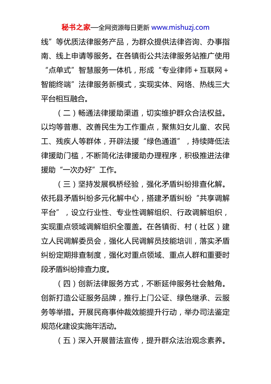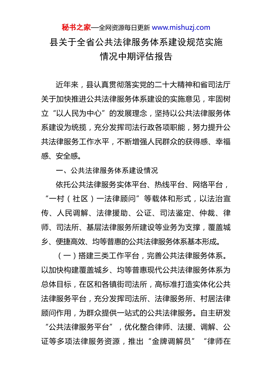 秘书之家—全网资源每日更新www.mishuzj.com县关于全省公共法律服务体系建设规范实施情况中期评估报告近年来,县认真贯彻落实党的二十大精神和省司法厅关于加快推进公共法律服务体系建设的实施意见,牢固树立“以人民为中心”的发展理念,坚持以公共法律服务体系建设为统揽,充分发挥司法行政各项职能,努力提升公共法律服务工作水平,不断增强人民群众的获得感、幸福感、安全感。一、公共法律服务体系建设情况依托公共法律服务实体平台、热线平台、网络平台,“一村(社区)一法律顾问”等载体和形式,以法治宣传、人民调解、法律援助、公证、司法鉴定、仲裁、律师、司法所、基层法律服务所建设等业务为支撑,覆盖城乡、便捷高效、均等普惠的公共法律服务体系基本形成。(一)搭建三类工作平台,完善公共法律服务体系。以加快构建覆盖城乡、均等普惠现代公共法律服务体系为总体目标,在区和各镇街司法所,高标准打造实体化公共法律服务平台,充分发挥司法所、法律服务所、村居法律顾问作用,为群众提供一站式的公共法律服务。自主研发“公共法律服务平台”,优化整合律师、法援、调解、公证等多项法律服务资源,推出“金牌调解员”“律师在秘书之家—全网资源每日更新www.mishuzj.com线”等优质法律服务产品,为群众提供法律咨询、办事指南、线上申请等服务。在各镇街公共法律服务站推广使用“点单式”智慧服务一体机,形成“专业律师+互联网+智能终端”法律服务新模式,实现实体、网络、热线三大平台相互融合。(二)畅通法律援助渠道,切实维护群众合法权益。以均等普惠、改善民生为工作重点,聚焦妇女儿童、农民工、残疾人等群体,开辟法援“绿色通道”,持续降低法律援助门槛,不断简化法律援助办理程序,积极推进法律援助“一次办好”工作。(三)坚持发展枫桥经验,强化矛盾纠纷排查化解。依托县矛盾纠纷多元化解中心,搭建矛盾纠纷“共享调解平台”,设立行业性、专业性调解组织、行政调解组织,实现重点领域调解组织全覆盖。在各镇街、村(社区)建立人民调解委员会,强化人民调解员技能培训,落实矛盾纠纷定期排查制度,强化对重点领域、重点人群和重要时段矛盾纠纷排查力度。(四)创新法律服务方式,不断延伸服务社会触角。创新打造公证服务品牌,推行上门公证、绿色继承、云服务等举措。开展民商事仲裁效能提升行动,举办司法鉴定规范化建设实施年活动。(五)深入开展普法宣传,提升群众法治观念素养。秘书之家—全网资源每日更新www.mishuzj.com深入实施“八五”普法规划,压实“谁执法谁普法”责任,分级分类开展“菜单式”精准普法。推进普法与依法治理有机融合,发挥“法治带头人”“法律明白人”作用,为基层换届选举、“三资”清理、矛盾纠纷化解等提供法律服务。强化基层法治文化建设,形成立体式法治文化阵地格局。二、存在的问题一是公共法律服务有效供给不足。镇(街道)法律服务资源不足,多数法律服务工作者担任多个村的法律顾问,时间及精力有限,每月到村提供法律服务的时间较少,未能及时解决群众法律诉求,难以满足群众对法律多元化需求。二是法律援助工作群众知晓度不高。法律援助宣传活动开展不够深入具体,群众对法律援助工作内容、受理条件、办理流程等了解程度不高,法律援助未能形成品牌化、社会化效应。三是基层调解队伍专业化能力不强。村(社区)调解组织中专职从事矛盾纠纷调解工作的人员占比少,多为村居两委成员兼职,吸收律师、法律服务工作者等专业人才不足。四是普法宣传实效性有待提升。“谁执法谁普法”普法责任制落实需进一步加强,普法活动开展形式多为现场秘书之家—全网资源每日更新www.mishuzj.com普法,普法与执法实践结合较少,普法群体针对性不强,群众参与热情不高。三、下一步工作打算(一)加强法律资源供给,满足多元法律需求。坚持需求导向,主动征求群众的法律服务需求,持续深化镇(街道)公共法律服务体系建设,综合运用互联网、云服务等数字化手段,打造“十五分钟法律服务圈”,切实解决公共法律服务“最后一公里”。(二)提升法律援助质效,维护群众合法权益。针对农民工、残疾人、老年人等特殊群体开展专项...