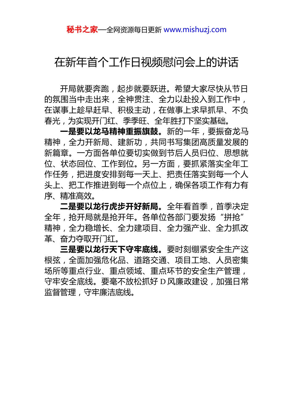 秘书之家—全网资源每日更新www.mishuzj.com在新年首个工作日视频慰问会上的讲话开局就要奔跑,起步就要跃进。希望大家尽快从节日的氛围当中走出来,全神贯注、全力以赴投入到工作中,在谋事上趁早赶早、积极主动,在做事上求早抓早、不负春光,为实现开门红、季季旺、全年胜打下坚实基础。一是要以龙马精神重振旗鼓。新的一年,要振奋龙马精神,全力开新局、建新功,共同书写集团高质量发展的新篇章。一方面各单位要切实做到节后人员归位、思想就位、状态回位、工作到位。另一方面,要抓紧落实全年工作任务,把进度安排到每一天上、把责任落实到每一个人头上、把工作推进到每一个点位上,确保各项工作有力有序、精准高效。二是要以龙行虎步开好新局。全年看首季,首季决定全年,抢开局就是抢开年。各单位各部门要发扬“拼抢”精神,全力稳增长、全力建项目、全力强产业、全力抓改革、奋力夺取开门红。三是要以龙行天下守牢底线。要时刻绷紧安全生产这根弦,全面加强危化品、道路交通、项目工地、人员密集场所等重点行业、重点领域、重点环节的安全生产管理,守牢安全底线。要毫不放松抓好D风廉政建设,加强日常监督管理,守牢廉洁底线。