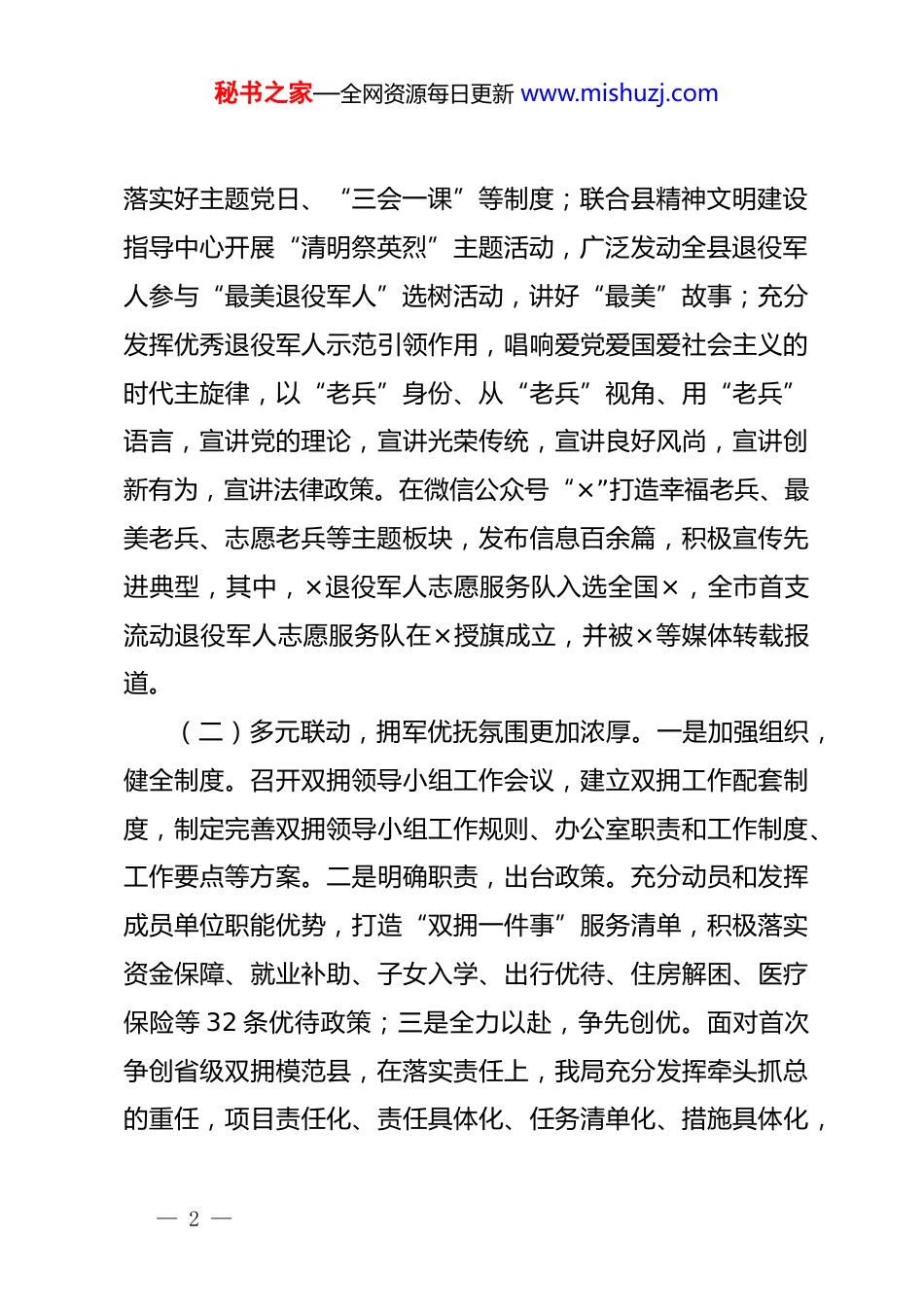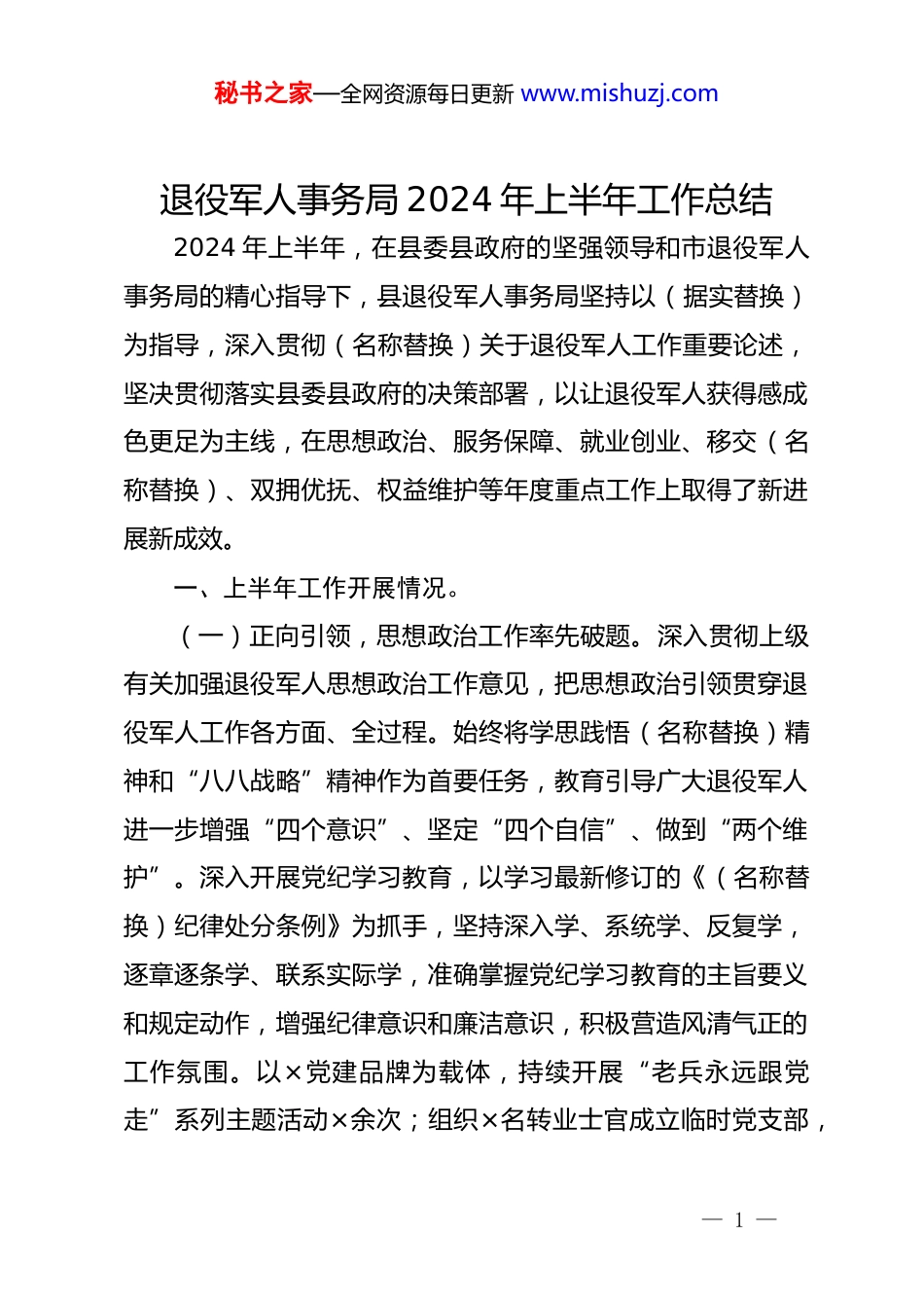 秘书之家—全网资源每日更新www.mishuzj.com退役军人事务局2024年上半年工作总结2024年上半年,在县委县政府的坚强领导和市退役军人事务局的精心指导下,县退役军人事务局坚持以(据实替换)为指导,深入贯彻(名称替换)关于退役军人工作重要论述,坚决贯彻落实县委县政府的决策部署,以让退役军人获得感成色更足为主线,在思想政治、服务保障、就业创业、移交(名称替换)、双拥优抚、权益维护等年度重点工作上取得了新进展新成效。一、上半年工作开展情况。(一)正向引领,思想政治工作率先破题。深入贯彻上级有关加强退役军人思想政治工作意见,把思想政治引领贯穿退役军人工作各方面、全过程。始终将学思践悟(名称替换)精神和“八八战略”精神作为首要任务,教育引导广大退役军人进一步增强“四个意识”、坚定“四个自信”、做到“两个维护”。深入开展党纪学习教育,以学习最新修订的《(名称替换)纪律处分条例》为抓手,坚持深入学、系统学、反复学,逐章逐条学、联系实际学,准确掌握党纪学习教育的主旨要义和规定动作,增强纪律意识和廉洁意识,积极营造风清气正的工作氛围。以×党建品牌为载体,持续开展“老兵永远跟党走”系列主题活动×余次;组织×名转业士官成立临时党支部,—1—秘书之家—全网资源每日更新www.mishuzj.com落实好主题党日、“三会一课”等制度;联合县精神文明建设指导中心开展“清明祭英烈”主题活动,广泛发动全县退役军人参与“最美退役军人”选树活动,讲好“最美”故事;充分发挥优秀退役军人示范引领作用,唱响爱党爱国爱社会主义的时代主旋律,以“老兵”身份、从“老兵”视角、用“老兵”语言,宣讲党的理论,宣讲光荣传统,宣讲良好风尚,宣讲创新有为,宣讲法律政策。在微信公众号“×”打造幸福老兵、最美老兵、志愿老兵等主题板块,发布信息百余篇,积极宣传先进典型,其中,×退役军人志愿服务队入选全国×,全市首支流动退役军人志愿服务队在×授旗成立,并被×等媒体转载报道。(二)多元联动,拥军优抚氛围更加浓厚。一是加强组织,健全制度。召开双拥领导小组工作会议,建立双拥工作配套制度,制定完善双拥领导小组工作规则、办公室职责和工作制度、工作要点等方案。二是明确职责,出台政策。充分动员和发挥成员单位职能优势,打造“双拥一件事”服务清单,积极落实资金保障、就业补助、子女入学、出行优待、住房解困、医疗保险等32条优待政策;三是全力以赴,争先创优。面对首次争创省级双拥模范县,在落实责任上,我局充分发挥牵头抓总的重任,项目责任化、责任具体化、任务清单化、措施具体化,—2—秘书之家—全网资源每日更新www.mishuzj.com确保得分项不失分,加分项拿高分。在营造氛围上,精心策划拍摄×高质量宣传片,全县户外大型LED、室内宣传屏展播,尤其是重点县域双拥氛围浓厚,如动车南站出入口、×大道两侧。在阵地打造上,打造了双拥商业街多少条,提升了多少个双拥共建点迎接省考评组实地检查,全领域渲染全县双拥氛围。在台账迎检上,面临四年来的台账,纵横系统性梳理,结合检查清单全面整理完善台账。四是提升扩能,延伸领域。升级“双拥联盟”,贯通“×”应用,推广“老兵码”,与×等54家单位签订拥军协议,提供优先优惠优质服务。(三)用心用情,服务保障水平提档升级。对标新一轮省级新时代枫桥式退役军人服务站创建要求,持续推进服务站建设工作。拟新创×街道退役军人服务站为省枫桥式服务站完成阵地建设,打造我县首家高校退役军人服务站,升级×派出所退役军人服务站、崇军驿站等特色阵地;以×大道和×大道沿线为重点,进一步丰富“双拥商旅”和“红色文旅”两条崇军服务示范带;以“智治平台”为载体,坚持“一站一特色”,全面提升服务质量,在植树节、清明节、劳动节、端午节期间,组织开展植树、祭扫、包粽子等主题活动×余场次,其中,×端午特色主题活动被中国网等媒体报道。全面落实常态化联系退役军人工作制度,将风险排查和矛盾纠纷化解融入常态化走—3—秘书之家—全网资源每日更新www.mishuzj.com访、座谈慰问中,变坐等“来访”为主动“走访”,为矛盾纠纷的有效化解奠定基础,上...