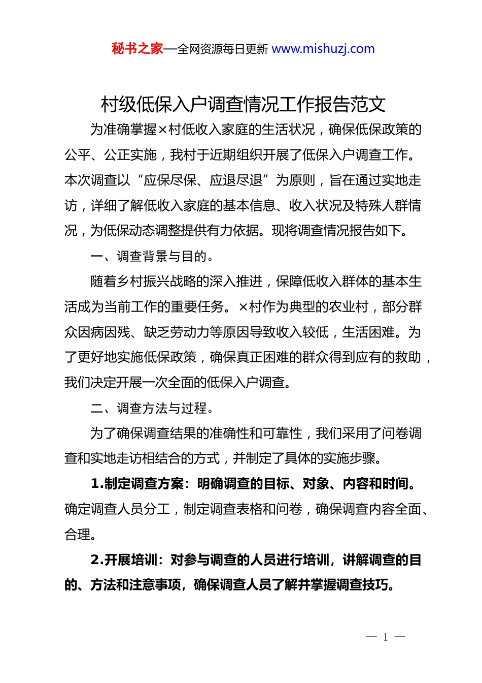 秘书之家—全网资源每日更新www.mishuzj.com村级低保入户调查情况工作报告范文为准确掌握×村低收入家庭的生活状况,确保低保政策的公平、公正实施,我村于近期组织开展了低保入户调查工作。本次调查以“应保尽保、应退尽退”为原则,旨在通过实地走访,详细了解低收入家庭的基本信息、收入状况及特殊人群情况,为低保动态调整提供有力依据。现将调查情况报告如下。一、调查背景与目的。随着乡村振兴战略的深入推进,保障低收入群体的基本生活成为当前工作的重要任务。×村作为典型的农业村,部分群众因病因残、缺乏劳动力等原因导致收入较低,生活困难。为了更好地实施低保政策,确保真正困难的群众得到应有的救助,我们决定开展一次全面的低保入户调查。二、调查方法与过程。为了确保调查结果的准确性和可靠性,我们采用了问卷调查和实地走访相结合的方式,并制定了具体的实施步骤。1.制定调查方案:明确调查的目标、对象、内容和时间。确定调查人员分工,制定调查表格和问卷,确保调查内容全面、合理。2.开展培训:对参与调查的人员进行培训,讲解调查的目的、方法和注意事项,确保调查人员了解并掌握调查技巧。—1—秘书之家—全网资源每日更新www.mishuzj.com3.发放问卷:将问卷发放给目标家庭,告知调查目的和填写要求,确保被调查者能够准确、完整地填写问卷。4.实地走访:对问卷调查中发现的疑似低收入家庭进行实地走访。走访时,调查人员需携带相关证件,尊重被调查者的隐私和意愿。5.数据收集与整理:收回填写好的问卷,对数据进行整理、分类和编码。对实地走访中收集的信息进行记录和整理。6.数据分析:运用统计分析方法对收集到的数据进行分析,找出低收入家庭的共同特征和问题,为低保政策调整提供依据。7.结果反馈:将调查结果反馈给相关部门和人员,对存在的问题进行讨论和解决。对需要进一步核实的信息进行补充调查。8.总结经验:对整个调查过程进行总结,提炼经验教训,为今后的调查工作提供参考。三、调查结果与分析1.家庭基本信息:通过调查,我们共收集到×村低保户及疑似低收入家庭的基本信息500余份。这些家庭主要分布在村里的各个村民小组,以老年人口、残疾人口和因病致贫家庭为主。其中,60岁以上老年人口占比达到40%,残疾人家庭占比约为30%,因病致贫家庭占比约为20%。2.收入状况分析:根据调查结果,×村低保户及疑似低收—2—秘书之家—全网资源每日更新www.mishuzj.com入家庭的收入来源主要包括农业收入、务工收入、低保金和其他政府补贴等。其中,农业收入是主要收入来源,但由于受自然灾害、市场波动等因素影响,收入不(名称替换)。务工收入占比较低,且多数为短期零工,收入水平较低。低保金和其他政府补贴成为这些家庭的重要收入补充。在收入水平方面,×村低保户及疑似低收入家庭的年收入普遍偏低。根据调查数据,这些家庭的年收入大多在5000元以下,其中部分家庭年收入甚至低于3000元。这些收入水平远低于当地平均水平,生活困难。3.特殊人群情况:在本次调查中,我们还重点关注了特殊人群的情况。这些人群主要包括老年人、残疾人、重病患者等。他们由于身体原因或疾病导致劳动能力丧失或减弱,收入来源有限,生活更加困难。在×村,这部分人群主要集中在低保户家庭中。针对这些特殊人群,我们采取了更加细致的调查方式。除了了解他们的基本信息、收入状况外,还重点了解了他们的身体状况、医疗需求、照料情况等。同时,我们还积极宣传相关救助政策,鼓励他们积极申请救助,提高生活质量。4.收入数据分析:通过对收集到的收入数据进行整理分析,我们发现×村低保户及疑似低收入家庭的收入呈现以下特点:一是收入来源单—3—秘书之家—全网资源每日更新www.mishuzj.com一,主要依靠农业收入和低保金;二是收入水平普遍偏低,远低于当地平均水平;三是特殊人群收入状况更为困难,需要重点关注和救助。通过本次低保入户调查,我们详细了解了×村低收入家庭的基本信息和收入状况,为低保动态调整提供了有力依据。针对调查结果,我们提出以下建议:1.加强低保政策宣传,提高群众对低保政策的认知度和认同感。2.完善低保认定机制,确保真正困难的...