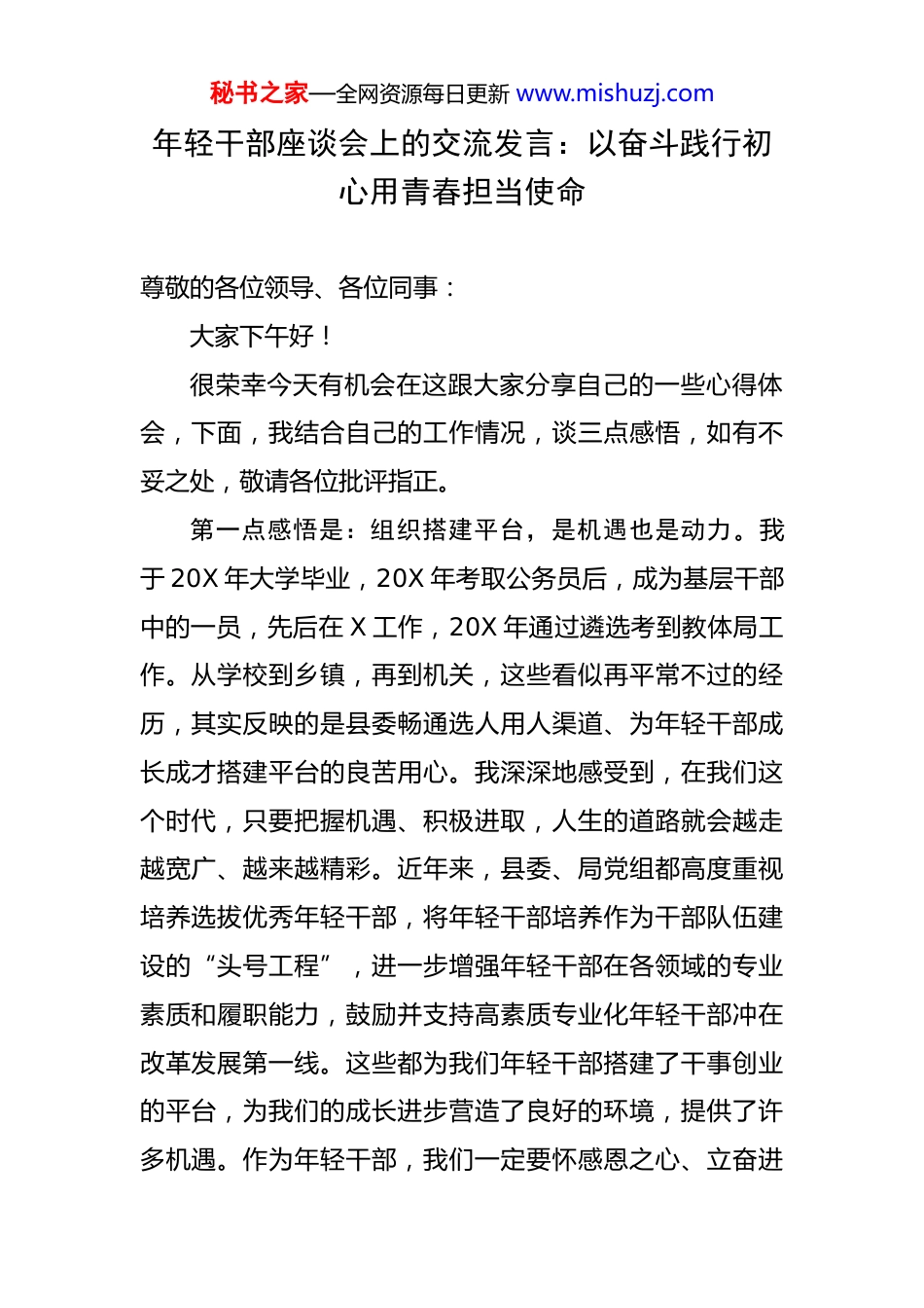 秘书之家—全网资源每日更新www.mishuzj.com年轻干部座谈会上的交流发言:以奋斗践行初心用青春担当使命尊敬的各位领导、各位同事:大家下午好!很荣幸今天有机会在这跟大家分享自己的一些心得体会,下面,我结合自己的工作情况,谈三点感悟,如有不妥之处,敬请各位批评指正。第一点感悟是:组织搭建平台,是机遇也是动力。我于20X年大学毕业,20X年考取公务员后,成为基层干部中的一员,先后在X工作,20X年通过遴选考到教体局工作。从学校到乡镇,再到机关,这些看似再平常不过的经历,其实反映的是县委畅通选人用人渠道、为年轻干部成长成才搭建平台的良苦用心。我深深地感受到,在我们这个时代,只要把握机遇、积极进取,人生的道路就会越走越宽广、越来越精彩。近年来,县委、局党组都高度重视培养选拔优秀年轻干部,将年轻干部培养作为干部队伍建设的“头号工程”,进一步增强年轻干部在各领域的专业素质和履职能力,鼓励并支持高素质专业化年轻干部冲在改革发展第一线。这些都为我们年轻干部搭建了干事创业的平台,为我们的成长进步营造了良好的环境,提供了许多机遇。作为年轻干部,我们一定要怀感恩之心、立奋进秘书之家—全网资源每日更新www.mishuzj.com之志,脚踏实地、爱岗敬业,努力在自己的岗位上创造一流业绩,立志成为能担重任的栋梁之才。只有这样,才能不辜负组织的教育、关爱和培养,才能不辜负领导的良苦用心。第二点感悟是:工作中有甘苦,是历练也是成长。当今社会是一个知识爆炸的信息时代,知识更新的速度前所未有,有一种“知识折旧定律”指出,一个人一年不学习,所拥有的全部知识就会折旧80%,只有以每年6%—10%的速度更新知识,才能适应未来社会的发展。如果我们没有不断学习新知识,而且旧知识也没有更新,那么今后在社会上生存肯定将“举步维艰”。这就要求我们时刻保持谦虚的求知态度,始终秉持“空杯心态”,坚持把学习作为提升自身业务本领和综合素质的重要途径,有针对性地学习掌握做好本职工作、履行岗位职责所必备的管理、法律等各种专业知识,不断提升履职尽责的工作本领,努力使自己真正成为本职工作的行家里手,更好适应岗位要求。7年的工作经历,让我深刻感受到,不论是从事什么样的工作,吃什么样的苦总会有什么样的收获。特别是进入教体局工作以来,我最深的体会就是只有勤学多思、甘愿吃苦,不断提高个人综合素质和业务能力,才能站得更高、看得更远、想得更深,才能跟得上时代的潮流、跟得上发展的步伐。秘书之家—全网资源每日更新www.mishuzj.com第三点感悟是:人生要有信仰,是追求也是责任。作为机关干部,虽然我们平时工作范围局限于某个特定领域、干的是一件件具体事情,但在“脚踏实地”的同时,我们也必须注重“仰望星空”,时刻关注中央大政方针和上级党委决策部署,自觉增强大局意识,努力跳出一时一事、一个股室、一个岗位的局限,正确处理局部与全局、个人与整体、当前与长远的关系,在工作中坚决贯彻落实中央和省委、市委、县委决策部署。特别是作为共产党员,我们更要时刻保持对党忠诚,对党忠诚不是空洞的、虚无的,更不是我们写材料的时候拿来做官话套话的。这种忠诚不在于喊了多少口号,而在于有多少实际行动;不在于应景式的表态,而在于关键时刻的旗帜鲜明。实际上,我们能干点啥、我们干出了些啥,群众的眼睛都是雪亮的,组织上也都是看得到的。因此,我们一定要当老实人、讲老实话、做老实事,实实在在地把本职工作干好,不搞自我包装、自我设计,不搞花架子、做表面文章,更不能弄虚作假、瞒上欺下,要聚精会神把工作做实做细做出彩,努力在平凡的岗位成就不平凡的人生。最后,再次对组织的培养、领导的关心、同事的帮助表示衷心感谢。在未来的日子里,我将把组织的期盼转化为工作的动力,将领导的重视形成工作的实绩,以一往无前的精神状态和永不懈怠的奋斗姿态继续砥砺前行。秘书之家—全网资源每日更新www.mishuzj.com谢谢大家!