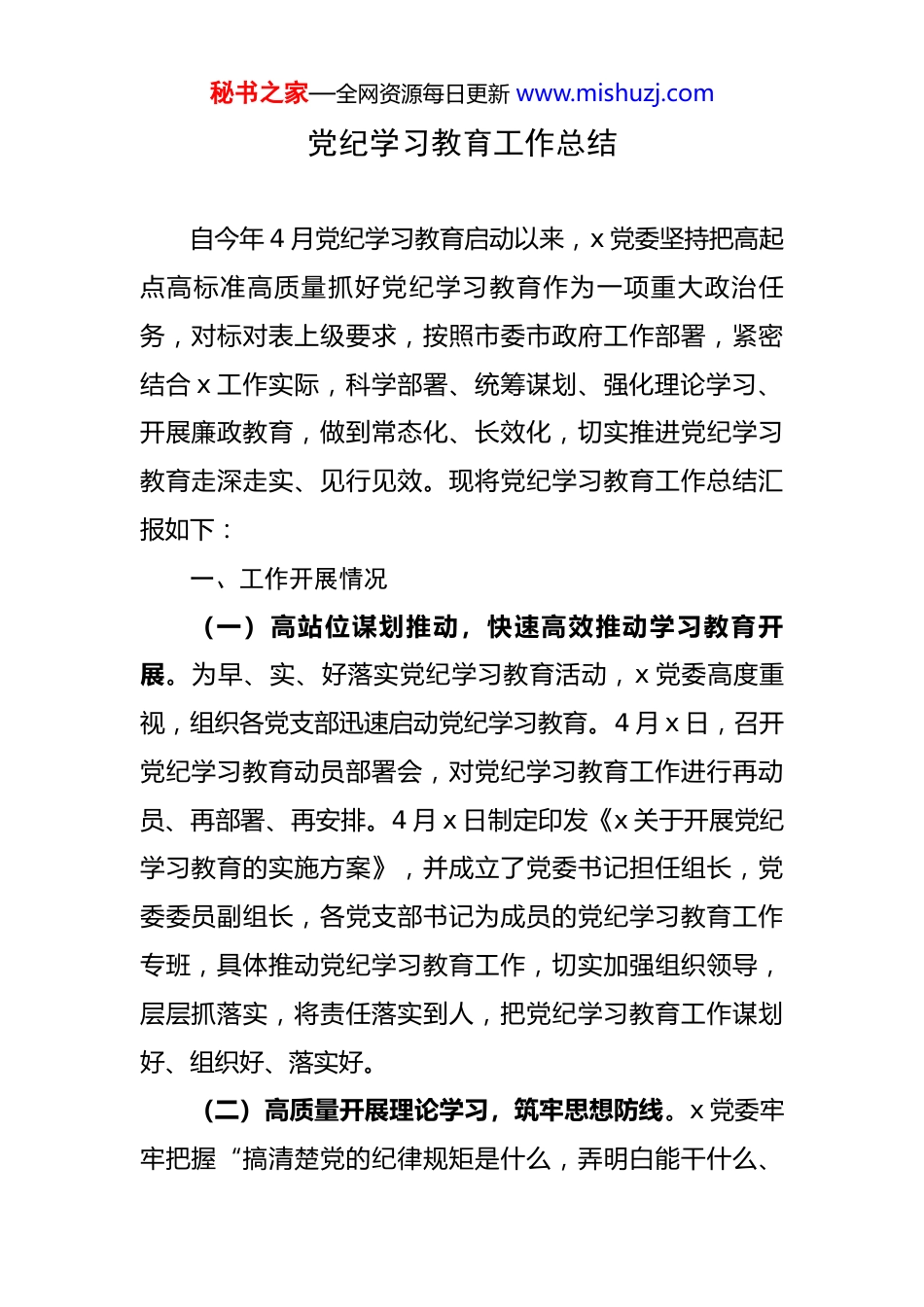 秘书之家—全网资源每日更新www.mishuzj.com党纪学习教育工作总结自今年4月党纪学习教育启动以来,x党委坚持把高起点高标准高质量抓好党纪学习教育作为一项重大政治任务,对标对表上级要求,按照市委市政府工作部署,紧密结合x工作实际,科学部署、统筹谋划、强化理论学习、开展廉政教育,做到常态化、长效化,切实推进党纪学习教育走深走实、见行见效。现将党纪学习教育工作总结汇报如下:一、工作开展情况(一)高站位谋划推动,快速高效推动学习教育开展。为早、实、好落实党纪学习教育活动,x党委高度重视,组织各党支部迅速启动党纪学习教育。4月x日,召开党纪学习教育动员部署会,对党纪学习教育工作进行再动员、再部署、再安排。4月x日制定印发《x关于开展党纪学习教育的实施方案》,并成立了党委书记担任组长,党委委员副组长,各党支部书记为成员的党纪学习教育工作专班,具体推动党纪学习教育工作,切实加强组织领导,层层抓落实,将责任落实到人,把党纪学习教育工作谋划好、组织好、落实好。(二)高质量开展理论学习,筑牢思想防线。x党委牢牢把握“搞清楚党的纪律规矩是什么,弄明白能干什么、秘书之家—全网资源每日更新www.mishuzj.com不能干什么”主题,按照党纪学习教育工作安排部署,x党委先学一步,学深一层,及时跟进学习习近平总书记关于党纪学习教育的重要讲话和重要指示精神,原原本本、逐章逐条学习新修订《条例》;结合工作实际,制定了党支部学习计划,为各支部发放《中国共产党纪律处分条例》等学习书籍。坚持把加强理论武装作为党纪学习教育的重中之重,推动广大党员干部深学细悟党的创新理论。各党(总)支部迅速启动,召开党纪学习教育部署会。在学习贯彻《中国共产党纪律处分条例》上下功夫见成效,坚持逐章逐条学、逐字逐字记、联系实际学,抓好以案促学、以赛助学、以训帮学,教育引导党员干部准确掌握其主旨要义和规定要求,进一步明确日常言行的衡量标尺,用党规党纪校正思想和行动,真正使学习党纪的过程成为增强纪律意识、提高党性修养的提升过程,夯实坚定拥护“两个确立”、坚决做到“两个维护”的思想根基,不断增进政治认同、思想认同、理论认同、情感认同。截至目前已开展党委理论学习中心组集中学习共计x次,其中,开展专题研讨3次;各党支部依据“三会一课”、主题党日等形式开展集中学习累计x次,确保党纪学习教育全覆盖、全方位融入日常、抓在平常、落于经常。(三)高标准开展警示教育,做到知行合一。一是为扎实开展党纪学习教育工作,落实纪委下发《关于开展x秘书之家—全网资源每日更新www.mishuzj.com活动实施方案》要求,x党委结合工作实际,以宣讲一堂廉政教育党课,开展一次廉政教育谈话、签订一次党风廉政承诺书、开展一次警示教育活动、组织一次理论知识测试为载体,认真组织党员干部常态化开展学习贯彻落实习近平新时代中国特色社会主义思想和习近平总书记重要讲话重要指示精神学习。一是各支部充分利用“三会一课”等形式,通过多形式开展党的纪律学习宣传教育,认真组织党员干部学习贯彻落实习近平总书记关于开展党纪学习教育重要讲话、指示精神,利用线上纪检监察网站发布的违法违纪反面典型案例开展廉政教育;二是组织各党支部排查整顿党建设施,对陈旧的宣传板进行更换,对党建学习资料进行归集,印发党纪学习相关资料。三是各党支部书记带头讲廉政党课,以通俗易懂的语言宣读新《条例》;党委领导班子到各自党建联系点开展指导学,带头宣讲,带头解惑答疑;党委理论学习中心组认真开展学习研讨,对照《条例》谈体会、找差距、谈工作,讲改进措施,进一步深化了对加强党的纪律建设重要性和忽视党纪、违反党纪问题危害性的认识,达到了统一思想认识、凝聚智慧力量、鼓舞干劲斗志的目的,切实将党纪学习教育成果转化为工作实践成果。四是组织全体干部签订了“党纪承诺书”,营造从严从紧抓纪律的氛围,共签订“党纪承诺书”x份。截至目前,开展反面警示教育x次,推动形成遵秘书之家—全网资源每日更新www.mishuzj.com规守纪、清正廉洁的浓厚氛围。二、下一步工作重点一是坚持横向到边、纵向到底,推动党纪学习教育走...