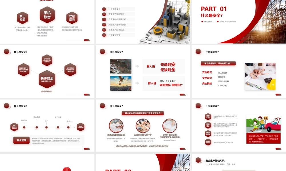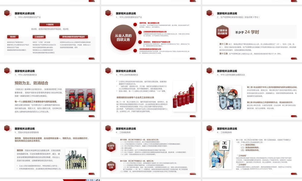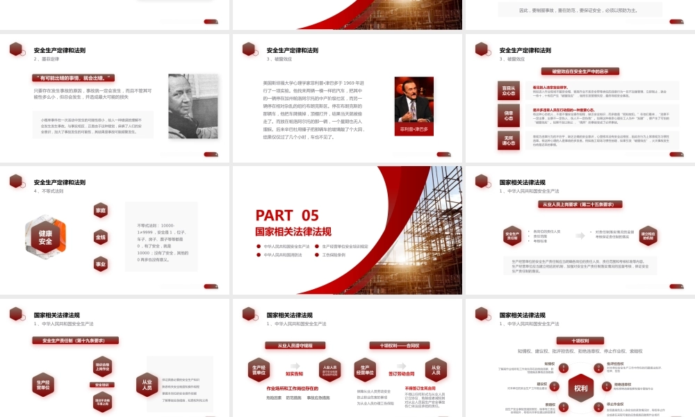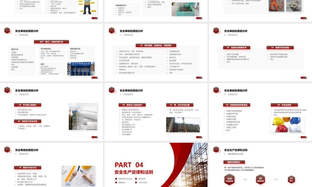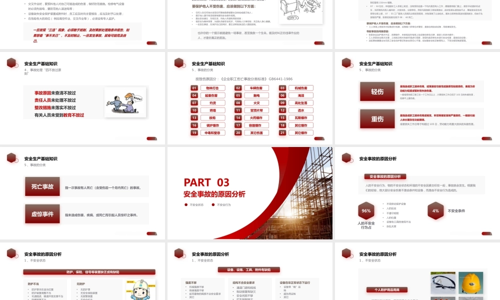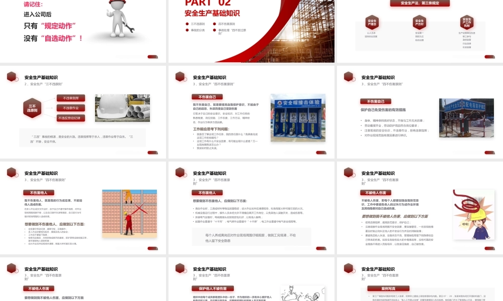 1员工安全教育培训BC2友情提示禁止吸烟手机静音欢迎提问--请将您手机改为“震动”避免在课室里使用手机--交谈其他事宜--随意进出教室--提问题和积极回答问题--随时指出授课内容的不当之处为了大家的健康,请您不要在室内抽烟。3CONTENTS1什么是安全?安全生产基础知识安全事故的原因分析安全生产定律和法则国家相关法律法规23455行业安全禁令4PART01什么是安全?什么是安全?为什么要学习安全知识5什么是安全?关于安全你能想到什么?现金和银行卡不能丢了或被偷(财产安全)烂了的苹果不能吃要扔掉(食品安全)想想还有吗?过马路要看红绿灯避让车辆(交通安全)6什么是安全?有人说有人说无危则安无缺则全因为一旦发生事故轻则受伤重则死亡7学习安全知识,让你化险为夷安全意识安全知识安全技能本人的预防隐患识别风险评估过程STOP文化什么是安全?8什么是安全?职业疾病财产损失健康伤害死亡其他…….我得想想办法干掉他们生活及生产的目标安全管理就是针对人们活动过程的安全问题,运用有效资源,进行有关决策、计划、组织和控制等活动,实现活动过程中人与客观物质环境的和谐,始终保持安全状态,达到活动目标的实现。9即存在着哪些可能的危险、危害因素。活动过程的危害识别可能的危险、危害因素能造成多大的伤害。这种因素将造成多大损失,能否接受。活动过程的风险评价保持良好的安全状态针对不能接受的伤害采取安全预防措施什么是安全?解决安全状态问题就要进行安全管理工作将这三个过程由人的自发行为转变为自觉行为,由被动行为转变为主动行为。10什么是安全?危害识别风险评价采取安全措施最终实现活动目标在穿越马路前,左右看看有没有上下行的汽车有上下行的汽车则对汽车的行驶速度和距离以及自己的速度作出计算判断,是否在马路中间与汽车相交当与汽车在马路中间相交的可能性很大时,自己停下来,让汽车先过。最后在没有危险时,再穿过马路以过马路为例,了解一下如何进行“危害识别”、“风险评价”、“采取安全措施”和最终安全通过。11请记住:进入公司后只有“规定动作”没有“自选动作”!12PART02安全生产基础知识三不违原则四不伤害原则事故的分类事故处理“四不放过原则”13安全生产基础知识1、安全生产的管理理念、方针、机制安全生产法,第三条规定安全生产理念安全生产方针安全生产工作机制以人为本坚持安全发展安全第一预防为主综合治理生产经营单位负责职工参与政府监管行业自律社会监督14安全生产基础知识2、安全生产“三不违原则”三不违原则不违章指挥不违反劳动纪律不违章作业“三违”事故的根源,是安全的大敌。违章指挥等于杀人,违章作业等于自杀。“三违”不除,安全不保。15安全生产基础知识3、安全生产“四不伤害原则”不伤害自己我不伤害自己,就是要提高自我保护意识,不能由于自己的疏忽、失误而使自己受到伤害它取决于自己的安全意识、安全知识、对工作任务的熟悉程度、岗位技能、工作态度、工作方法、精神状态、作业行为等多方面因素。•我是否了解这项工作任务,我的责任是什么?我具备完成这项工作的技能吗?•这项工作有什么不安全因素,有可能出现什么差错?万一出现故障我该怎么办?•我该如何防止失误。工作前应思考下列问题:16安全生产基础知识3、安全生产“四不伤害原则”不伤害自己保护自己免受伤害的有效措施•身体、精神保持良好状态,不做与工作无关的事;•劳动着装齐全,劳动防护用品符合岗位要求;•注意现场的安全标识,不违章作业,拒绝违章指挥;•对作业现场危险有害因素进行辨识。17安全生产基础知识3、安全生产“四不伤害原则”不伤害他人我不伤害他人,就是我的行为或后果,不能给他人造成伤害。在多人作业或交叉作业时,由于自己不遵守操作规程,对作业现场周围观察不够,以及自己操作失误等原因,自己的行为可能对现场周围的人造成伤害。•自觉遵守劳动纪律,遵章守规,正确操作;•多人作业时要相互配合,要顾及他人的安全;•工作后不要留下隐患;•检修完设备后,未将拆除或移开的盖板,防护罩等设施恢复正常,就可能使他人受到伤害;•动火作业完毕后现场未清理,残留火种可能引发火情。想要做到不伤害他...