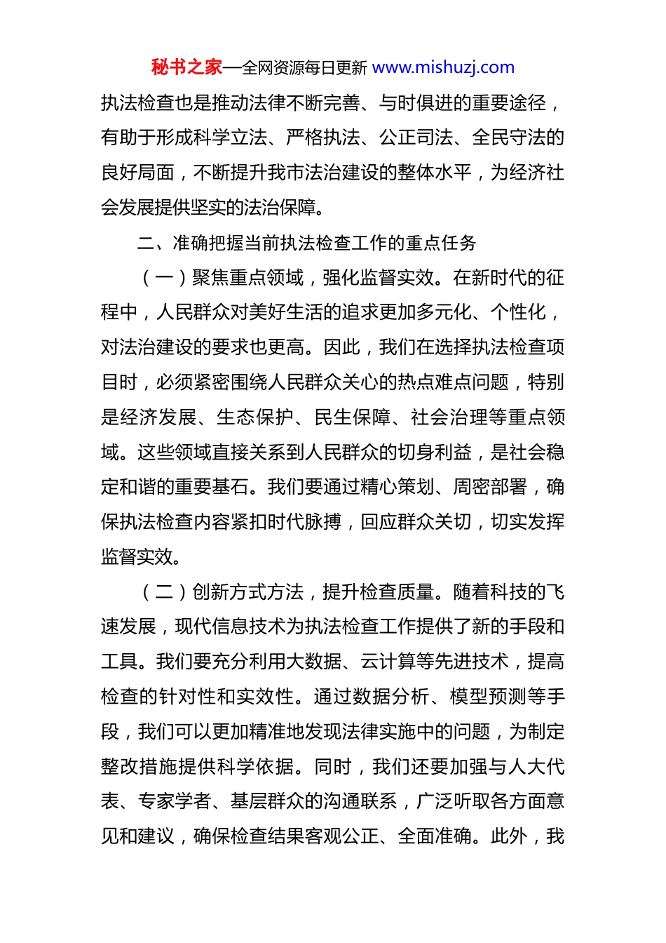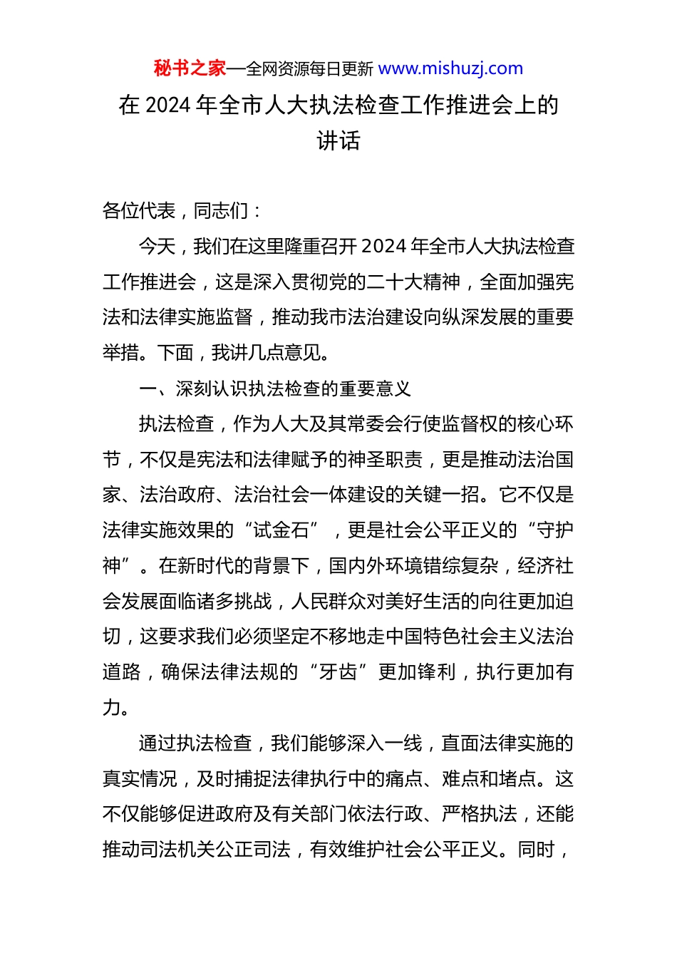 秘书之家—全网资源每日更新www.mishuzj.com在2024年全市人大执法检查工作推进会上的讲话各位代表,同志们:今天,我们在这里隆重召开2024年全市人大执法检查工作推进会,这是深入贯彻党的二十大精神,全面加强宪法和法律实施监督,推动我市法治建设向纵深发展的重要举措。下面,我讲几点意见。一、深刻认识执法检查的重要意义执法检查,作为人大及其常委会行使监督权的核心环节,不仅是宪法和法律赋予的神圣职责,更是推动法治国家、法治政府、法治社会一体建设的关键一招。它不仅是法律实施效果的“试金石”,更是社会公平正义的“守护神”。在新时代的背景下,国内外环境错综复杂,经济社会发展面临诸多挑战,人民群众对美好生活的向往更加迫切,这要求我们必须坚定不移地走中国特色社会主义法治道路,确保法律法规的“牙齿”更加锋利,执行更加有力。通过执法检查,我们能够深入一线,直面法律实施的真实情况,及时捕捉法律执行中的痛点、难点和堵点。这不仅能够促进政府及有关部门依法行政、严格执法,还能推动司法机关公正司法,有效维护社会公平正义。同时,秘书之家—全网资源每日更新www.mishuzj.com执法检查也是推动法律不断完善、与时俱进的重要途径,有助于形成科学立法、严格执法、公正司法、全民守法的良好局面,不断提升我市法治建设的整体水平,为经济社会发展提供坚实的法治保障。二、准确把握当前执法检查工作的重点任务(一)聚焦重点领域,强化监督实效。在新时代的征程中,人民群众对美好生活的追求更加多元化、个性化,对法治建设的要求也更高。因此,我们在选择执法检查项目时,必须紧密围绕人民群众关心的热点难点问题,特别是经济发展、生态保护、民生保障、社会治理等重点领域。这些领域直接关系到人民群众的切身利益,是社会稳定和谐的重要基石。我们要通过精心策划、周密部署,确保执法检查内容紧扣时代脉搏,回应群众关切,切实发挥监督实效。(二)创新方式方法,提升检查质量。随着科技的飞速发展,现代信息技术为执法检查工作提供了新的手段和工具。我们要充分利用大数据、云计算等先进技术,提高检查的针对性和实效性。通过数据分析、模型预测等手段,我们可以更加精准地发现法律实施中的问题,为制定整改措施提供科学依据。同时,我们还要加强与人大代表、专家学者、基层群众的沟通联系,广泛听取各方面意见和建议,确保检查结果客观公正、全面准确。此外,我秘书之家—全网资源每日更新www.mishuzj.com们还可以探索引入第三方评估机构参与执法检查,提高检查的独立性和专业性。(三)强化跟踪问效,推动问题整改。执法检查的目的在于发现问题、解决问题。对于检查中发现的问题,我们不能仅仅停留在指出问题的层面,更要注重跟踪问效,推动相关部门和单位切实整改。我们要坚持问题导向,敢于动真碰硬,督促相关部门和单位制定具体可行的整改措施,并明确整改时限和责任人。同时,我们还要建立健全长效机制,加强对整改情况的跟踪督查和评估验收,确保问题得到彻底解决。对于整改不力、敷衍塞责的部门和单位,我们要依法依规追究责任,形成有力震慑。只有这样,我们才能确保执法检查工作的成果真正落地生根、开花结果。三、凝心聚力推动法检查工作再上新台阶在人大开展执法检查过程中,要把握好以下四个关键环节,增强人大监督工作质效。精选监督议题是前提。选准监督议题是确保执法检查工作针对性和有效性的关键步骤。通过精心挑选与人民群众生活息息相关、社会关注度高的议题,可以确保执法检查工作紧扣时代脉搏,提升监督的针对性,切实推动解决实际困难和问题。一是议题要从群众意见建议中来。通过走访群众、接待选民、问卷调查等方式广泛收集群众意见秘书之家—全网资源每日更新www.mishuzj.com建议,了解群众最关心、最直接、最现实的利益诉求,从中筛选出与之相关的法律法规开展执法检查。例如,通过问卷调查了解家长和学生对学校教育质量、教育资源分配等方面的意见建议,从而将教育督导条例执法检查确定为监督议题。二是议题要从日常监督工作中来。通过分析日常监督工作中发现的问题和不足,找出需要重点关注的领域和环节,作为监督议题...