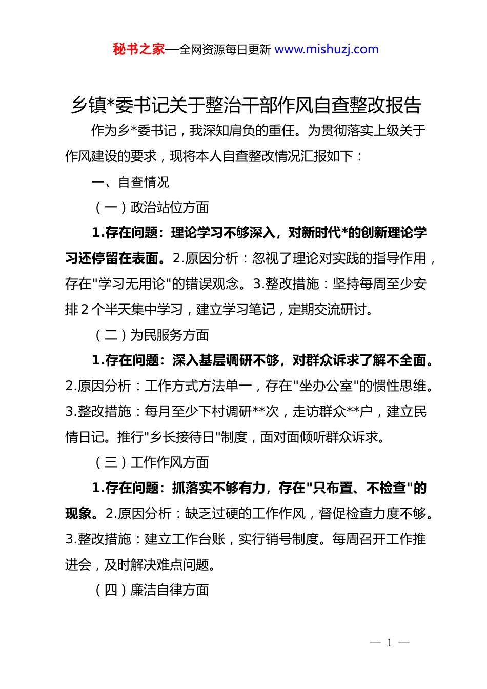 秘书之家—全网资源每日更新www.mishuzj.com乡镇*委书记关于整治干部作风自查整改报告作为乡*委书记,我深知肩负的重任。为贯彻落实上级关于作风建设的要求,现将本人自查整改情况汇报如下:一、自查情况(一)政治站位方面1.存在问题:理论学习不够深入,对新时代*的创新理论学习还停留在表面。2.原因分析:忽视了理论对实践的指导作用,存在"学习无用论"的错误观念。3.整改措施:坚持每周至少安排2个半天集中学习,建立学习笔记,定期交流研讨。(二)为民服务方面1.存在问题:深入基层调研不够,对群众诉求了解不全面。2.原因分析:工作方式方法单一,存在"坐办公室"的惯性思维。3.整改措施:每月至少下村调研**次,走访群众**户,建立民情日记。推行"乡长接待日"制度,面对面倾听群众诉求。(三)工作作风方面1.存在问题:抓落实不够有力,存在"只布置、不检查"的现象。2.原因分析:缺乏过硬的工作作风,督促检查力度不够。3.整改措施:建立工作台账,实行销号制度。每周召开工作推进会,及时解决难点问题。(四)廉洁自律方面—1—秘书之家—全网资源每日更新www.mishuzj.com1.存在问题:廉洁意识有待加强,存在轻微的公私界限模糊问题。2.原因分析:对dj*规学习不够深入,警惕性不够高。3.整改措施:定期组织观看警示教育片,邀请纪委领导授课。严格执行廉洁自律各项规定,带头厉行节约。二、整改成效(一)思想认识明显提升通过系统学习,我对**************思想有了更深刻的理解。每周组织中心组学习,带头撰写心得体会**篇,在全乡掀起了学习热潮。(二)联系群众更加紧密坚持每月走访**个村,与**名群众面对面交流。通过实地调研,解决了**个村的饮水安全问题,改造了**公里农村道路,群众满意度显著提升。(三)工作效能大幅提高建立了重点工作周报告、月总结制度。全乡**项重点工程按期完成,招商引资额同比增长**%,农民人均收入增长**%。(四)廉洁自律更加严格带头落实中央八项规定精神,严格执行公务接待标准。全面清理领导干部违规占用农房、违规经商办企业等问题,共整改**起。—2—秘书之家—全网资源每日更新www.mishuzj.com三、下一步工作计划(一)持续深化理论学习1.建立乡村两级理论学习联动机制,每月组织1次集中研讨。2.开展"学习强国"积分竞赛,激发干部学习热情。3.组织干部赴先进地区考察学习,拓宽视野。(二)创新联系服务群众方式1.推行"互联网+群众工作"模式,建立网上民意收集平台。2.开展"我为群众办实事"实践活动,每季度至少解决**个民生问题。3.建立干部直接联系服务群众制度,每名干部至少联系**户群众。(三)提升工作落实效能1.实施"首问负责制",杜绝推诿扯皮现象。2.建立重点工作"销号制",确保事事有回音、件件有着落。3.开展"效能提升月"活动,压缩审批时限,优化服务流程。(四)强化廉洁自律意识1.定期开展廉政风险排查,建立风险防控清单。2.严格落实"一岗双责",签订*风廉政建设责任书。3.加强对村"两委"干部的监督管理,防止小微权力腐败。四、保障措施(一)加强组织领导—3—秘书之家—全网资源每日更新www.mishuzj.com成立作风建设领导小组,由我任组长,分管领导任副组长各部门负责人为成员。定期召开专题会议,研究解决突出问题。(二)完善考核机制将作风建设纳入年度考核内容,占比不低于**%。建立"红黑榜"制度,对作风优秀的干部予以表彰,对问题突出的严肃问责。(三)强化督查问责组建作风建设督查组,采取明察暗访等方式,定期开展督查。对整改不力、敷衍应付的,严肃追责。(四)营造良好氛围充分利用广播、微信公众号等平台,宣传作风建设先进典型。设立群众监督热线,畅通群众反映渠道。(五)注重统筹兼顾将作风建设与中心工作紧密结合,做到两手抓、两促进。把作风建设成效体现在推动高质量发展上,体现在服务群众实效上。—4—