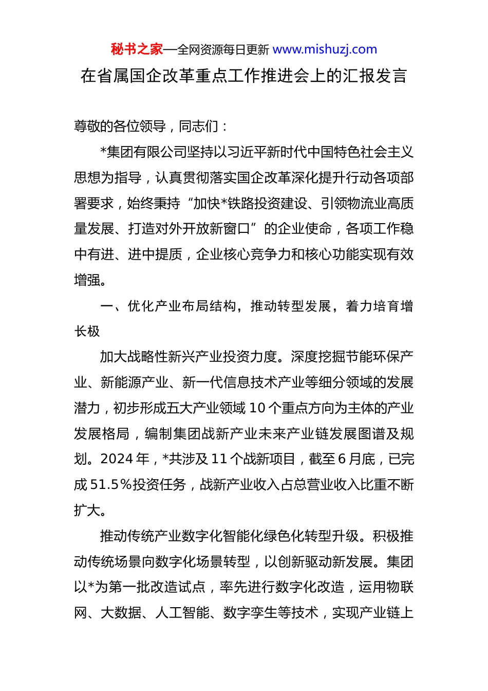 秘书之家—全网资源每日更新www.mishuzj.com在省属国企改革重点工作推进会上的汇报发言尊敬的各位领导,同志们:*集团有限公司坚持以习近平新时代中国特色社会主义思想为指导,认真贯彻落实国企改革深化提升行动各项部署要求,始终秉持“加快*铁路投资建设、引领物流业高质量发展、打造对外开放新窗口”的企业使命,各项工作稳中有进、进中提质,企业核心竞争力和核心功能实现有效增强。一、优化产业布局结构,推动转型发展,着力培育增长极加大战略性新兴产业投资力度。深度挖掘节能环保产业、新能源产业、新一代信息技术产业等细分领域的发展潜力,初步形成五大产业领域10个重点方向为主体的产业发展格局,编制集团战新产业未来产业链发展图谱及规划。2024年,*共涉及11个战新项目,截至6月底,已完成51.5%投资任务,战新产业收入占总营业收入比重不断扩大。推动传统产业数字化智能化绿色化转型升级。积极推动传统场景向数字化场景转型,以创新驱动新发展。集团以*为第一批改造试点,率先进行数字化改造,运用物联网、大数据、人工智能、数字孪生等技术,实现产业链上秘书之家—全网资源每日更新www.mishuzj.com下游企业内部信息系统的高效对接,项目建成后将提升10%货物运输效率、18%仓储利用效率,降低物流成本30%以上,为大宗商品供应链提供全面可靠的数字化解决方案。在推广应用绿色交通运输装备方面,有序出清一批传统能源车辆,加快甲醇、电动等节能与新能源车型的替代。今年,集团所属*汽运集团共采购车辆95辆,其中新能源车86辆,更新车辆中使用新能源车辆占比达90.53%。积极参与国际供应链布局,开拓国际市场。实施外贸倍增计划,重点打造焦炭、铁矿石、煤炭、农产品等8条进出口供应链条,1月至6月集团外贸业务实现进出口总额同比增长117%。在德国杜塞尔多夫、印尼雅加达、马来西亚新山、新西兰奥克兰、泰国曼谷等地布局海外仓,通过“前店后仓”模式,重点打造服务我省十大省级重点专业镇产品及特色优势产品的展示交易仓储基地。携手阿联酋*商会暨同乡会在全球最大购物中心迪拜购物中心唐人街*馆盛大举办*名优产品展暨*窗口日活动,*优品中心已入驻迪拜购物中心并挂牌。二、推动公司治理体系现代化,加强合规管理,着力提升治理效能加强党的全面领导。在党建入章、“三重一大”、前置研究清单式管理和“双向进入,交叉任职”领导体制等秘书之家—全网资源每日更新www.mishuzj.com改革规定动作全部落实的成果下,分层分类动态优化集团公司及各级党组织前置研究讨论重大经营管理事项清单,确保党的领导全面融入公司治理中。加强依规合规治企。建立覆盖全面、运行顺畅的内控合规风险一体化管理体系,新出台制度20项、“立改废释”各类制度200余项,构建了“1+3”制度图谱,优化再造105项业务流程。扎实开展内控合规风险一体化管理体系集团总部落地年、二级子公司建设年活动,加快推进一体化管理体系的信息化建设,打造数智综合管理平台,推动形成集团业务流程化、流程表单化、表单信息化。加强董事会运行机制。印发《董事会向经理层授权事项清单(2024版)》,以《清单》为载体,实现经理层授权与优化集团管控相衔接,支持经理层全力以赴谋经营、抓落实、强管理。144户子企业全部实现董事会应建尽建,全部建立了董事会向经理层授权的管理制度。同时,建立外部董事日常调研机制,确保外部董事高水平履职,完善和发展中国特色现代企业制度,推进公司治理体系和治理能力现代化。三、持续推进精益化管理,深化分类考核,着力赋能高质量发展实施精益一体化管理。坚持问题导向,聚焦集团管理质量效率短板弱项,制定《精益管理一体化建设工作方秘书之家—全网资源每日更新www.mishuzj.com案》。明确了“基础管理+模块运营+数据归集+场景应用”四维一体精益化管控体系建设目标,并针对管理数字化和业务数字化两大领域开展建设行动。其中,管理数字化方面,以管理驾驶舱体系建设为核心,开展表单化、流程化、模块化、协同化、智能化、应用化“六化”建设;业务数字化方面,推动具体业务场景数智化改造,开展“智慧+联运”“智慧+仓储”“智慧+配送”等九类陆港“智慧+”服务体...