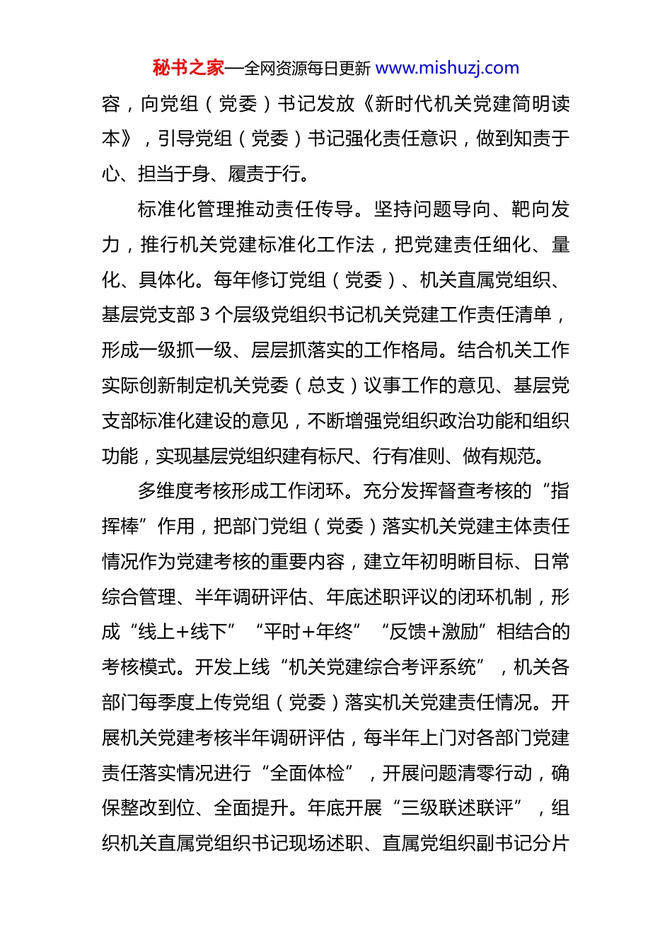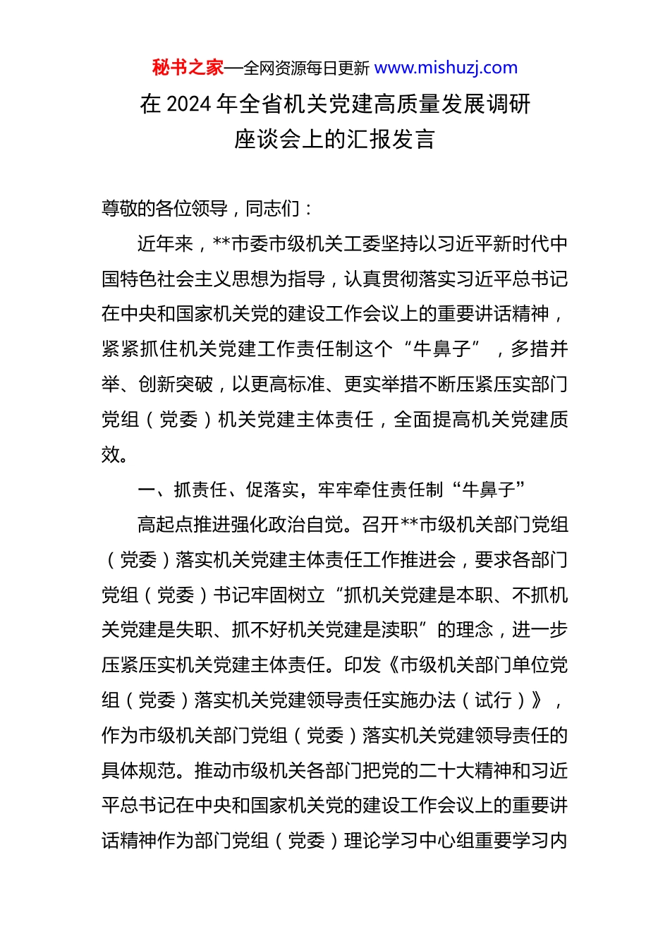 秘书之家—全网资源每日更新www.mishuzj.com在2024年全省机关党建高质量发展调研座谈会上的汇报发言尊敬的各位领导,同志们:近年来,**市委市级机关工委坚持以习近平新时代中国特色社会主义思想为指导,认真贯彻落实习近平总书记在中央和国家机关党的建设工作会议上的重要讲话精神,紧紧抓住机关党建工作责任制这个“牛鼻子”,多措并举、创新突破,以更高标准、更实举措不断压紧压实部门党组(党委)机关党建主体责任,全面提高机关党建质效。一、抓责任、促落实,牢牢牵住责任制“牛鼻子”高起点推进强化政治自觉。召开**市级机关部门党组(党委)落实机关党建主体责任工作推进会,要求各部门党组(党委)书记牢固树立“抓机关党建是本职、不抓机关党建是失职、抓不好机关党建是渎职”的理念,进一步压紧压实机关党建主体责任。印发《市级机关部门单位党组(党委)落实机关党建领导责任实施办法(试行)》,作为市级机关部门党组(党委)落实机关党建领导责任的具体规范。推动市级机关各部门把党的二十大精神和习近平总书记在中央和国家机关党的建设工作会议上的重要讲话精神作为部门党组(党委)理论学习中心组重要学习内秘书之家—全网资源每日更新www.mishuzj.com容,向党组(党委)书记发放《新时代机关党建简明读本》,引导党组(党委)书记强化责任意识,做到知责于心、担当于身、履责于行。标准化管理推动责任传导。坚持问题导向、靶向发力,推行机关党建标准化工作法,把党建责任细化、量化、具体化。每年修订党组(党委)、机关直属党组织、基层党支部3个层级党组织书记机关党建工作责任清单,形成一级抓一级、层层抓落实的工作格局。结合机关工作实际创新制定机关党委(总支)议事工作的意见、基层党支部标准化建设的意见,不断增强党组织政治功能和组织功能,实现基层党组织建有标尺、行有准则、做有规范。多维度考核形成工作闭环。充分发挥督查考核的“指挥棒”作用,把部门党组(党委)落实机关党建主体责任情况作为党建考核的重要内容,建立年初明晰目标、日常综合管理、半年调研评估、年底述职评议的闭环机制,形成“线上+线下”“平时+年终”“反馈+激励”相结合的考核模式。开发上线“机关党建综合考评系统”,机关各部门每季度上传党组(党委)落实机关党建责任情况。开展机关党建考核半年调研评估,每半年上门对各部门党建责任落实情况进行“全面体检”,开展问题清零行动,确保整改到位、全面提升。年底开展“三级联述联评”,组织机关直属党组织书记现场述职、直属党组织副书记分片秘书之家—全网资源每日更新www.mishuzj.com述职、基层党支部书记本单位述职,实现党组织书记考核评价全覆盖。二、抓书记、促担当,紧盯“关键少数”不放松“第一书记”放大“头雁效应”。探索实施“第一书记”工作制度,由市级机关部门班子成员中的党员领导干部担任所在党支部“第一书记”或所在党小组“第一组长”,进一步压实党员领导干部“一岗双责”。“第一书记”“第一组长”聚焦“支部建设强、服务大局优”的工作目标,紧扣主责主业、围绕中心大局,切实发挥“头雁效应”,落实“五带头、五提升”工作举措,勇当联系基层的“服务员”、示范带动的“领航员”、夯实基础的“指导员”,推动形成坚定理想信念、服务中心大局、敢于担当作为的浓厚氛围,以高质量机关党建引领保障高质量发展。多措并举推进队伍建设。不断加强党务干部队伍建设,着力提高党务干部政治素质和业务能力。立足“优”字抓选配,印发《关于进一步加强市级机关党务干部队伍建设的意见》,对新任党务干部人选严格把关,督查指导各部门配齐配强机关党务干部。着眼“强”字抓培训,常态化举办机关直属党组织书记、副书记和基层党支部书记培训班,定期开展知识测试、业务比武,提升机关党务干部履职能力。坚持“活”字抓交流,把党务岗位作为年轻秘书之家—全网资源每日更新www.mishuzj.com干部锻炼、后备干部培养的平台,认真落实党务干部任期规定,形成专职党务干部从行政业务部门来、到行政业务部门去的良性循环。“书记走访”助推责任落实。建立工委领导走访市级机关部门新任党组(党委)书记制度,...