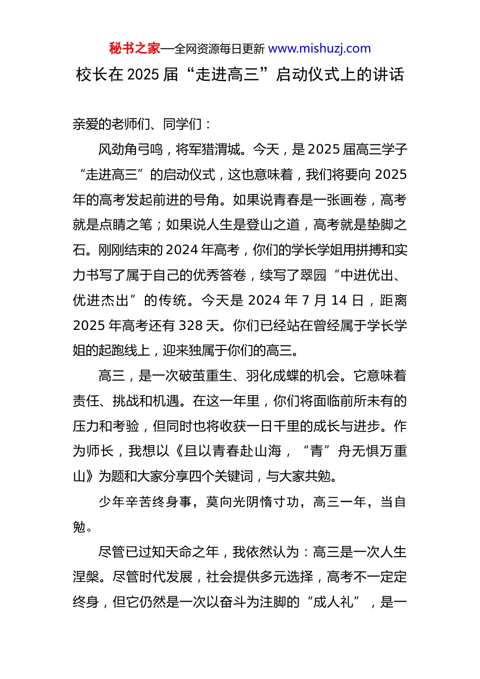 秘书之家—全网资源每日更新www.mishuzj.com校长在2025届“走进高三”启动仪式上的讲话亲爱的老师们、同学们:风劲角弓鸣,将军猎渭城。今天,是2025届高三学子“走进高三”的启动仪式,这也意味着,我们将要向2025年的高考发起前进的号角。如果说青春是一张画卷,高考就是点睛之笔;如果说人生是登山之道,高考就是垫脚之石。刚刚结束的2024年高考,你们的学长学姐用拼搏和实力书写了属于自己的优秀答卷,续写了翠园“中进优出、优进杰出”的传统。今天是2024年7月14日,距离2025年高考还有328天。你们已经站在曾经属于学长学姐的起跑线上,迎来独属于你们的高三。高三,是一次破茧重生、羽化成蝶的机会。它意味着责任、挑战和机遇。在这一年里,你们将面临前所未有的压力和考验,但同时也将收获一日千里的成长与进步。作为师长,我想以《且以青春赴山海,“青”舟无惧万重山》为题和大家分享四个关键词,与大家共勉。少年辛苦终身事,莫向光阴惰寸功,高三一年,当自勉。尽管已过知天命之年,我依然认为:高三是一次人生涅槃。尽管时代发展,社会提供多元选择,高考不一定定终身,但它仍然是一次以奋斗为注脚的“成人礼”,是一秘书之家—全网资源每日更新www.mishuzj.com个人成年之初尝试用稚嫩的肩膀义无反顾去挑起人生重责的奋斗过程,是为人子女强化家庭责任、树立社会担当的觉醒过程。你们会在备考中了解自己、思考未来,甚至做出决定一生的选择。少年辛苦终身事,莫向光阴惰寸功。在“扶摇而上”的过程中,会遭遇疾风苦雨的打击,会经历风雨飘摇的至暗时刻。毛泽东主席在湖南第一师范大学求学时曾写下一副自勉联:“贵有恒,何必三更眠五更起;最无益,只怕一日曝十日寒。”它告诉我们:要用百折不挠的精神,沉着思考;用水滴石穿的毅力,潜心向学。那些看似波澜不惊的日复一日,会让你看到坚持的意义;那些只争朝夕的奋斗征程,会让你的未来熠熠生辉。纤纤不绝林薄成,涓涓不止江河生,高三一年,当自强。细木长成参天大树,源于每一寸生长的积累;江流能波澜壮阔,源于细流的不懈汇聚。学习之路亦是如此,高三的学习强度比高一、高二大得多,在奋力向前的过程中,往往最困难的时候,正是离成功最近的时候。高三,是一段需要坚韧与毅力的旅程,只有细流成江海的积累才能在考场上下笔如有神。每一份笔记的整理、每一个知识点的掌握、每一次考试的反思……都如同森林中细小而坚韧的枝芽,看似微不足道,却足以汇成知识的广袤森林。未来一年里,不管大家基础如何,都要摆出扬帆起航的新姿秘书之家—全网资源每日更新www.mishuzj.com态,扎实完成三轮复习!同学们,真正的强者不抱怨、不放弃,始终铿锵前行。明年此刻,你曾经踏过的遥遥书山,必将铺就凌云天梯;你曾经渡过的茫茫学海,必然树起破浪旌旗;曾经耕耘的寒暑四时,必定助你金榜题名!“不能胜寸心,安能胜苍穹”,高三一年,当自律。同学们,“黄河之水天上来”,是因为它懂得在河道的约束中驰骋,才能有“奔流到海不复回”的自由洒脱。“大鹏一日同风起”,是因为它深知在“六月息”的律动中翱翔,才可以达到“扶摇直上九万里”的无拘无束。一天坚持不足为奇,一月坚持说明你尚可以,350天的坚持才证明你是自律者,是勇者智者!高考是一场需要自己打赢自己的战争,与天斗,有志不惧寒冬酷暑;与己斗,勤学不贪安逸舒适!2024届高三1班林涵麟同学在翠园回忆录中写道:“窗外有风景,笔下有前途;身旁有朋友,背后有良师;低头是题海,抬头是未来。桌上的卷子挡不住黑板,因为它将铺向光明的未来。”同学们,唯有自律,方得自由。高三一年,当与自律作伴,让每一个清晨书声朗朗,让每一节课堂活跃高效,让每一节晚修静心潜思。“不畏浮云遮望眼,自缘身在最高层”,高三一年,当自信。从百年前五四时期的振臂呐喊,到改革开放初期的“团结起来、振兴中华”,再到新时代“请党放心、强国秘书之家—全网资源每日更新www.mishuzj.com有我”的铿锵誓言,每一代中国青年都以舍我其谁的自信勇担起历史重任。今天,你们的高中生涯即将开启新征程,无论你对自己过往的评价如何,都希望你有毛主席“自信人生二百年,会当水击...
