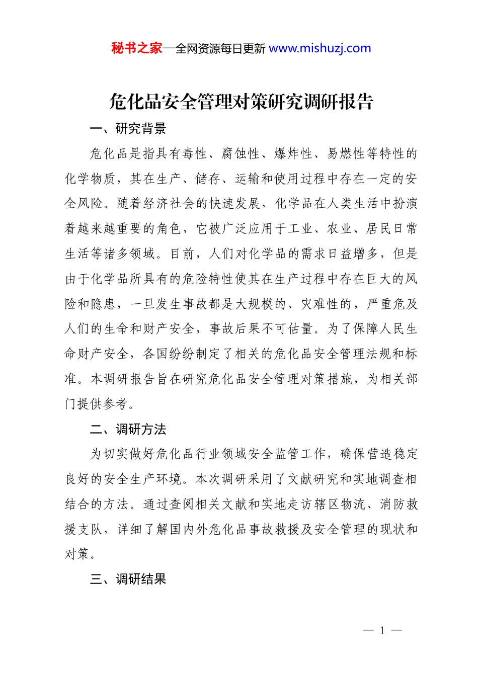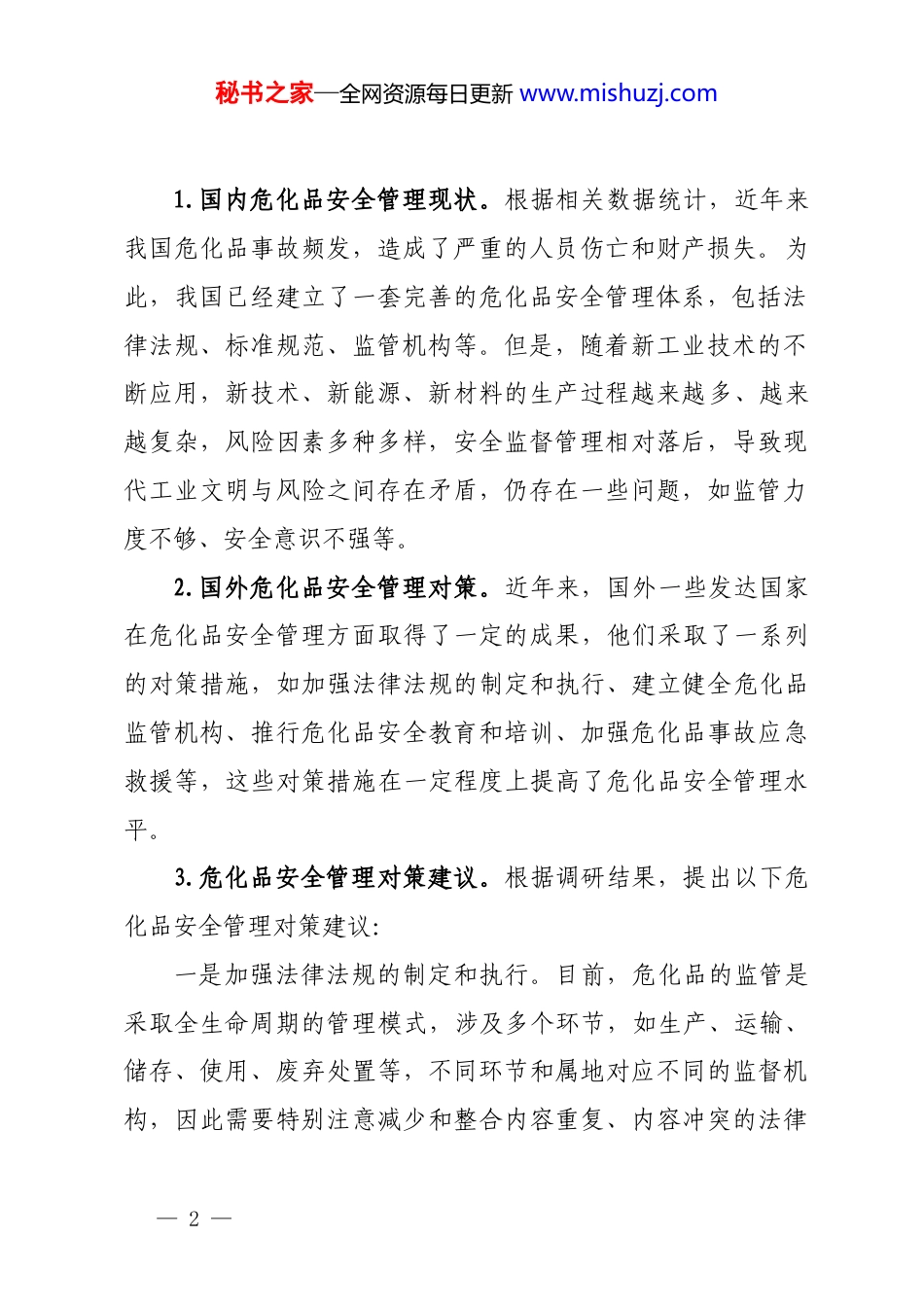 秘书之家—全网资源每日更新www.mishuzj.com危化品安全管理对策研究调研报告一、研究背景危化品是指具有毒性、腐蚀性、爆炸性、易燃性等特性的化学物质,其在生产、储存、运输和使用过程中存在一定的安全风险。随着经济社会的快速发展,化学品在人类生活中扮演着越来越重要的角色,它被广泛应用于工业、农业、居民日常生活等诸多领域。目前,人们对化学品的需求日益增多,但是由于化学品所具有的危险特性使其在生产过程中存在巨大的风险和隐患,一旦发生事故都是大规模的、灾难性的,严重危及人们的生命和财产安全,事故后果不可估量。为了保障人民生命财产安全,各国纷纷制定了相关的危化品安全管理法规和标准。本调研报告旨在研究危化品安全管理对策措施,为相关部门提供参考。二、调研方法为切实做好危化品行业领域安全监管工作,确保营造稳定良好的安全生产环境。本次调研采用了文献研究和实地调查相结合的方法。通过查阅相关文献和实地走访辖区物流、消防救援支队,详细了解国内外危化品事故救援及安全管理的现状和对策。三、调研结果—1—秘书之家—全网资源每日更新www.mishuzj.com1.国内危化品安全管理现状。根据相关数据统计,近年来我国危化品事故频发,造成了严重的人员伤亡和财产损失。为此,我国已经建立了一套完善的危化品安全管理体系,包括法律法规、标准规范、监管机构等。但是,随着新工业技术的不断应用,新技术、新能源、新材料的生产过程越来越多、越来越复杂,风险因素多种多样,安全监督管理相对落后,导致现代工业文明与风险之间存在矛盾,仍存在一些问题,如监管力度不够、安全意识不强等。2.国外危化品安全管理对策。近年来,国外一些发达国家在危化品安全管理方面取得了一定的成果,他们采取了一系列的对策措施,如加强法律法规的制定和执行、建立健全危化品监管机构、推行危化品安全教育和培训、加强危化品事故应急救援等,这些对策措施在一定程度上提高了危化品安全管理水平。3.危化品安全管理对策建议。根据调研结果,提出以下危化品安全管理对策建议:一是加强法律法规的制定和执行。目前,危化品的监管是采取全生命周期的管理模式,涉及多个环节,如生产、运输、储存、使用、废弃处置等,不同环节和属地对应不同的监督机构,因此需要特别注意减少和整合内容重复、内容冲突的法律—2—秘书之家—全网资源每日更新www.mishuzj.com法规,实现协调统一。在法律法规的制定过程中,可以参照国外相关行业已经经过验证的成熟做法,再结合我国的实际情况,制定出适合我国国情和特点的法律法规。同时,需要高度重视企业和社会的反馈,确保法律法规范围明确、内容合理,具有可操作性,能够切实有效实施。特别是需要推动修订《刑法》修正案,通过责任倒查,将事故前的严重违法行为列入刑法调整范围,强化依法治理,用法治思维和体系化法治手段解决危化品安全管理问题,着力从系统角度提高危化品安全管理法治化水平。二是严格落实安全生产责任制。危化品行业的隐患排查、安全整治是一项长期的基础性工作,要严格监督管理,全面落实企业安全生产主体责任,督促危化品从业单位主要负责人和其他管理人员对本企业重要工序、重大危险源、要害部位、重要装置和设施随时进行排查,对存在的隐患第一时间排除或整改,对排查情况认真做好记录存档备查。要采取多部门联动形式,集中力量、集中时间,借助专家力量,有重点、分步骤持续推进。要结合各地实际,聚焦重点行业、重点企业、重点领域,严格排查治理安全隐患,严肃查处安全生产领域的各类违法行为。三是强化危化品信息管理。针对危化品安全管理中存在的—3—秘书之家—全网资源每日更新www.mishuzj.com难点、堵点问题,以数字驱动制度重塑,打造危化品全链条安全风险智控场景应用,建立危化品全链条安全风险智控体系,推动实现危化品全链条安全监管、全要素风险监测、全过程治理监控。强化技术对危化品安全生产风险治理的支撑,以大数据和工业物联网技术为基础,积极推广在生产设施、设备及载具上应用安监物联网监测预警技术,加强对安全隐患与风险信息的感知、探测和跟踪预警能力。加强安监领域人工智能技术的开发...