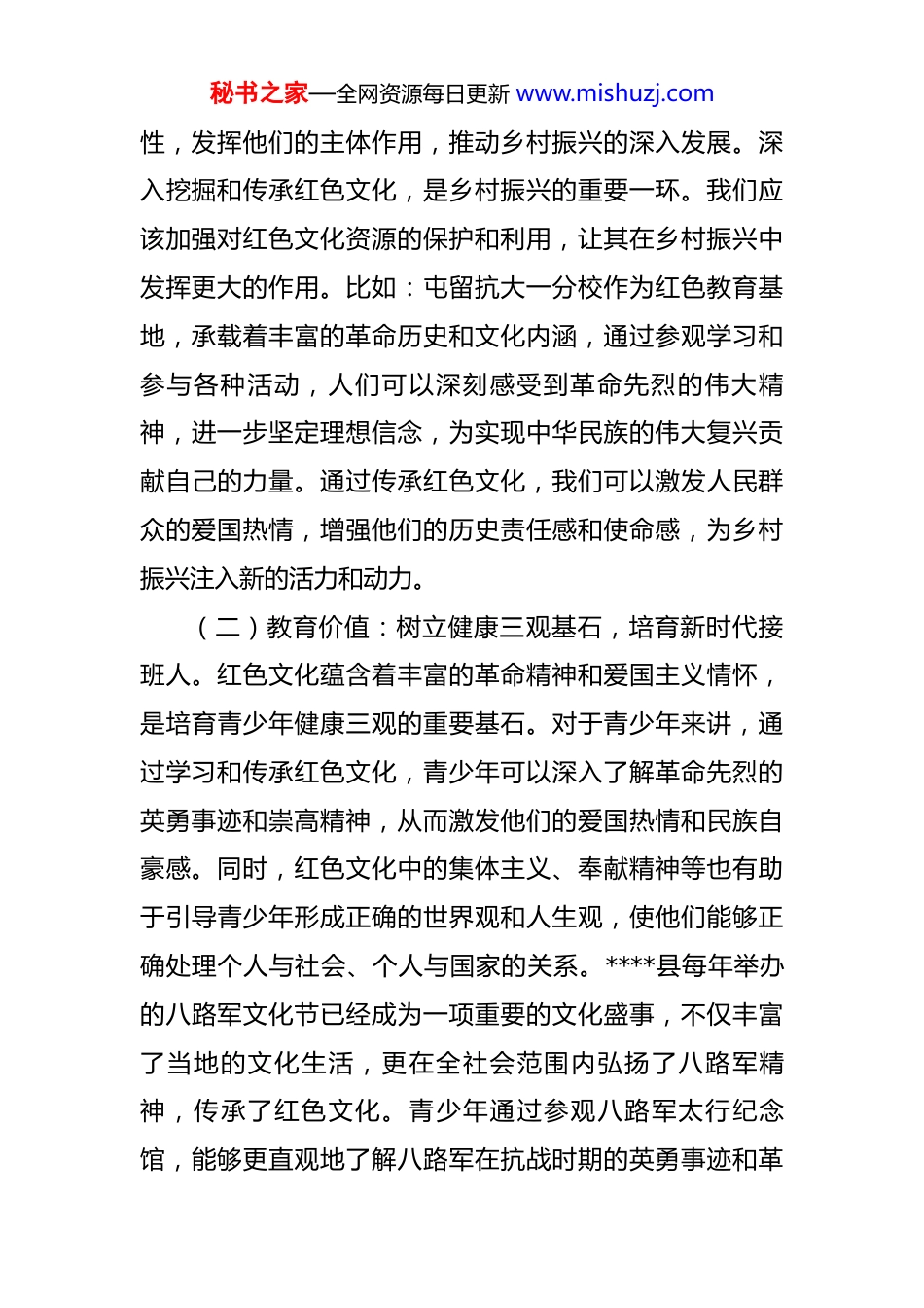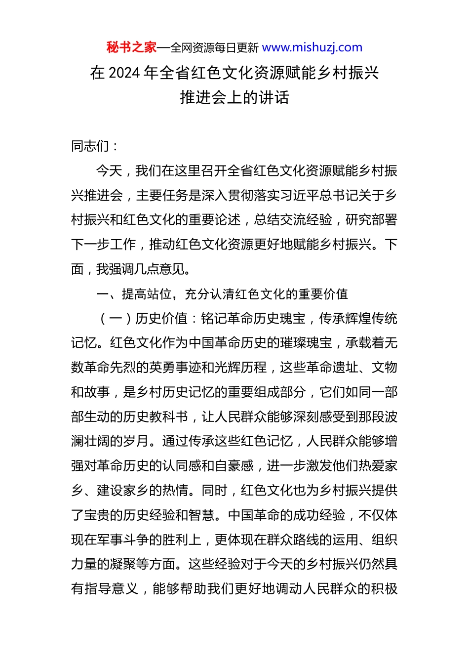 秘书之家—全网资源每日更新www.mishuzj.com在2024年全省红色文化资源赋能乡村振兴推进会上的讲话同志们:今天,我们在这里召开全省红色文化资源赋能乡村振兴推进会,主要任务是深入贯彻落实习近平总书记关于乡村振兴和红色文化的重要论述,总结交流经验,研究部署下一步工作,推动红色文化资源更好地赋能乡村振兴。下面,我强调几点意见。一、提高站位,充分认清红色文化的重要价值(一)历史价值:铭记革命历史瑰宝,传承辉煌传统记忆。红色文化作为中国革命历史的璀璨瑰宝,承载着无数革命先烈的英勇事迹和光辉历程,这些革命遗址、文物和故事,是乡村历史记忆的重要组成部分,它们如同一部部生动的历史教科书,让人民群众能够深刻感受到那段波澜壮阔的岁月。通过传承这些红色记忆,人民群众能够增强对革命历史的认同感和自豪感,进一步激发他们热爱家乡、建设家乡的热情。同时,红色文化也为乡村振兴提供了宝贵的历史经验和智慧。中国革命的成功经验,不仅体现在军事斗争的胜利上,更体现在群众路线的运用、组织力量的凝聚等方面。这些经验对于今天的乡村振兴仍然具有指导意义,能够帮助我们更好地调动人民群众的积极秘书之家—全网资源每日更新www.mishuzj.com性,发挥他们的主体作用,推动乡村振兴的深入发展。深入挖掘和传承红色文化,是乡村振兴的重要一环。我们应该加强对红色文化资源的保护和利用,让其在乡村振兴中发挥更大的作用。比如:屯留抗大一分校作为红色教育基地,承载着丰富的革命历史和文化内涵,通过参观学习和参与各种活动,人们可以深刻感受到革命先烈的伟大精神,进一步坚定理想信念,为实现中华民族的伟大复兴贡献自己的力量。通过传承红色文化,我们可以激发人民群众的爱国热情,增强他们的历史责任感和使命感,为乡村振兴注入新的活力和动力。(二)教育价值:树立健康三观基石,培育新时代接班人。红色文化蕴含着丰富的革命精神和爱国主义情怀,是培育青少年健康三观的重要基石。对于青少年来讲,通过学习和传承红色文化,青少年可以深入了解革命先烈的英勇事迹和崇高精神,从而激发他们的爱国热情和民族自豪感。同时,红色文化中的集体主义、奉献精神等也有助于引导青少年形成正确的世界观和人生观,使他们能够正确处理个人与社会、个人与国家的关系。****县每年举办的八路军文化节已经成为一项重要的文化盛事,不仅丰富了当地的文化生活,更在全社会范围内弘扬了八路军精神,传承了红色文化。青少年通过参观八路军太行纪念馆,能够更直观地了解八路军在抗战时期的英勇事迹和革秘书之家—全网资源每日更新www.mishuzj.com命精神,这对于他们树立正确的世界观、人生观和价值观具有重要意义。新时代接班人需要具备坚定的理想信念、强烈的责任担当和创新的思维方式。红色文化作为一种独特的教育资源,有助于培养青少年的这些品质。通过学习红色文化,青少年可以深刻认识到革命先烈的奋斗历程和牺牲精神,从而坚定自己的理想信念和人生目标。同时,红色文化中的创新精神和实践经验也可以激发青少年的创新思维和实践能力,使他们成为具备创新精神和实践能力的新时代接班人,为中华民族的伟大复兴贡献自己的力量。(三)经济价值:引领产业多元发展,助推产业兴旺繁荣。红色文化具有丰富的内涵和多样的表现形式,为文化产业的发展提供了广阔的空间。红色文化资源富集地的乡镇开展红色旅游、红色研学带来充足的客源流、资金流、信息流。通过开发红色文化旅游、红色影视、红色演艺等多元化产品,可以吸引更多的消费者和投资者,推动相关产业的快速发展。同时,红色文化还可以与其他产业进行深度融合,如红色文化与农业、教育、科技等领域的结合,创造出更多具有市场竞争力的产品和服务。红色文化产业的发展不仅可以创造经济效益,还可以带动相关产业的协同发展。例如,黎城黄崖洞兵工厂景区不仅为当地带来了显著的经济效益,还通过开发实景剧等创新形式,秘书之家—全网资源每日更新www.mishuzj.com进一步丰富了旅游体验,为游客呈现了一场视听盛宴。实景剧的成功推出,不仅吸引了更多的游客前来观赏,也为当地创造了更多的就业机会,促进了文化旅游产业的融...