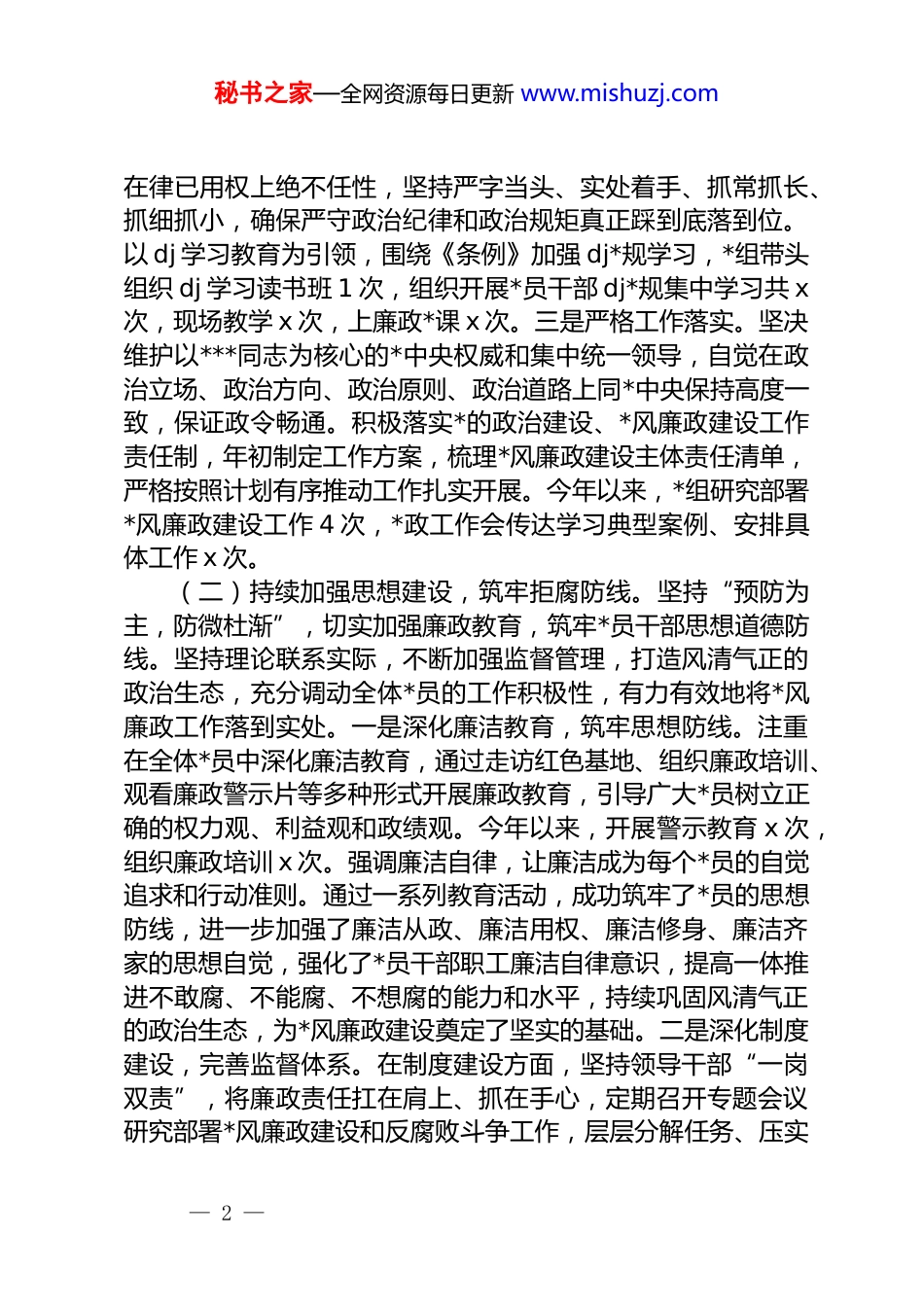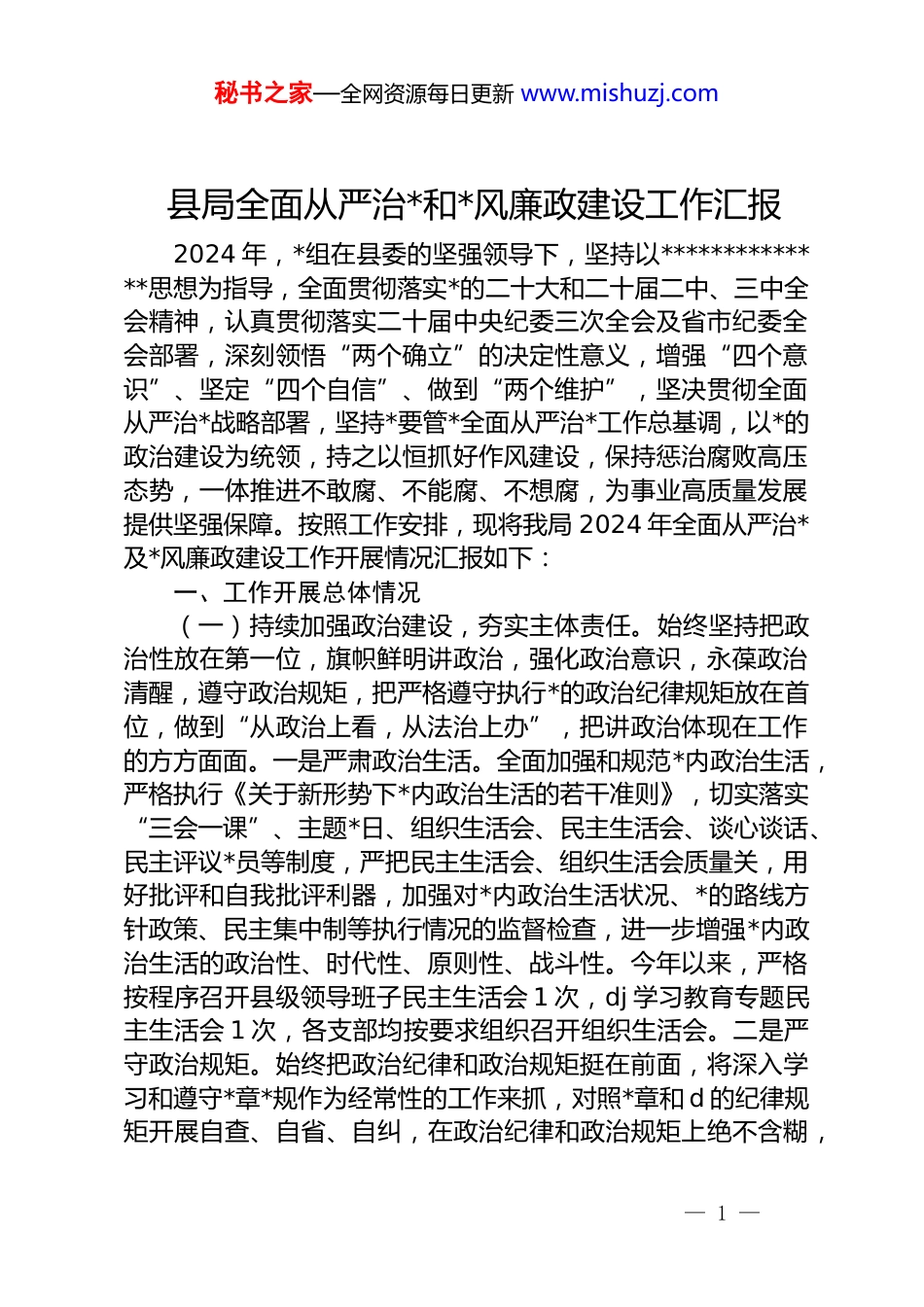 秘书之家—全网资源每日更新www.mishuzj.com县局全面从严治*和*风廉政建设工作汇报2024年,*组在县委的坚强领导下,坚持以**************思想为指导,全面贯彻落实*的二十大和二十届二中、三中全会精神,认真贯彻落实二十届中央纪委三次全会及省市纪委全会部署,深刻领悟“两个确立”的决定性意义,增强“四个意识”、坚定“四个自信”、做到“两个维护”,坚决贯彻全面从严治*战略部署,坚持*要管*全面从严治*工作总基调,以*的政治建设为统领,持之以恒抓好作风建设,保持惩治腐败高压态势,一体推进不敢腐、不能腐、不想腐,为事业高质量发展提供坚强保障。按照工作安排,现将我局2024年全面从严治*及*风廉政建设工作开展情况汇报如下:一、工作开展总体情况(一)持续加强政治建设,夯实主体责任。始终坚持把政治性放在第一位,旗帜鲜明讲政治,强化政治意识,永葆政治清醒,遵守政治规矩,把严格遵守执行*的政治纪律规矩放在首位,做到“从政治上看,从法治上办”,把讲政治体现在工作的方方面面。一是严肃政治生活。全面加强和规范*内政治生活,严格执行《关于新形势下*内政治生活的若干准则》,切实落实“三会一课”、主题*日、组织生活会、民主生活会、谈心谈话、民主评议*员等制度,严把民主生活会、组织生活会质量关,用好批评和自我批评利器,加强对*内政治生活状况、*的路线方针政策、民主集中制等执行情况的监督检查,进一步增强*内政治生活的政治性、时代性、原则性、战斗性。今年以来,严格按程序召开县级领导班子民主生活会1次,dj学习教育专题民主生活会1次,各支部均按要求组织召开组织生活会。二是严守政治规矩。始终把政治纪律和政治规矩挺在前面,将深入学习和遵守*章*规作为经常性的工作来抓,对照*章和d的纪律规矩开展自查、自省、自纠,在政治纪律和政治规矩上绝不含糊,—1—秘书之家—全网资源每日更新www.mishuzj.com在律已用权上绝不任性,坚持严字当头、实处着手、抓常抓长、抓细抓小,确保严守政治纪律和政治规矩真正踩到底落到位。以dj学习教育为引领,围绕《条例》加强dj*规学习,*组带头组织dj学习读书班1次,组织开展*员干部dj*规集中学习共x次,现场教学x次,上廉政*课x次。三是严格工作落实。坚决维护以***同志为核心的*中央权威和集中统一领导,自觉在政治立场、政治方向、政治原则、政治道路上同*中央保持高度一致,保证政令畅通。积极落实*的政治建设、*风廉政建设工作责任制,年初制定工作方案,梳理*风廉政建设主体责任清单,严格按照计划有序推动工作扎实开展。今年以来,*组研究部署*风廉政建设工作4次,*政工作会传达学习典型案例、安排具体工作x次。(二)持续加强思想建设,筑牢拒腐防线。坚持“预防为主,防微杜渐”,切实加强廉政教育,筑牢*员干部思想道德防线。坚持理论联系实际,不断加强监督管理,打造风清气正的政治生态,充分调动全体*员的工作积极性,有力有效地将*风廉政工作落到实处。一是深化廉洁教育,筑牢思想防线。注重在全体*员中深化廉洁教育,通过走访红色基地、组织廉政培训、观看廉政警示片等多种形式开展廉政教育,引导广大*员树立正确的权力观、利益观和政绩观。今年以来,开展警示教育x次,组织廉政培训x次。强调廉洁自律,让廉洁成为每个*员的自觉追求和行动准则。通过一系列教育活动,成功筑牢了*员的思想防线,进一步加强了廉洁从政、廉洁用权、廉洁修身、廉洁齐家的思想自觉,强化了*员干部职工廉洁自律意识,提高一体推进不敢腐、不能腐、不想腐的能力和水平,持续巩固风清气正的政治生态,为*风廉政建设奠定了坚实的基础。二是深化制度建设,完善监督体系。在制度建设方面,坚持领导干部“一岗双责”,将廉政责任扛在肩上、抓在手心,定期召开专题会议研究部署*风廉政建设和反腐败斗争工作,层层分解任务、压实—2—秘书之家—全网资源每日更新www.mishuzj.com主体责任。注重从源头上预防腐败,加强了对权力运行的制约和监督。修订完善了多项内部管理制度,明确了权力清单和责任清单,确保各项工作有章可循、有据可查。强化对制度执行情况的监督检查,确保制度刚性运行,不留死角。三是严查违规行为,...