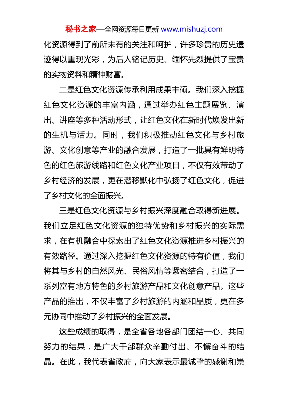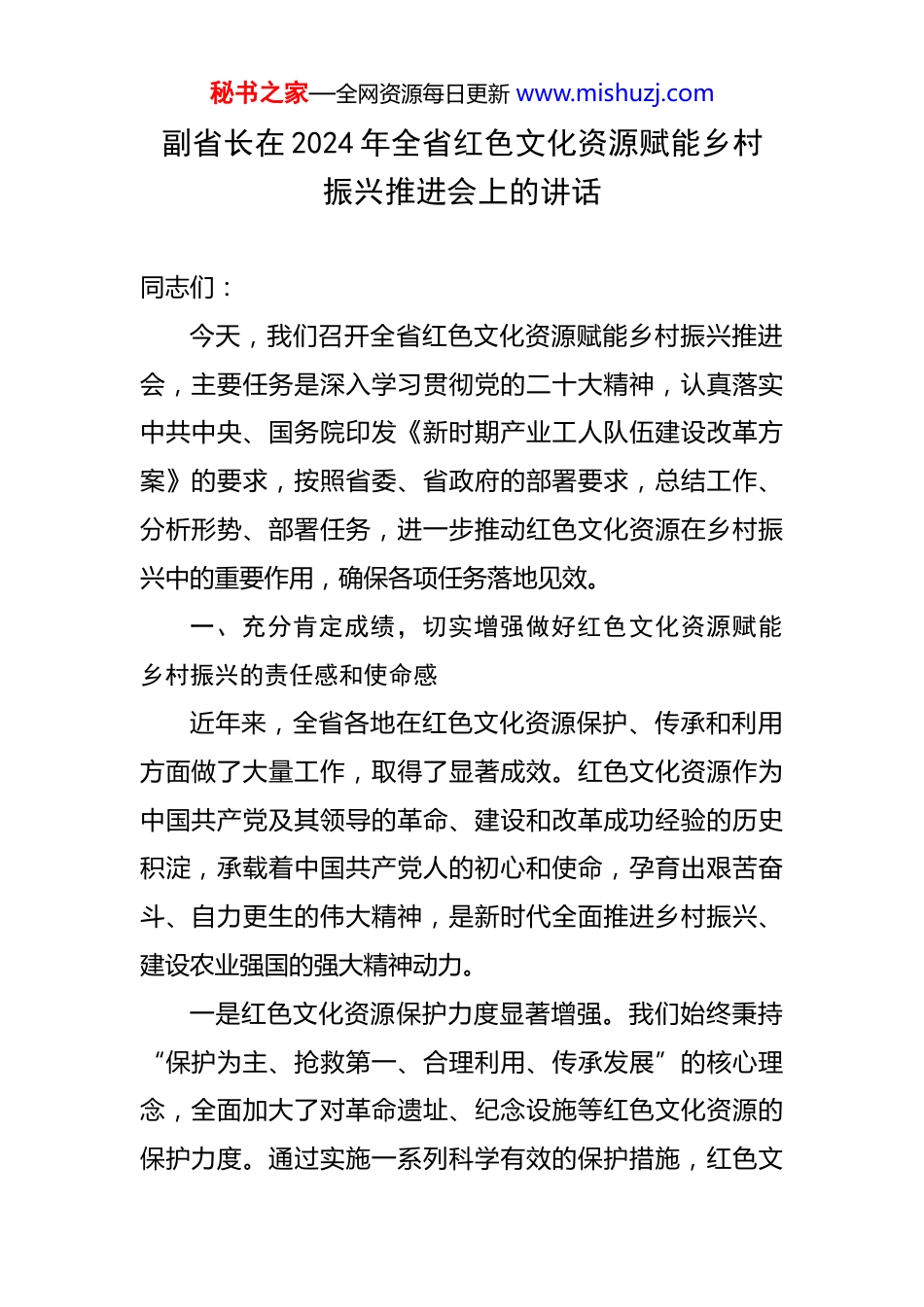 秘书之家—全网资源每日更新www.mishuzj.com副省长在2024年全省红色文化资源赋能乡村振兴推进会上的讲话同志们:今天,我们召开全省红色文化资源赋能乡村振兴推进会,主要任务是深入学习贯彻党的二十大精神,认真落实中共中央、国务院印发《新时期产业工人队伍建设改革方案》的要求,按照省委、省政府的部署要求,总结工作、分析形势、部署任务,进一步推动红色文化资源在乡村振兴中的重要作用,确保各项任务落地见效。一、充分肯定成绩,切实增强做好红色文化资源赋能乡村振兴的责任感和使命感近年来,全省各地在红色文化资源保护、传承和利用方面做了大量工作,取得了显著成效。红色文化资源作为中国共产党及其领导的革命、建设和改革成功经验的历史积淀,承载着中国共产党人的初心和使命,孕育出艰苦奋斗、自力更生的伟大精神,是新时代全面推进乡村振兴、建设农业强国的强大精神动力。一是红色文化资源保护力度显著增强。我们始终秉持“保护为主、抢救第一、合理利用、传承发展”的核心理念,全面加大了对革命遗址、纪念设施等红色文化资源的保护力度。通过实施一系列科学有效的保护措施,红色文秘书之家—全网资源每日更新www.mishuzj.com化资源得到了前所未有的关注和呵护,许多珍贵的历史遗迹得以重现光彩,为后人铭记历史、缅怀先烈提供了宝贵的实物资料和精神财富。二是红色文化资源传承利用成果丰硕。我们深入挖掘红色文化资源的丰富内涵,通过举办红色主题展览、演出、讲座等多种活动形式,让红色文化在新时代焕发出新的生机与活力。同时,我们积极推动红色文化与乡村旅游、文化创意等产业的融合发展,打造了一批具有鲜明特色的红色旅游线路和红色文化产业项目,不仅有效带动了乡村经济的发展,更在潜移默化中弘扬了红色文化,促进了乡村文化的全面振兴。三是红色文化资源与乡村振兴深度融合取得新进展。我们立足红色文化资源的独特优势和乡村振兴的实际需求,在有机融合中探索出了红色文化资源推进乡村振兴的有效路径。通过深入挖掘红色文化资源的特有价值,我们将其与乡村的自然风光、民俗风情等紧密结合,打造了一系列富有地方特色的乡村旅游产品和文化创意产品。这些产品的推出,不仅丰富了乡村旅游的内涵和品质,更在多元协同中推动了乡村振兴的全面发展。这些成绩的取得,是全省各地各部门团结一心、共同努力的结果,是广大干部群众辛勤付出、不懈奋斗的结晶。在此,我代表省政府,向大家表示最诚挚的感谢和崇秘书之家—全网资源每日更新www.mishuzj.com高的敬意!同时,我们也要清醒地认识到,红色文化资源赋能乡村振兴的工作仍然任重道远。我们要切实增强责任感和使命感,继续发扬艰苦奋斗、自力更生的精神,以更加饱满的热情、更加务实的作风,推动红色文化资源在乡村振兴中发挥更大的作用、创造更多的价值。二、准确把握形势,切实增强做好红色文化资源赋能乡村振兴的紧迫感和自觉性当前,我省正处于加快推进高质量发展的关键阶段,红色文化资源赋能乡村振兴不仅承载着历史的厚重,更面临着新的发展机遇与挑战。在这一背景下,我们必须以高度的责任感和使命感,准确把握形势,切实增强做好红色文化资源赋能乡村振兴的紧迫感和自觉性。一要深刻认识加强红色文化资源赋能乡村振兴是贯彻落实党中央决策部署的政治任务。习近平总书记多次强调红色文化资源的宝贵价值,指出要“把红色资源利用好、把红色传统发扬好、把红色基因传承好”。这不仅是对红色文化传承的深切期望,更是对新时代红色文化资源赋能乡村振兴工作的战略指引。我们要深入学习领会总书记的重要指示精神,将其转化为推动工作的强大动力,确保党中央的决策部署在基层落地生根,开花结果。通过强化组织领导、完善政策体系、加大投入力度等措施,不断提升红色文化资源赋能乡村振兴的效能,以实际行动践行“两秘书之家—全网资源每日更新www.mishuzj.com个维护”。二要深刻认识加强红色文化资源赋能乡村振兴是推动经济社会高质量发展的内在要求。高质量发展不仅体现在经济数据的增长上,更体现在文化的繁荣、社会的和谐与人民的幸福之中。红色文化资源是我省独特的文化标识和精神瑰宝,蕴含着丰富的历...