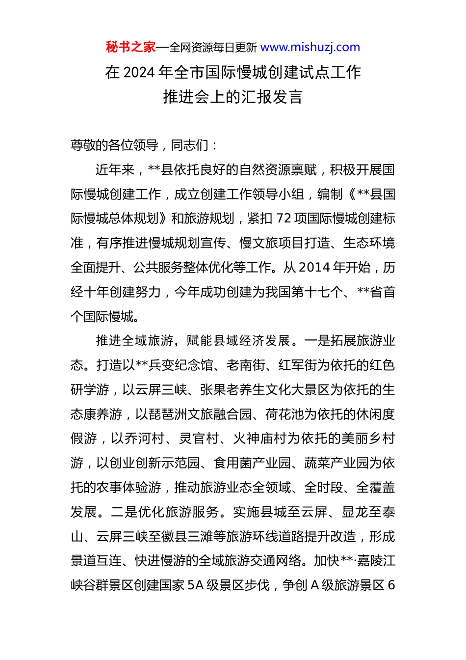 秘书之家—全网资源每日更新www.mishuzj.com在2024年全市国际慢城创建试点工作推进会上的汇报发言尊敬的各位领导,同志们:近年来,**县依托良好的自然资源禀赋,积极开展国际慢城创建工作,成立创建工作领导小组,编制《**县国际慢城总体规划》和旅游规划,紧扣72项国际慢城创建标准,有序推进慢城规划宣传、慢文旅项目打造、生态环境全面提升、公共服务整体优化等工作。从2014年开始,历经十年创建努力,今年成功创建为我国第十七个、**省首个国际慢城。推进全域旅游,赋能县域经济发展。一是拓展旅游业态。打造以**兵变纪念馆、老南街、红军街为依托的红色研学游,以云屏三峡、张果老养生文化大景区为依托的生态康养游,以琵琶洲文旅融合园、荷花池为依托的休闲度假游,以乔河村、灵官村、火神庙村为依托的美丽乡村游,以创业创新示范园、食用菌产业园、蔬菜产业园为依托的农事体验游,推动旅游业态全领域、全时段、全覆盖发展。二是优化旅游服务。实施县城至云屏、显龙至泰山、云屏三峡至徽县三滩等旅游环线道路提升改造,形成景道互连、快进慢游的全域旅游交通网络。加快**·嘉陵江峡谷群景区创建国家5A级景区步伐,争创A级旅游景区6秘书之家—全网资源每日更新www.mishuzj.com家、星级酒店3家、国家丙级民宿1家、星级农家乐16家,健全旅游要素,让游客悦享“白天赏美景、夜晚看繁星、时时听天籁、天天品山珍、尽情深呼吸、回归慢生活”的旅游体验。三是加强宣传推介。大力营造“人人都是形象大使、全域旅游全民参与”的浓厚氛围,精心策划举办“红色**·生态之旅”、山地自行车赛、太极拳展演赛、山地挑战赛等文体赛事和美食节、樱花节、农民丰收节等旅游节会活动,举办“游红色**、品福寿山珍”系列文旅促消费活动,引爆旅游消费热点。积极参加省内外旅游推介会,与西安、宝鸡、天水、汉中等周边旅游城市、旅游景点缔结友好关系,促进形成互惠共赢的发展格局。扮靓美丽**,擦亮生态宜居名片。一是擦亮生态底色。积极开展国际慢城、国家森林城市、气候生态品牌、省级文明县城、幸福美丽河湖、绿色矿山等品牌创建活动,用心呵护蓝天碧水净土,打造生态美丽幸福家园。全县森林覆盖率、林木绿化率由2020年的75%、84%提高到76.37%、87.37%,空气质量改善率、水环境质量达标率、城乡生活垃圾处理率、公众生态环境满意度均为100%,城市污水处理率达到99%,万元GDP能耗降低至1.8%,成功创建为全国水土保持示范县、全国节水型社会建设达标县,巩固提升全国生态文明建设示范县、全国卫生县城、全国村庄清洁行动先进县创建成果。二是提升城秘书之家—全网资源每日更新www.mishuzj.com市品质。坚持高标准规划引领,高质量建设管理,开展以城市“双修”为重点的城市品质提升行动,实施城市品质项目14个。纵深推进爱国卫生运动,坚持每周五下午开展集中清洁,“全域无垃圾”意识深入人心。**河、云屏河美丽幸福河湖创建加快推进,县乡村三级河长巡河率占全年巡河次数73.58%,着力打造生态宜居美丽新**,连续四年荣获全省最具人居环境竞争力县称号。三是建设和美乡村。以“村庄美、产业兴、治理好、乡风和、百姓富、集体强”为目标,学习运用“千村示范、万村整治”工程经验,精心打造一批深呼吸乡镇、中国美丽休闲乡村、全国乡村治理示范村、省级文旅振兴乡村样板村、全省乡村旅游示范村,积极创建特色产业带动型、乡村旅游观光型、红色文化赋能型、农旅康养休闲型等省级和美乡村1个、市级3个、县级26个,绘就了一幅原生态山川画卷。发展生态产业,拓宽“两山”转化路径。一是发展立体农业。按照“长短结合、优势互补、立体循环”的思路,大力发展“双百千万”(全县人均核桃花椒挂果树各100株以上、总量达到1000万株以上)长效产业和“三养一药”(食用菌、中蜂、生态放养鸡、中药材)速效产业,以“蜂、菌、禽、果、药、特”为主攻方向,形成“地下有药、地上有果、林中有鸡、空中有蜂、棚中有菇、水中有鱼、四季有花、村里有客”的“八有”山地立秘书之家—全网资源每日更新www.mishuzj.com体农业格局。二是放大品牌效应。加快“三品一标”农产品和“甘味”品牌申报认证,打造“富氧慢...