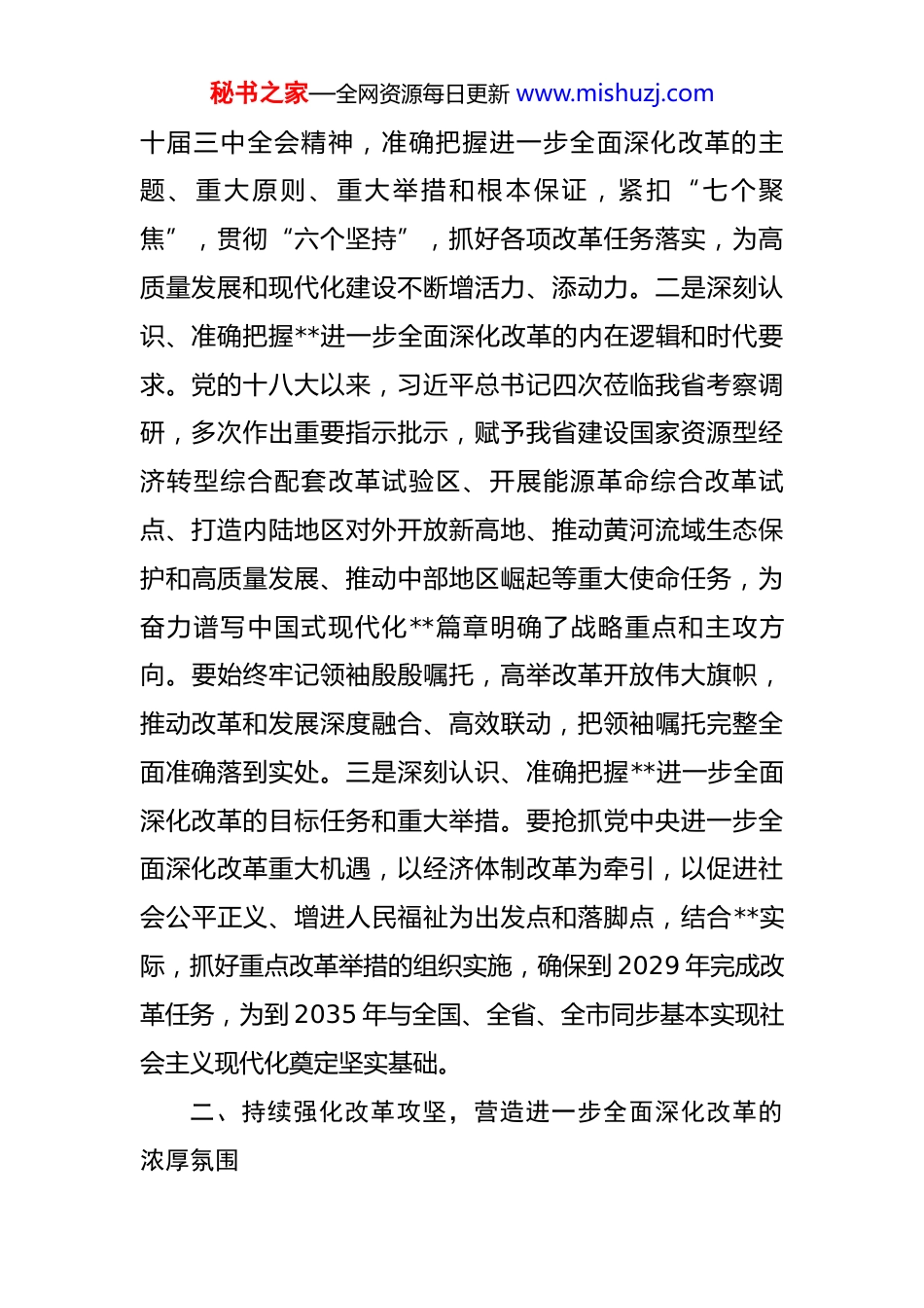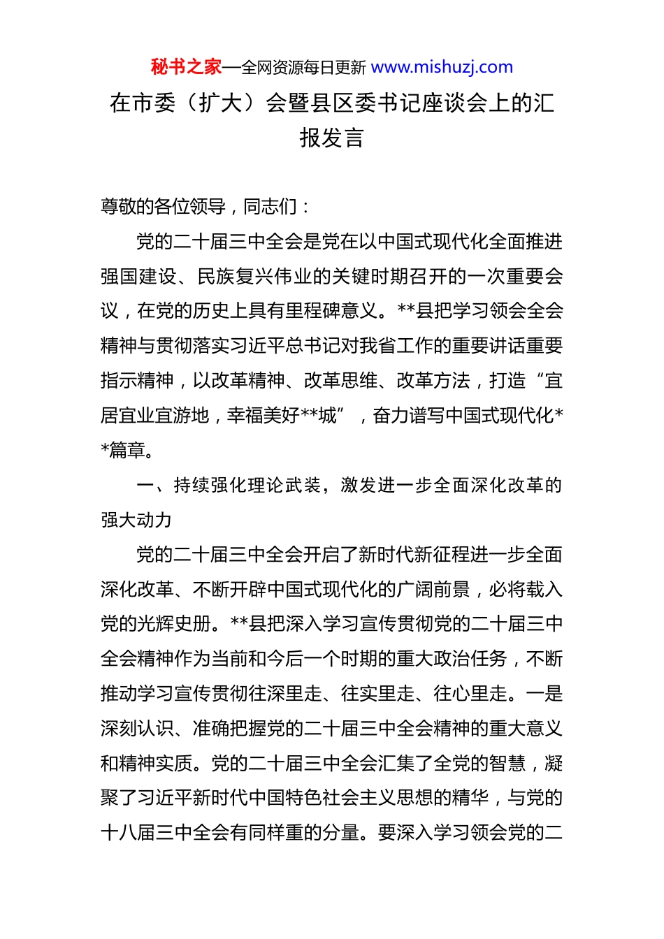 秘书之家—全网资源每日更新www.mishuzj.com在市委(扩大)会暨县区委书记座谈会上的汇报发言尊敬的各位领导,同志们:党的二十届三中全会是党在以中国式现代化全面推进强国建设、民族复兴伟业的关键时期召开的一次重要会议,在党的历史上具有里程碑意义。**县把学习领会全会精神与贯彻落实习近平总书记对我省工作的重要讲话重要指示精神,以改革精神、改革思维、改革方法,打造“宜居宜业宜游地,幸福美好**城”,奋力谱写中国式现代化**篇章。一、持续强化理论武装,激发进一步全面深化改革的强大动力党的二十届三中全会开启了新时代新征程进一步全面深化改革、不断开辟中国式现代化的广阔前景,必将载入党的光辉史册。**县把深入学习宣传贯彻党的二十届三中全会精神作为当前和今后一个时期的重大政治任务,不断推动学习宣传贯彻往深里走、往实里走、往心里走。一是深刻认识、准确把握党的二十届三中全会精神的重大意义和精神实质。党的二十届三中全会汇集了全党的智慧,凝聚了习近平新时代中国特色社会主义思想的精华,与党的十八届三中全会有同样重的分量。要深入学习领会党的二秘书之家—全网资源每日更新www.mishuzj.com十届三中全会精神,准确把握进一步全面深化改革的主题、重大原则、重大举措和根本保证,紧扣“七个聚焦”,贯彻“六个坚持”,抓好各项改革任务落实,为高质量发展和现代化建设不断增活力、添动力。二是深刻认识、准确把握**进一步全面深化改革的内在逻辑和时代要求。党的十八大以来,习近平总书记四次莅临我省考察调研,多次作出重要指示批示,赋予我省建设国家资源型经济转型综合配套改革试验区、开展能源革命综合改革试点、打造内陆地区对外开放新高地、推动黄河流域生态保护和高质量发展、推动中部地区崛起等重大使命任务,为奋力谱写中国式现代化**篇章明确了战略重点和主攻方向。要始终牢记领袖殷殷嘱托,高举改革开放伟大旗帜,推动改革和发展深度融合、高效联动,把领袖嘱托完整全面准确落到实处。三是深刻认识、准确把握**进一步全面深化改革的目标任务和重大举措。要抢抓党中央进一步全面深化改革重大机遇,以经济体制改革为牵引,以促进社会公平正义、增进人民福祉为出发点和落脚点,结合**实际,抓好重点改革举措的组织实施,确保到2029年完成改革任务,为到2035年与全国、全省、全市同步基本实现社会主义现代化奠定坚实基础。二、持续强化改革攻坚,营造进一步全面深化改革的浓厚氛围秘书之家—全网资源每日更新www.mishuzj.com全面深化改革越是向纵深推进,触及的利益矛盾越是复杂尖锐,硬骨头越难啃,每前进一步都不容易。一是吃透要求抓改革。改革举措要落实好,必先理解好、领会透、把得准,才能落得实、不走样。理解偏颇、误解误读,落实就会跑调、走样。站在推进中国式现代化的战略全局高度,准确把握进一步全面深化改革的指导思想、主题、总目标、重大原则、根本保证,正确认识全面深化改革的谋篇布局,准确理解每项改革举措的背景和定位、指向和内涵。二是突出重点抓改革。进一步全面深化改革,形势更为复杂,任务更加繁重,要牵住经济体制改革这个“牛鼻子”,聚力培育和发展新质生产力、促进城乡融合发展等,有计划、有步骤地推出一批突破性、关键性、标志性的改革事项,高标准、高质量完成每一项重点改革,确保干一件成一件,创造出更多“**经验”和“**模式”。三是务求实效抓改革。改革是推动发展、造福人民的事业,是评价和检验改革成效的标准。改革是由问题倒逼而产生,又在不断解决问题中得以深化。要坚持目标导向和问题导向相结合,坚持从实际出发,既要有尽力而为的进取精神,又要有量力而行的务实作风,始终树立坚持以人民为中心的改革价值取向,通过抓改革来促发展,围绕谋发展来抓改革,以实绩实效和人民群众满意度检验改革。四是压实责任抓改革。抓好改革落实,关键在于抓好秘书之家—全网资源每日更新www.mishuzj.com改革责任落实。要保持战略定力,拿出求真、认真、较真的精神,紧盯目标、心无旁骛,一以贯之、一如既往、一抓到底,倾尽全力打通改革措施的“最后一公里”,全力以赴把各项改革持续推向深入。三、持续...
