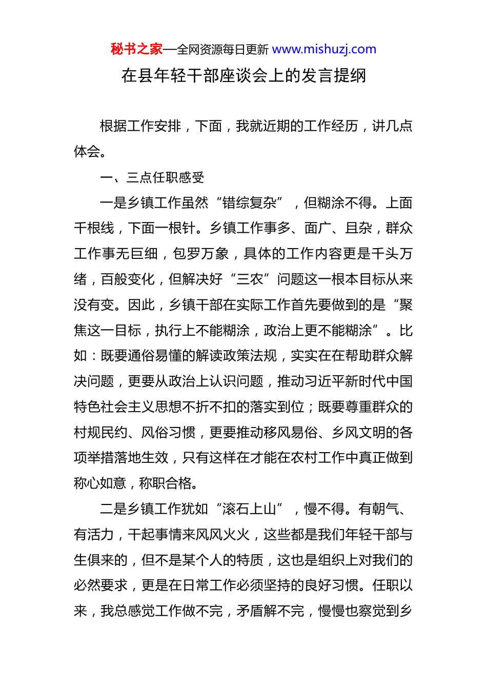 秘书之家—全网资源每日更新www.mishuzj.com在县年轻干部座谈会上的发言提纲根据工作安排,下面,我就近期的工作经历,讲几点体会。一、三点任职感受一是乡镇工作虽然“错综复杂”,但糊涂不得。上面千根线,下面一根针。乡镇工作事多、面广、且杂,群众工作事无巨细,包罗万象,具体的工作内容更是千头万绪,百般变化,但解决好“三农”问题这一根本目标从来没有变。因此,乡镇干部在实际工作首先要做到的是“聚焦这一目标,执行上不能糊涂,政治上更不能糊涂”。比如:既要通俗易懂的解读政策法规,实实在在帮助群众解决问题,更要从政治上认识问题,推动习近平新时代中国特色社会主义思想不折不扣的落实到位;既要尊重群众的村规民约、风俗习惯,更要推动移风易俗、乡风文明的各项举措落地生效,只有这样在才能在农村工作中真正做到称心如意,称职合格。二是乡镇工作犹如“滚石上山”,慢不得。有朝气、有活力,干起事情来风风火火,这些都是我们年轻干部与生俱来的,但不是某个人的特质,这也是组织上对我们的必然要求,更是在日常工作必须坚持的良好习惯。任职以来,我总感觉工作做不完,矛盾解不完,慢慢也察觉到乡秘书之家—全网资源每日更新www.mishuzj.com镇工作靠日常的“走”太慢,靠突击的“跑”还是不快,唯有常态化、勤奋的“跑”才能做到今日事、今日毕。比如:在服务工业三年倍增行动中,我们聚焦县委提出的“权力在阳光下运行、干部在阳光下创业、企业在阳光下成长”的“三个阳光”要求,坚持不拖、不等、不退、不推的“四不”工作作风,白天跑着干、晚上想着干,xx公里的园区尾水管网征地工作xx天完成,搁置了3年多的土地纠纷29天调处完成,拖延了xx年之久的祖坟山征迁工作2个月内攻克,助推了xx、xx等“xx”项目顺利推进。三是乡镇工作必须“抓铁有痕”,虚不得。乡镇一级的工作从来都是具体的,来不得半点虚工,乡镇干部的天职就是抓落实,年轻干部到乡镇工作后必须要学会的就是“落实”二字,要在灵魂深处深耕抓落实的思想自觉,做到“实打实”“硬碰硬”。比如:在产业发展中,我们聚焦市党代会提出的“着力发展xx,建成xx”的要求,认真落实县委确定的具体工作路径,分三期推进xx亩蔬菜大棚建设,一期已建成xx亩,二期正在建设xx亩,三期已流转土地,正在规划设计xx亩。二、三点工作困惑一是想大力推动乡镇快速发展,但发展的能力不足。在乡镇最想干的事就是“解决发展滞后的问题”,特别是想把乡镇的产业和就业搞上去,但很多时候觉得是“一拳秘书之家—全网资源每日更新www.mishuzj.com打在棉花上”,能做的不多、能想的办法也不给力。比如:在集镇发展上,规划包装了农民创业就业中心、农资交易中心等聚人引流、商贸交易的基础设施,但在实施过程中,因为土地问题、环保问题、招商问题,最终只是通过专项债申报到一个冷链物流交易市场项目,推进商贸重镇建设任重道远。二是想不断改善信访环境,但行之有效的操作办法不够。乡镇工作最闹心的是信访问题,但在解决信访问题的同时,更想解决的是信访问题背后的风气问题。比如:xx年xx月至xx年xx月,xx村群众对古村建设、干部作风等问题进行不间断的信访,2年间信访件接近xx件,导致村庄内各项工作全面瘫痪,针对这一问题,我们组建了3个专班组,走遍了每一户群众,拜访了每一名乡贤,摸清了问题的根源,兑现了政府的承诺,到xx年xx月,实现了停访息诉,终止了检举控告。但我们现在仍然感觉到社会面上“信访不信法”“信上不信下”的问题还是存在,因此,我们乡镇特别希望新《信访工作条例》实施后,能针对“诉访分离”机制出台更加具体、更加细化的操作办法和工作流程,逐步改善信访环境。三是想把工作抓实抓细,但又陷入了忙忙碌碌的事务之中。乡镇虽小,五脏俱全,各项工作都不能放松,在工作中,我总感觉各项工作都要去思考、去摆布,一旦放松秘书之家—全网资源每日更新www.mishuzj.com了对某一项工作的调度,这项工作就很容易落后,这种工作感觉就像“弹钢琴”要无时不刻的盯着曲谱,机械循环一样,久而久之就陷入了事务之中。这种矛盾和困惑归根结底还是统筹兼顾的能力跟不上创先争优的要求造成的。三...