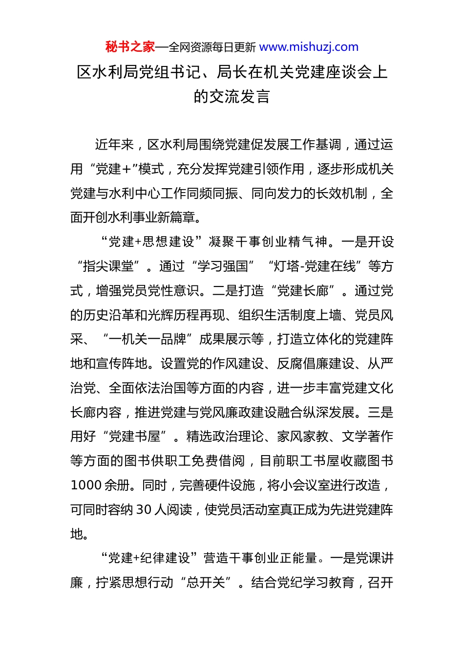 秘书之家—全网资源每日更新www.mishuzj.com区水利局党组书记、局长在机关党建座谈会上的交流发言近年来,区水利局围绕党建促发展工作基调,通过运用“党建+”模式,充分发挥党建引领作用,逐步形成机关党建与水利中心工作同频同振、同向发力的长效机制,全面开创水利事业新篇章。“党建+思想建设”凝聚干事创业精气神。一是开设“指尖课堂”。通过“学习强国”“灯塔-党建在线”等方式,增强党员党性意识。二是打造“党建长廊”。通过党的历史沿革和光辉历程再现、组织生活制度上墙、党员风采、“一机关一品牌”成果展示等,打造立体化的党建阵地和宣传阵地。设置党的作风建设、反腐倡廉建设、从严治党、全面依法治国等方面的内容,进一步丰富党建文化长廊内容,推进党建与党风廉政建设融合纵深发展。三是用好“党建书屋”。精选政治理论、家风家教、文学著作等方面的图书供职工免费借阅,目前职工书屋收藏图书1000余册。同时,完善硬件设施,将小会议室进行改造,可同时容纳30人阅读,使党员活动室真正成为先进党建阵地。“党建+纪律建设”营造干事创业正能量。一是党课讲廉,拧紧思想行动“总开关”。结合党纪学习教育,召开秘书之家—全网资源每日更新www.mishuzj.com党风廉政建设警示教育会4次,各党支部开展讲廉政党课,深化党风廉政教育成果。二是教育醒廉,敲响拒腐防变“警示钟”。用好用足警示教育“活教材”,组织党员干部到红旗渠、廉政教育基地开展廉政教育,进一步强化警示教育活动效果。三是文化育廉,涵养风清气正“好生态”。深化廉洁文化建设,充分发挥廉洁文化的教育、示范、熏陶和导向作用,在机关营造浓厚“以清为美、以廉为荣”氛围。“党建+业务建设”铭记使命干事创业敢担当。一是项目强基,党员干部主动协调施工、监理及相关部门,对项目质量、进度等做到有党组织紧盯、困难时刻有党员冲锋。强力推进德州市骨干河道引调水工程及漳卫河分洪工程,头屯干渠、沙杨河区域工程,持续提升我区引黄灌溉和防汛排涝能力。二是安全度汛,统筹做好会商研判,严格落实24小时值班制度,动态调整水旱灾害防御措施,积极组织开展群众性应急演练,不间断排查整治辖区水利设施、河道隐患。三是保护河湖,充分发挥基层党组织作用,聚焦河湖保护治理,逐步形成组织引领、党员带动、群众参与“三位一体”的强大护河合力。目前,通过省市河长办验收整改“四乱”问题20项,其中拆除蔬菜大棚2万余平方米,涉河违规建筑物、构筑物13处,清理河道垃圾800余吨,清理乱堆乱占问题2处,区域河湖面貌明显秘书之家—全网资源每日更新www.mishuzj.com改善。