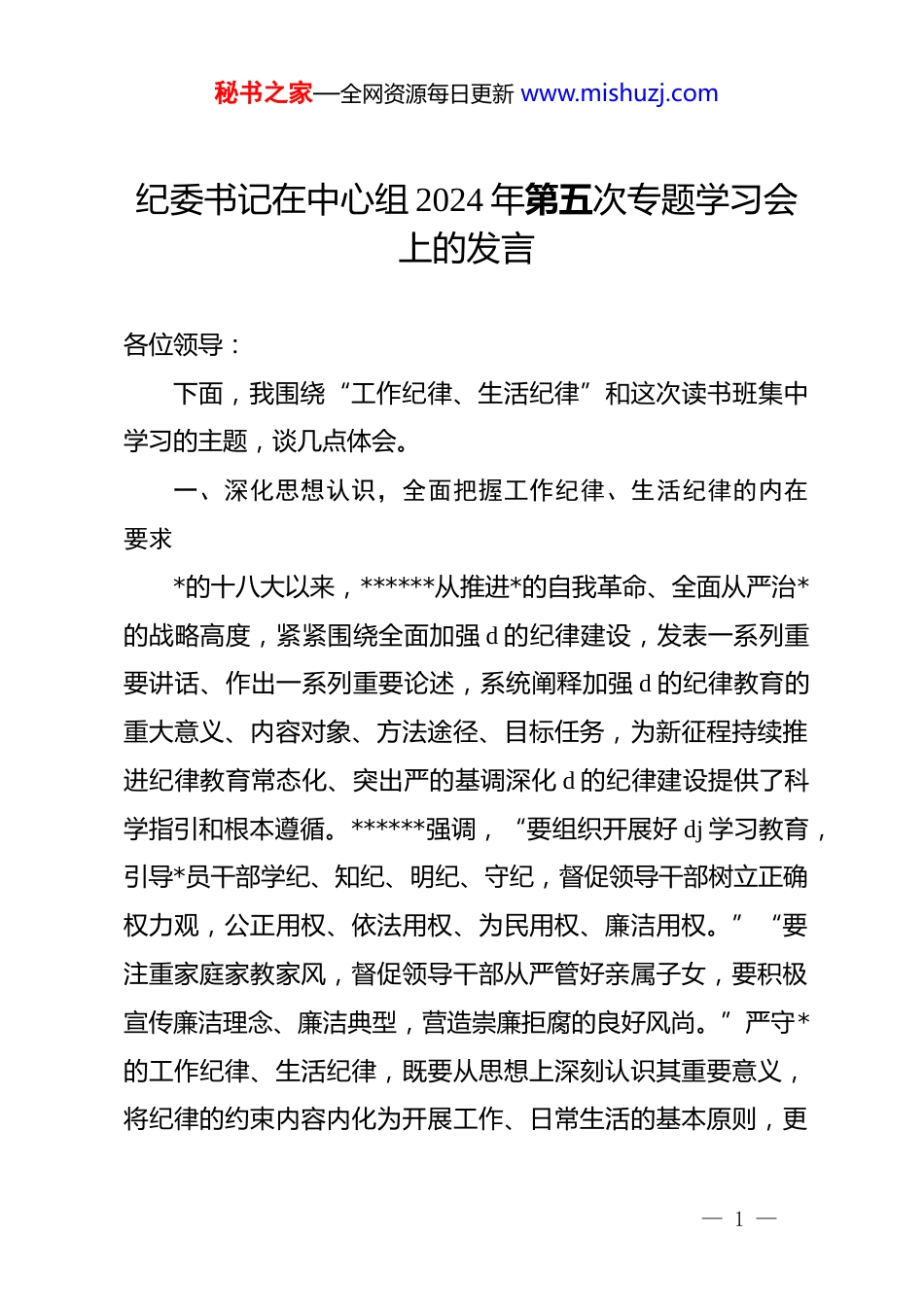 秘书之家—全网资源每日更新www.mishuzj.com纪委书记在中心组2024年第五次专题学习会上的发言各位领导:下面,我围绕“工作纪律、生活纪律”和这次读书班集中学习的主题,谈几点体会。一、深化思想认识,全面把握工作纪律、生活纪律的内在要求*的十八大以来,******从推进*的自我革命、全面从严治*的战略高度,紧紧围绕全面加强d的纪律建设,发表一系列重要讲话、作出一系列重要论述,系统阐释加强d的纪律教育的重大意义、内容对象、方法途径、目标任务,为新征程持续推进纪律教育常态化、突出严的基调深化d的纪律建设提供了科学指引和根本遵循。******强调,“要组织开展好dj学习教育,引导*员干部学纪、知纪、明纪、守纪,督促领导干部树立正确权力观,公正用权、依法用权、为民用权、廉洁用权。”“要注重家庭家教家风,督促领导干部从严管好亲属子女,要积极宣传廉洁理念、廉洁典型,营造崇廉拒腐的良好风尚。”严守*的工作纪律、生活纪律,既要从思想上深刻认识其重要意义,将纪律的约束内容内化为开展工作、日常生活的基本原则,更—1—秘书之家—全网资源每日更新www.mishuzj.com要准确把握恪守工作纪律和生活纪律的实践要求。作为*员干部,我们要深刻认识严守工作纪律、生活纪律的重要意义,全面把握工作纪律、生活纪律的内在要求,坚持把工作纪律、生活纪律融入日常、抓在经常,防微杜渐,不断增强政治定力、纪律定力、道德定力、抵腐定力,始终做到忠诚干净担当。要时刻严格约束自己,工作中,持续纠治“四风”,树立真抓实干的工作作风,以时时放心不下的责任感、积极担当作为的精气神履好职、尽好责;要守住守牢生活关、亲情关,时刻保持清醒和警觉,自觉把修身、齐家落到实处,坚决做到依规用权、依法用权、秉公用权、廉洁用权。二、强化*章意识,习惯在纪律约束下干净干事******强调,“要加强警示教育,抓好以案促学、以案说纪,让心存敬畏、手握戒尺真正成为日常自觉”“要牢固树立*章意识,更加自觉地学习*章、遵守*章、贯彻*章、维护*章,用*章*规dj约束自己的一言一行,增强纪律意识、规矩意识,进一步养成在受监督和约束的环境中工作生活的习惯。”*章是我们立*、治*、管*的总章程,是全*最基本、最重要、最全面的行为规范,认真学习*章、严格遵守*章,是******对全*发出的号召、提出的重要要求。我们要进一步强化*章意识,知敬畏、存戒惧、守底线,以*章*规dj为镜,真正把*章作为加强*性修—2—秘书之家—全网资源每日更新www.mishuzj.com养的根本标准,切实把*章各项规定要求落实到行动上、体现在工作中,自觉养成在纪律约束下干净干事。在生活上,要带头涵养新时代共产*人的良好家风,落实*章*规dj一以贯之的要求,清白做人、勤俭齐家、干净做事、廉洁从政,管好自己和家人,坚决守住拒腐防变的思想防线。在工作上,要深入学习与本职岗位相关的纪律规定,经常对照*章*规dj,分析查找本职岗位可能存在的廉政风险点,积极解决问题,着力防范风险。要把开展dj学习教育和贯彻落实上级决策部署工作安排结合起来,与抓好我市中心工作结合起来,紧紧围绕**发展的目标定位,不断完善推动高质量发展的思路举措,切实找准制约新区发展新质生产力,推动高质量发展的堵点难点,统筹抓好项目建设、特色产业、乡村振兴等各项中心工作,确保高质高效完成全年目标任务。三、严明纪律规矩,进一步推动*员干部学纪知纪明纪守纪******强调,“扎实开展dj学习教育,引导*员、干部真正把纪律规矩转化为政治自觉、思想自觉、行动自觉,进一步推动*员干部学纪知纪明纪守纪。”我们要深入学习贯彻***关于加强d的纪律建设的重要论述精神,以全*开展dj学习教育为契机,坚持*性*风dj一起抓,教育引导*员、干部学纪、知纪明纪、守纪,把增强*性、严守纪律、砥砺作风融入日常、化为—3—秘书之家—全网资源每日更新www.mishuzj.com习惯。一要坚决纠治形式主义、官僚主义。形式主义、官僚主义是*的大敌、人民的大敌。我们要牢固树立和践行正确政绩观,坚持立足实际、科学决策,坚持着眼长远、打牢基础,坚持干在实处、务求实效,在纠治形式主义、官僚主义上,真正把自己摆进来、把职责摆进...