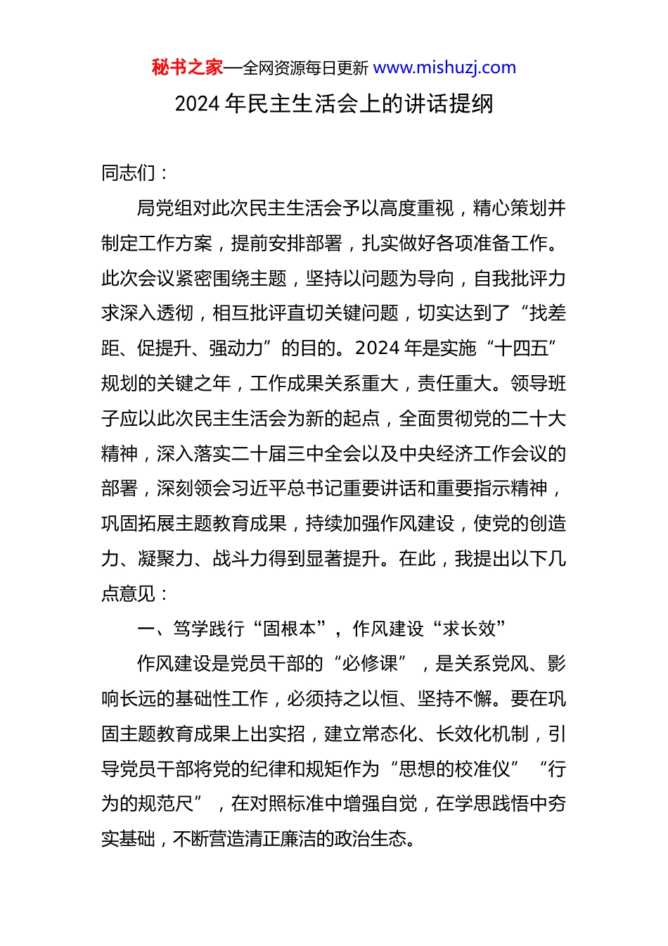 秘书之家—全网资源每日更新www.mishuzj.com2024年民主生活会上的讲话提纲同志们:局党组对此次民主生活会予以高度重视,精心策划并制定工作方案,提前安排部署,扎实做好各项准备工作。此次会议紧密围绕主题,坚持以问题为导向,自我批评力求深入透彻,相互批评直切关键问题,切实达到了“找差距、促提升、强动力”的目的。2024年是实施“十四五”规划的关键之年,工作成果关系重大,责任重大。领导班子应以此次民主生活会为新的起点,全面贯彻党的二十大精神,深入落实二十届三中全会以及中央经济工作会议的部署,深刻领会习近平总书记重要讲话和重要指示精神,巩固拓展主题教育成果,持续加强作风建设,使党的创造力、凝聚力、战斗力得到显著提升。在此,我提出以下几点意见:一、笃学践行“固根本”,作风建设“求长效”作风建设是党员干部的“必修课”,是关系党风、影响长远的基础性工作,必须持之以恒、坚持不懈。要在巩固主题教育成果上出实招,建立常态化、长效化机制,引导党员干部将党的纪律和规矩作为“思想的校准仪”“行为的规范尺”,在对照标准中增强自觉,在学思践悟中夯实基础,不断营造清正廉洁的政治生态。秘书之家—全网资源每日更新www.mishuzj.com要将强作风与铸党性紧密结合。党性修养是党员的终身课题,没有终点,只有不断前进的过程。政治修养是党性修养的核心,是党员干部的立身之本,必须常抓不懈、不断深化。要把政治修养作为首要课程,从党的创新理论中汲取“精神力量”,在党章党规中磨砺“思想武器”,筑牢理想信念的“基石”,锤炼对党忠诚的“脊梁”,以“坚定初心”践行使命担当。要将守纪律与干事业有机统一。纪律既是“红线”,也是“保障线”,既是“屏障”,更是“动力源”。正确运用纪律这把“尺子”,不是要束缚党员干部的手脚,而是要通过“明方向、定规则、正风气、强免疫”,激发干事创业的活力,营造积极作为、勇于担当的政治氛围。要在纪律的框架内大胆创新、积极工作,既严守底线,又勇于探索,切实将主题教育成果转化为推动高质量发展的强大动力。要将作风建设与反腐败斗争协同推进。始终保持敬畏之心,将纪律和规矩挺在前面,筑牢“防线”,增强“抵抗力”,做到慎权、慎初、慎微、慎友,确保权力在“纪律轨道”上规范运行。反腐败斗争永远在路上,只要腐败滋生的土壤还存在,全面从严治党的行动就不会停止。必须以“零容忍”的态度强化纪律、严格执行,以“自我革命”的勇气持续筑牢拒腐防变的“坚固防线”。秘书之家—全网资源每日更新www.mishuzj.com二、坚守初心“为人民”,增进福祉“出实招”人民是党的根基,是血脉所在、力量之源。践行“为人民服务”的宗旨,关键在于深刻理解“以人民为中心”的内涵,将群众的需求作为工作的“指南”。要从革命先辈的事迹中汲取“为民情怀”,从先进模范的行为中学习“务实精神”,始终把“为民造福”作为最大政绩。要牢记“脚踏实地,真抓实干”的重要原则,坚持从实践中获取真理,在实干中增长才干,在岗位上尽职尽责,真正做到“为民众排忧解难、为民众缓解困境、为民众温暖心灵”。人民立场是中国共产党的根本立场,只有把人民放在心中,才能确保工作的方向正确、基础牢固。必须始终把实现好、维护好、发展好最广大人民的根本利益作为一切工作的出发点和落脚点,真正做到民有所呼、我有所应。要坚持深入基层、贴近群众,走进农村、社区、企业,深入医院、学校,与群众面对面交流、心贴心沟通,真正做到“问需于民、问计于民、问效于民”。要善于运用调查研究这一“有力武器”,紧紧围绕住房、养老、教育、环保等民生热点问题,将群众的“烦心事”转化为“安心事”,将民生需求“项目化”,确保各项工作更加精准、更加有效。要培育“与民共情”的情感,始终对群众的冷暖保持秘书之家—全网资源每日更新www.mishuzj.com高度敏感,把群众的事情当作自己的事情,扑下身子、深入一线,将“为民服务”理念贯穿工作始终。要强化责任担当,把“增进民生福祉”作为首要任务,聚焦群众最关切、最直接、最现实的利益问题,发扬“雷厉风行、真抓实干”的工作作风,以“时不我待、只争朝夕”的责...