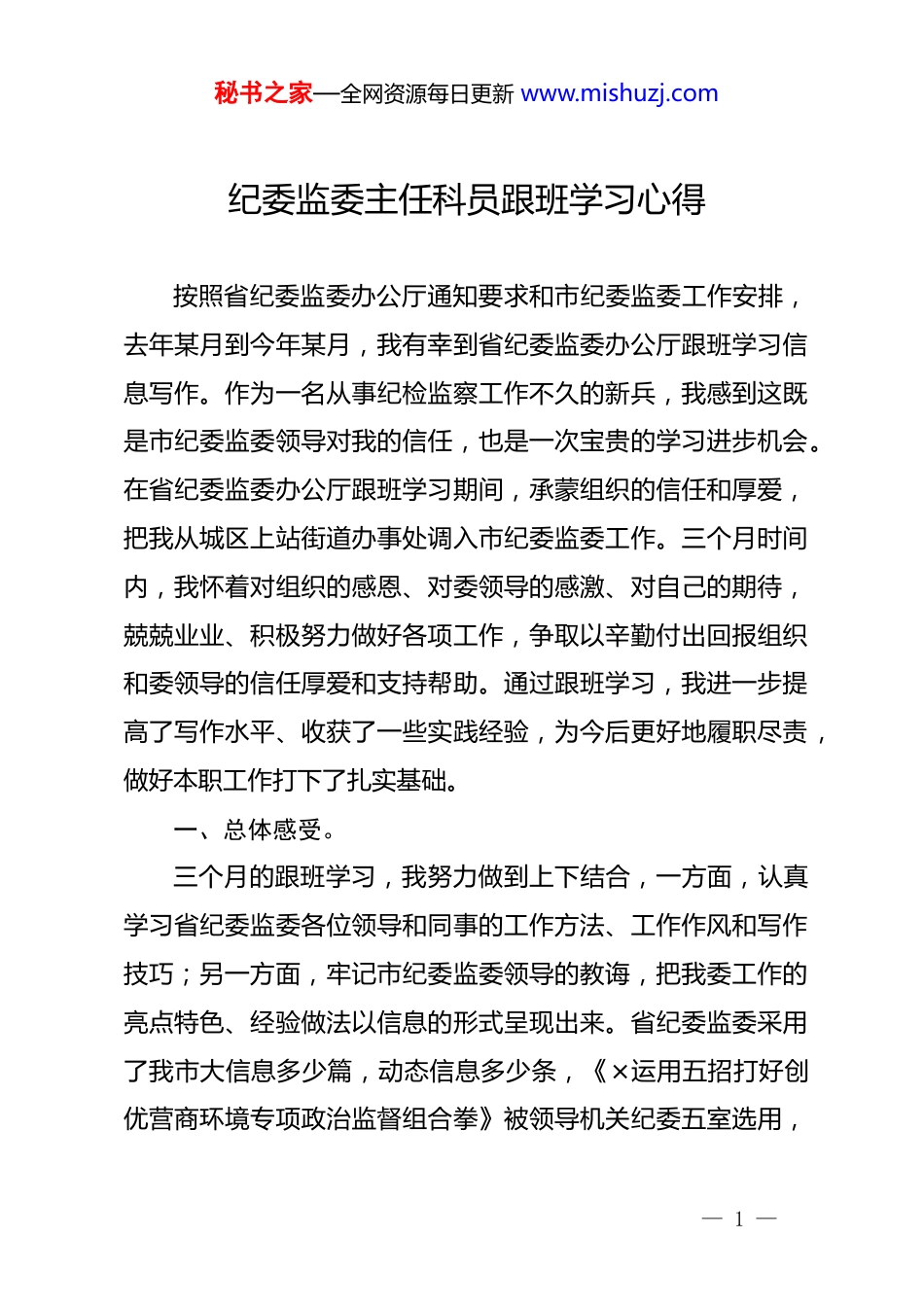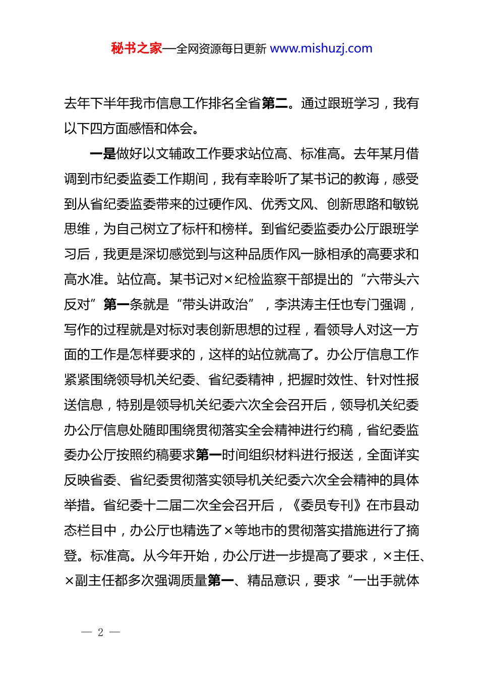 秘书之家—全网资源每日更新www.mishuzj.com纪委监委主任科员跟班学习心得按照省纪委监委办公厅通知要求和市纪委监委工作安排,去年某月到今年某月,我有幸到省纪委监委办公厅跟班学习信息写作。作为一名从事纪检监察工作不久的新兵,我感到这既是市纪委监委领导对我的信任,也是一次宝贵的学习进步机会。在省纪委监委办公厅跟班学习期间,承蒙组织的信任和厚爱,把我从城区上站街道办事处调入市纪委监委工作。三个月时间内,我怀着对组织的感恩、对委领导的感激、对自己的期待,兢兢业业、积极努力做好各项工作,争取以辛勤付出回报组织和委领导的信任厚爱和支持帮助。通过跟班学习,我进一步提高了写作水平、收获了一些实践经验,为今后更好地履职尽责,做好本职工作打下了扎实基础。一、总体感受。三个月的跟班学习,我努力做到上下结合,一方面,认真学习省纪委监委各位领导和同事的工作方法、工作作风和写作技巧;另一方面,牢记市纪委监委领导的教诲,把我委工作的亮点特色、经验做法以信息的形式呈现出来。省纪委监委采用了我市大信息多少篇,动态信息多少条,《×运用五招打好创优营商环境专项政治监督组合拳》被领导机关纪委五室选用,—1—秘书之家—全网资源每日更新www.mishuzj.com去年下半年我市信息工作排名全省第二。通过跟班学习,我有以下四方面感悟和体会。一是做好以文辅政工作要求站位高、标准高。去年某月借调到市纪委监委工作期间,我有幸聆听了某书记的教诲,感受到从省纪委监委带来的过硬作风、优秀文风、创新思路和敏锐思维,为自己树立了标杆和榜样。到省纪委监委办公厅跟班学习后,我更是深切感觉到与这种品质作风一脉相承的高要求和高水准。站位高。某书记对×纪检监察干部提出的“六带头六反对”第一条就是“带头讲政治”,李洪涛主任也专门强调,写作的过程就是对标对表创新思想的过程,看领导人对这一方面的工作是怎样要求的,这样的站位就高了。办公厅信息工作紧紧围绕领导机关纪委、省纪委精神,把握时效性、针对性报送信息,特别是领导机关纪委六次全会召开后,领导机关纪委办公厅信息处随即围绕贯彻落实全会精神进行约稿,省纪委监委办公厅按照约稿要求第一时间组织材料进行报送,全面详实反映省委、省纪委贯彻落实领导机关纪委六次全会精神的具体举措。省纪委十二届二次全会召开后,《委员专刊》在市县动态栏目中,办公厅也精选了×等地市的贯彻落实措施进行了摘登。标准高。从今年开始,办公厅进一步提高了要求,×主任、×副主任都多次强调质量第一、精品意识,要求“一出手就体—2—秘书之家—全网资源每日更新www.mishuzj.com现最高水平,拿出来就是精品”,每篇信息都要认真甄选,争取优中选优。编辑工作不仅在内容上逐字逐句反复推敲、校对,对文中的具体做法、数据也力求准确、详实,对有意向刊登的信息,都反复和相关地市沟通核实。今年来,已有多篇信息相继被领导机关纪委选用,这和工作上的高标准、严要求密不可分。二是做好以文辅政工作要求付出多、功底厚。来到市纪委办公室工作后,同事们总是加班加点忙碌,某书记也总是亲自把关批阅和修改材料,我深深地被这种工作氛围感染,明白要做好纪检监察工作,需要无怨无悔的付出,加得了班、受得了累、吃得了苦。到省纪委监委报到后,办公厅领导也叮嘱,这里工作比较辛苦,信息工作每天要接触到委机关各部门、各市纪委监委、各派驻机构、省管高校企业纪检监察机构报送的大量信息,每天工作任务很饱满,要有充分思想准备。三个月的实践中,我感到整个办公厅和市纪委各部门一样,每天都是高强度地运转。做信息工作的领导同事,大都是提前来上班、推迟时间下班,加班加点撰写信息、核对,晚上加班是常态。另外,从大量基础材料中提炼、总结、升华典型做法经验,形成供领导决策参考的有份量信息,需要有深厚的功底。我也常常帮助办公厅其他从事工作的同事做一些辅助工作,包括校对、—3—秘书之家—全网资源每日更新www.mishuzj.com收集资料、打印文件,也参与写一些其他材料,一方面是让自己尽快上手,能够熟悉办公厅的工作,同时也是借助这样的机会能够接触大量的高质量稿件,更好地向办...