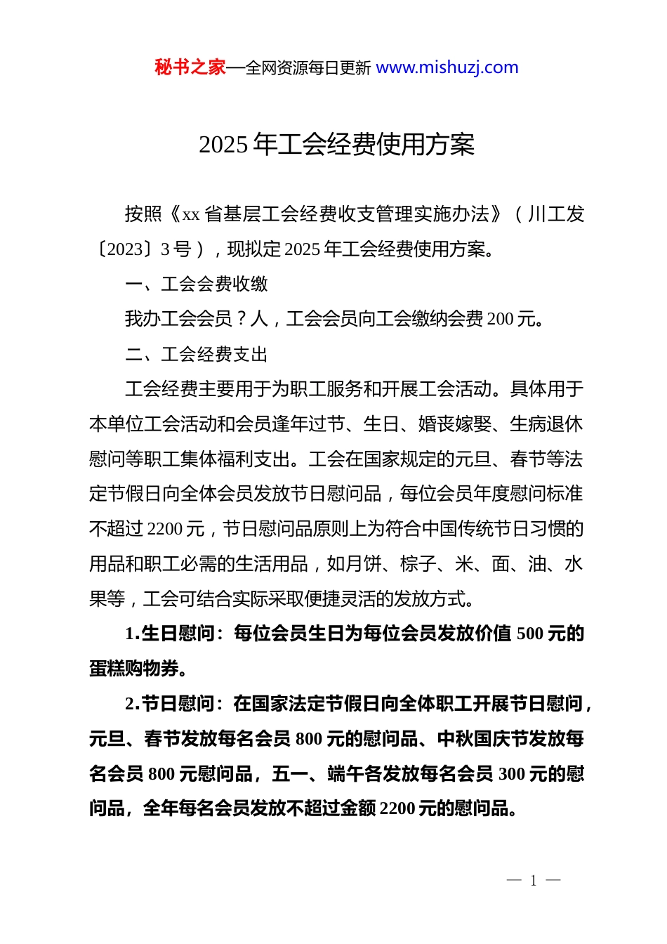 秘书之家—全网资源每日更新 www.mishuzj.com2025 年工会经费使用方案按照《xx 省基层工会经费收支管理实施办法》(川工发〔2023〕3 号),现拟定 2025 年工会经费使用方案。一、工会会费收缴我办工会会员?人,工会会员向工会缴纳会费 200 元。二、工会经费支出工会经费主要用于为职工服务和开展工会活动。具体用于本单位工会活动和会员逢年过节、生日、婚丧嫁娶、生病退休慰问等职工集体福利支出。工会在国家规定的元旦、春节等法定节假日向全体会员发放节日慰问品,每位会员年度慰问标准不超过 2200 元,节日慰问品原则上为符合中国传统节日习惯的用品和职工必需的生活用品,如月饼、棕子、米、面、油、水果等,工会可结合实际采取便捷灵活的发放方式。1.生日慰问:每位会员生日为每位会员发放价值 500 元的蛋糕购物券。2.节日慰问:在国家法定节假日向全体职工开展节日慰问,元旦、春节发放每名会员 800 元的慰问品、中秋国庆节发放每名会员 800 元慰问品,五一、端午各发放每名会员 300 元的慰问品,全年每名会员发放不超过金额 2200 元的慰问品。— 1 —秘书之家—全网资源每日更新 www.mishuzj.com3.其他慰问:工会会员结婚或符合政策生育,向本人发放不超过 800 元的慰问品;工会会员退休,可以发放不超过 800元的纪念品。工会会员因病手术或住院的给予不超过 1000 元的慰问金或慰问品;工会会员去世时,给予不高于 2000 元的慰问金;工会会员直系亲属(限于配偶、父母、子女)去世时,给予不高于 1000 元的慰问金。4.工会活动:每年组织至少开展两次工作活动,活动内容健康向上,通过活动引导工会会员适当调节工作压力,养成良好健康生活方式。每次活动计划活动经费计划 3000 元,视具体工会经费情况定,每次活动前单独制定活动方案。5.工会经费不够时从相关经费中列支。附件:2025 年工会会员花名册2025 年 1 月 23 日— 2 —