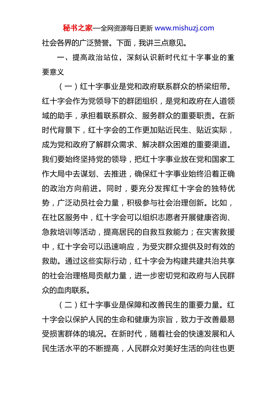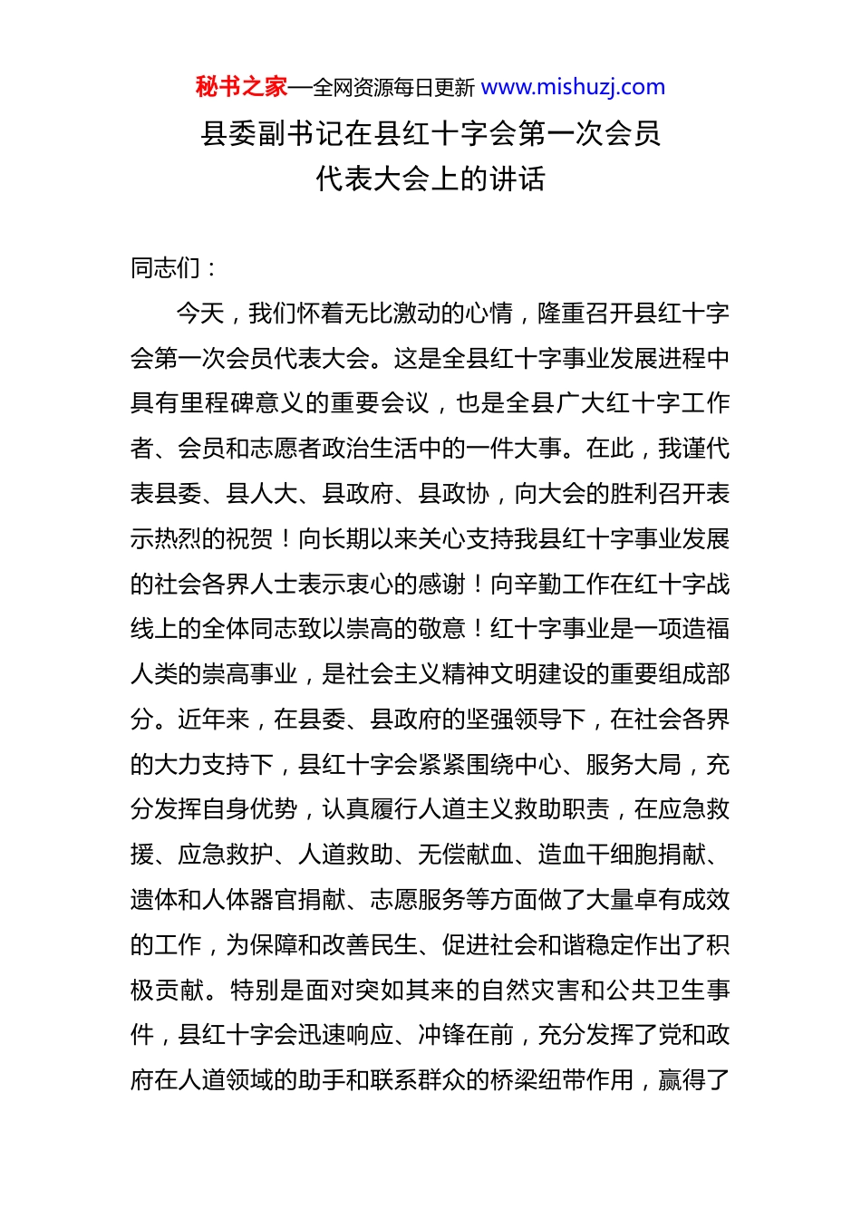 秘书之家—全网资源每日更新 www.mishuzj.com县委副书记在县红十字会第一次会员代表大会上的讲话 同志们:今天,我们怀着无比激动的心情,隆重召开县红十字会第一次会员代表大会。这是全县红十字事业发展进程中具有里程碑意义的重要会议,也是全县广大红十字工作者、会员和志愿者政治生活中的一件大事。在此,我谨代表县委、县人大、县政府、县政协,向大会的胜利召开表示热烈的祝贺!向长期以来关心支持我县红十字事业发展的社会各界人士表示衷心的感谢!向辛勤工作在红十字战线上的全体同志致以崇高的敬意!红十字事业是一项造福人类的崇高事业,是社会主义精神文明建设的重要组成部分。近年来,在县委、县政府的坚强领导下,在社会各界的大力支持下,县红十字会紧紧围绕中心、服务大局,充分发挥自身优势,认真履行人道主义救助职责,在应急救援、应急救护、人道救助、无偿献血、造血干细胞捐献、遗体和人体器官捐献、志愿服务等方面做了大量卓有成效的工作,为保障和改善民生、促进社会和谐稳定作出了积极贡献。特别是面对突如其来的自然灾害和公共卫生事件,县红十字会迅速响应、冲锋在前,充分发挥了党和政府在人道领域的助手和联系群众的桥梁纽带作用,赢得了秘书之家—全网资源每日更新 www.mishuzj.com社会各界的广泛赞誉。下面,我讲三点意见。一、提高政治站位,深刻认识新时代红十字事业的重要意义(一)红十字事业是党和政府联系群众的桥梁纽带。红十字会作为党领导下的群团组织,是党和政府在人道领域的助手,承担着联系群众、服务群众的重要职责。在新时代背景下,红十字会的工作更加贴近民生、贴近实际,成为党和政府了解群众需求、解决群众困难的重要渠道。我们要始终坚持党的领导,把红十字事业放在党和国家工作大局中去谋划、去推进,确保红十字事业始终沿着正确的政治方向前进。同时,要充分发挥红十字会的独特优势,广泛动员社会力量,积极参与社会治理创新。比如,在社区服务中,红十字会可以组织志愿者开展健康咨询、急救培训等活动,提高居民的自救互救能力;在灾害救援中,红十字会可以迅速响应,为受灾群众提供及时有效的救助。通过这些实际行动,红十字会为构建共建共治共享的社会治理格局贡献力量,进一步密切党和政府与人民群众的血肉联系。(二)红十字事业是保障和改善民生的重要力量。红十字会以保护人民的生命和健康为宗旨,致力于改善最易受损害群体的境况。在新时代,随着社会的快速发展和人民生活水平的不断提高,人民群众对美好生活的向往也更秘书之家—全网资源每日更新 www.mishuzj.com加强烈。我们要牢固树立以人民为中心的发展思想,把保障和改善民生作为红十字工作的出发点和落脚点。聚焦困难群众、弱势群体,积极开展人道救助、应急救护、健康关怀等工作。比如,针对贫困家庭,红十字会可以开展助医、助学、助困等救助活动,帮助他们解决实际困难;针对老年人、残疾人等弱势群体,红十字会可以提供健康检查、康复训练等服务,提高他们的生活质量。通过这些努力,我们努力让人民群众有更多获得感、幸福感、安全感,让红十字事业成为保障和改善民生的重要力量。(三)红十字事业是弘扬社会主义核心价值观的有效载体。红十字精神与社会主义核心价值观高度契合,是社会主义核心价值观的具体体现。红十字会所倡导的“人道、博爱、奉献”精神,与社会主义核心价值观中的“友善”“和谐”等价值理念相呼应。我们要把弘扬红十字精神与培育和践行社会主义核心价值观紧密结合起来,广泛开展红十字文化传播和志愿服务活动。比如,通过举办红十字知识讲座、开展红十字志愿服务活动等方式,引导社会各界积极参与红十字事业,营造向上向善、互帮互助的良好社会风尚。同时,我们还可以将红十字精神融入学校教育、企业文化等各个领域,让红十字精神成为全社会共同的价值追求。通过这些举措,我们不仅能够弘扬红十字精神,还能够为培育和践行社会主义核心价值观贡献力秘书之家—全网资源每日更新 www.mishuzj.com量。二、聚焦主责主业,奋力开创我县红十字事业发展新局面(一)强化应急救援能力建设,筑牢生命安全防线。应急救援是红十字会的核心业...