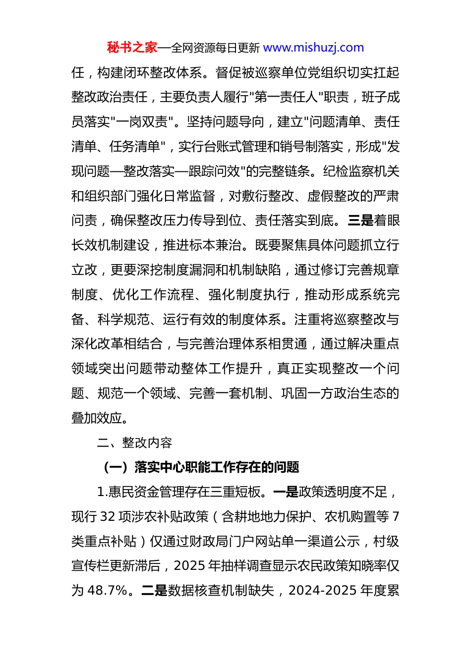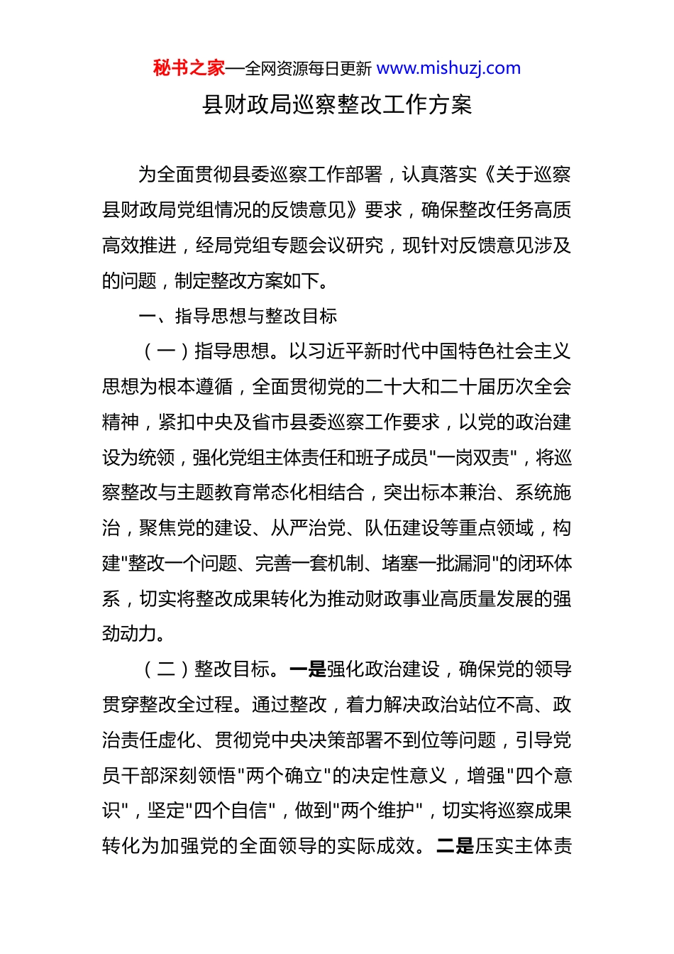 秘书之家—全网资源每日更新 www.mishuzj.com县财政局巡察整改工作方案 为全面贯彻县委巡察工作部署,认真落实《关于巡察县财政局党组情况的反馈意见》要求,确保整改任务高质高效推进,经局党组专题会议研究,现针对反馈意见涉及的问题,制定整改方案如下。 一、指导思想与整改目标(一)指导思想。以习近平新时代中国特色社会主义思想为根本遵循,全面贯彻党的二十大和二十届历次全会精神,紧扣中央及省市县委巡察工作要求,以党的政治建设为统领,强化党组主体责任和班子成员"一岗双责",将巡察整改与主题教育常态化相结合,突出标本兼治、系统施治,聚焦党的建设、从严治党、队伍建设等重点领域,构建"整改一个问题、完善一套机制、堵塞一批漏洞"的闭环体系,切实将整改成果转化为推动财政事业高质量发展的强劲动力。(二)整改目标。一是强化政治建设,确保党的领导贯穿整改全过程。通过整改,着力解决政治站位不高、政治责任虚化、贯彻党中央决策部署不到位等问题,引导党员干部深刻领悟"两个确立"的决定性意义,增强"四个意识",坚定"四个自信",做到"两个维护",切实将巡察成果转化为加强党的全面领导的实际成效。二是压实主体责秘书之家—全网资源每日更新 www.mishuzj.com任,构建闭环整改体系。督促被巡察单位党组织切实扛起整改政治责任,主要负责人履行"第一责任人"职责,班子成员落实"一岗双责"。坚持问题导向,建立"问题清单、责任清单、任务清单",实行台账式管理和销号制落实,形成"发现问题—整改落实—跟踪问效"的完整链条。纪检监察机关和组织部门强化日常监督,对敷衍整改、虚假整改的严肃问责,确保整改压力传导到位、责任落实到底。三是着眼长效机制建设,推进标本兼治。既要聚焦具体问题抓立行立改,更要深挖制度漏洞和机制缺陷,通过修订完善规章制度、优化工作流程、强化制度执行,推动形成系统完备、科学规范、运行有效的制度体系。注重将巡察整改与深化改革相结合,与完善治理体系相贯通,通过解决重点领域突出问题带动整体工作提升,真正实现整改一个问题、规范一个领域、完善一套机制、巩固一方政治生态的叠加效应。二、整改内容(一)落实中心职能工作存在的问题1.惠民资金管理存在三重短板。一是政策透明度不足,现行 32 项涉农补贴政策(含耕地地力保护、农机购置等 7类重点补贴)仅通过财政局门户网站单一渠道公示,村级宣传栏更新滞后,2025 年抽样调查显示农民政策知晓率仅为 48.7%。二是数据核查机制缺失,2024-2025 年度累秘书之家—全网资源每日更新 www.mishuzj.com计受理补贴申报数据 12.3 万条,但受限于基层人力(平均每 乡 镇 农 经 人 员 不 足 3 人 ) , 实 质 性 核 查 比 例 仅 为21.5%。三是动态监管手段薄弱,以 2025 年耕地地力保护补贴为例,受理申报面积达 85 万亩,但经卫星遥感比对发现虚报面积达 3.2 万亩;又如农机具购置补贴存在跨年度重复申报现象,涉及资金超 230 万元。整改措施:一是多维构建阳光补贴体系。依托县级三务公开智慧平台(覆盖全县 9 镇 127 个行政村),建立惠农资金专题模块,实现政策解读、申报指南、资金发放全流程可视化。同步开通短信推送功能,2025 年 6 月起已向4.2 万农户发送个性化补贴信息。建立季度政策宣讲制度,组建由财政、农业、民政等部门业务骨干构成的惠农政策宣讲团,创新案例教学+情景模拟宣讲模式,2025 年开展巡回宣讲 27 场次,覆盖群众 1.8 万人次。在 12 个重点乡镇试点建设惠农服务驿站,配备自助查询终端和专职导办员,日均服务群众超 300 人次。二是健全数据核查双轨机制。完善村级初审-乡镇复核-部门联审三级审核体系,制定《惠农补贴数据核查工作规程》,明确 10 项负面清单和 7类重点核查情形。引入第三方专业机构开展数据质量审计,2025 年已完成 3 轮抽样审计,累计核减不合规申报资金 156.8 万元。建立跨部门数据共享平台,整合农业农村局土地确权数据、自然资源局卫片执法数据等 6 大数据秘书之家—全网资源每日更新 www.mishuzj.com库,实现申报数据自动比对校验。三是构建全链条监管体...