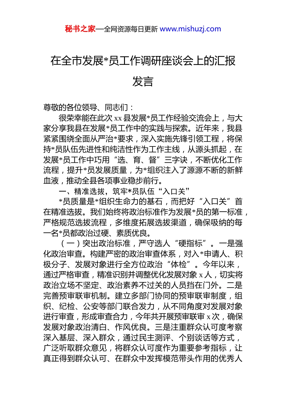 秘书之家—全网资源每日更新 www.mishuzj.com在全市发展*员工作调研座谈会上的汇报发言尊敬的各位领导、同志们:很荣幸能在此次 xx 县发展*员工作经验交流会上,与大家分享我县在发展*员工作中的实践与探索。近年来,我县紧紧围绕全面从严治*要求,深入实施先锋引领工程,将保持*员队伍先进性和纯洁性作为工作主线,从源头抓起,在发展*员工作中巧用“选、育、督”三字诀,不断优化工作流程,提升*员发展质量,为*组织注入了源源不断的新鲜血液,推动全县各项事业稳步前行。一、精准选拔,筑牢*员队伍“入口关”*员质量是*组织生命力的基石,而把好“入口关”首在精准选拔。我们始终将政治标准作为发展*员的第一标准,严格规范选拔流程,多维度拓展选拔渠道,确保吸纳的每一名*员都政治过硬、素质优良。(一)突出政治标准,严守选人“硬指标”。一是强化政治审查。构建严密的政治审查体系,对入*申请人、积极分子、发展对象进行全方位政治“体检”。今年以来,通过严格审查,精准识别并调整优化发展对象 x 人,切实将政治立场不坚定、政治素养不过关的人员挡在门外。二是完善预审联审机制。建立多部门协同的预审联审制度,组织、纪检、公安等部门联合发力,从不同角度对发展对象进行审查,形成审查合力,今年共开展预审联审 x 次,确保发展对象政治清白、作风优良。三是注重群众认可度考察深入基层、深入群众,通过民主测评、个别谈话等方式,广泛听取群众意见,将群众认可度作为重要参考指标,让真正得到群众认可、在群众中发挥模范带头作用的优秀人秘书之家—全网资源每日更新 www.mishuzj.com员进入*员队伍,今年发展对象群众满意度测评平均得分达x 分以上。(二)聚焦重点群体,拓宽选人“新视野”。一是挖掘致富能手资源。着眼乡村振兴战略,深入农村基层,摸排有技术、有思路、能带动群众致富的能手,将其纳入发展视野,今年已从致富能手中发展*员 x 人,为农村产业发展注入强劲动力。二是关注外出务工经商及返乡创业人员主动与外出务工经商人员和返乡创业人员建立联系,了解其思想动态和工作情况,吸引其中的优秀分子向*组织靠拢,今年通过这种方式发展*员 x 人,为家乡建设带回新观念、新技术。三是吸纳未就业大学毕业生和产业工人。针对未就业大学毕业生和产业工人群体,加强宣传引导,组织专题培训和实践活动,激发他们的入*热情,今年发展未就业大学毕业生*员 x 人,产业工人*员 x 人,优化了*员队伍结构。(三)主动出击揽才,变“被动等”为“主动寻”。一是组织力量深入摸排。发动支部委员、*小组组长深入各行业、各领域,通过入户走访、召开座谈会等形式,广泛收集优秀年轻人员信息,建立涵盖各方面人才的“优秀人员信息库”,目前已入库人员达 x 人。二是开展思想引导工作。对信息库中的人员,通过定期沟通、宣传*的政策等方式,增强他们对*的认识和向往,今年共开展思想引导活动x 次,参与人员达 x 人次。三是提供实践历练平台。为有入*意愿的人员提供参与基层治理、志愿服务等实践机会,让他们在实践中提升能力、锤炼*性,今年组织 x 名人员参与实践活动,已有 x 人递交入*申请书。二、系统培育,锻造*员成长“助推器”*员的成长离不开系统全面的培育。我们坚持政治素养与实践能力齐抓,通过丰富培育形式、强化帮带指导、注重实践锻炼,为*员成长提供全方位支持,助力其快速成长为合格*员。秘书之家—全网资源每日更新 www.mishuzj.com(一)深化理论武装,夯实思想根基。一是开展专题领学活动。围绕**************思想,组织开展专题领学活动 x 场次,由领导干部、专家学者等进行深入解读,覆盖入*积极分子和发展对象 x 人次,让*的创新理论入脑入心。二是强化*课宣讲效果。邀请*校教师、优秀*员等组成*课宣讲团,深入基层开展*课宣讲,今年共宣讲 x 场次,用生动案例和通俗易懂的语言,让*的理论知识更易被接受,增强入*积极分子和发展对象的政治认同。三是推进集中培训常态化。定期举办入*积极分子和发展对象集中培训班,系统学习*的理论、*史*章等知识,今年已举办培训班 x 期,培训人员达 x 人,实现政治理论教育常...